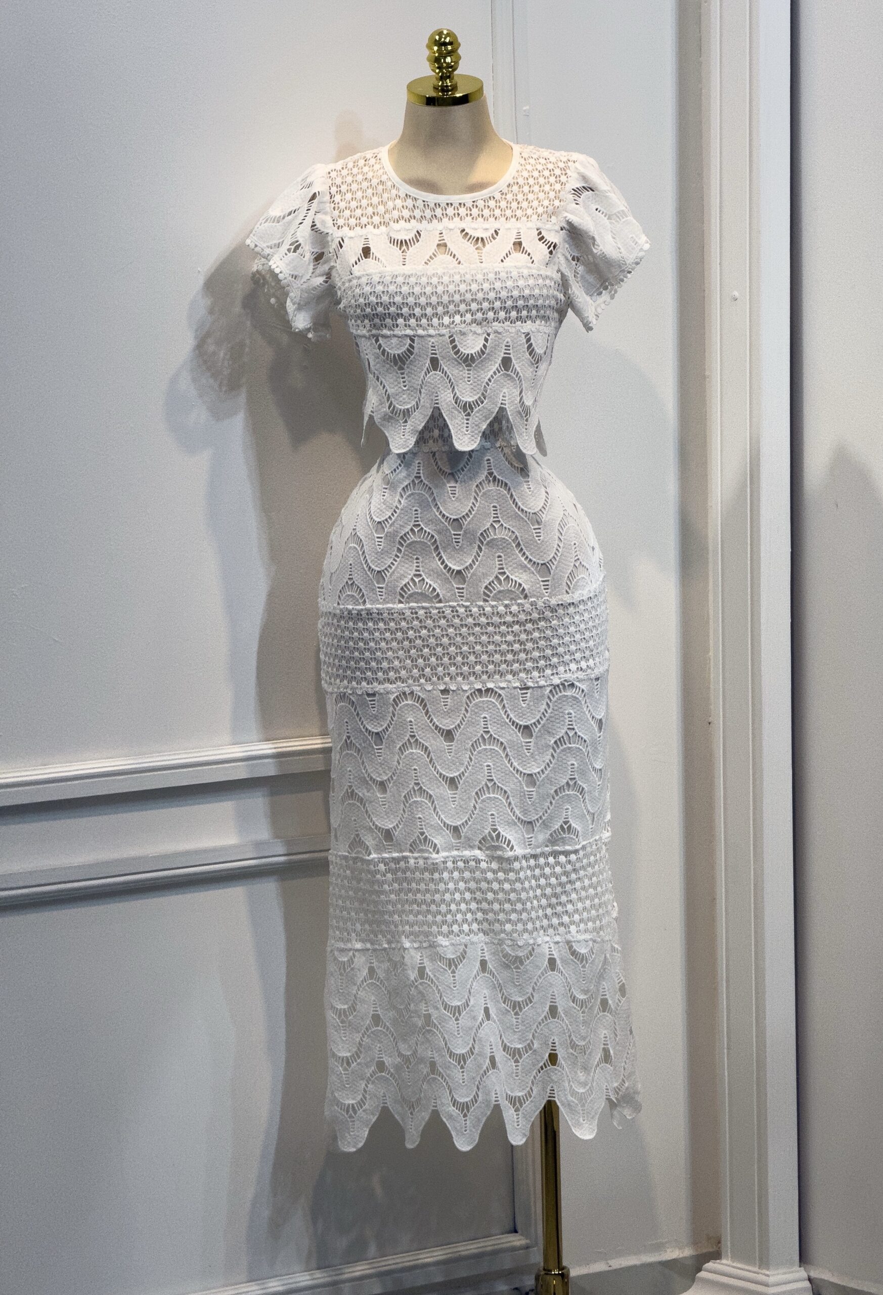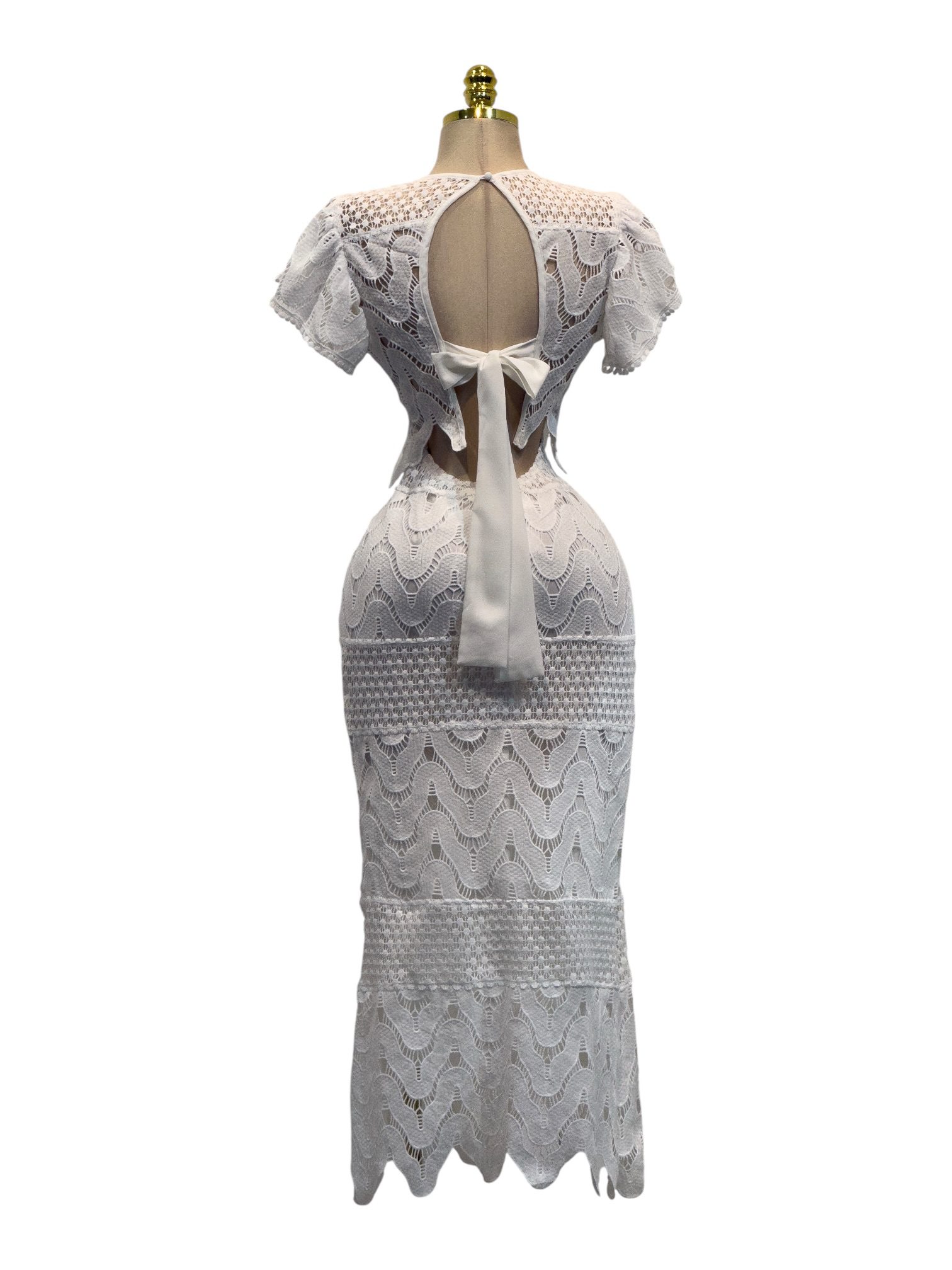 Vestido midi en tono blanco con delicado encaje calado. Diseño ajustado con manga corta y cuello redondo, detalles de ondas y transparencias sutiles que aportan un toque romántico. Femenino y elegante, ideal para eventos de día o celebraciones especiales.