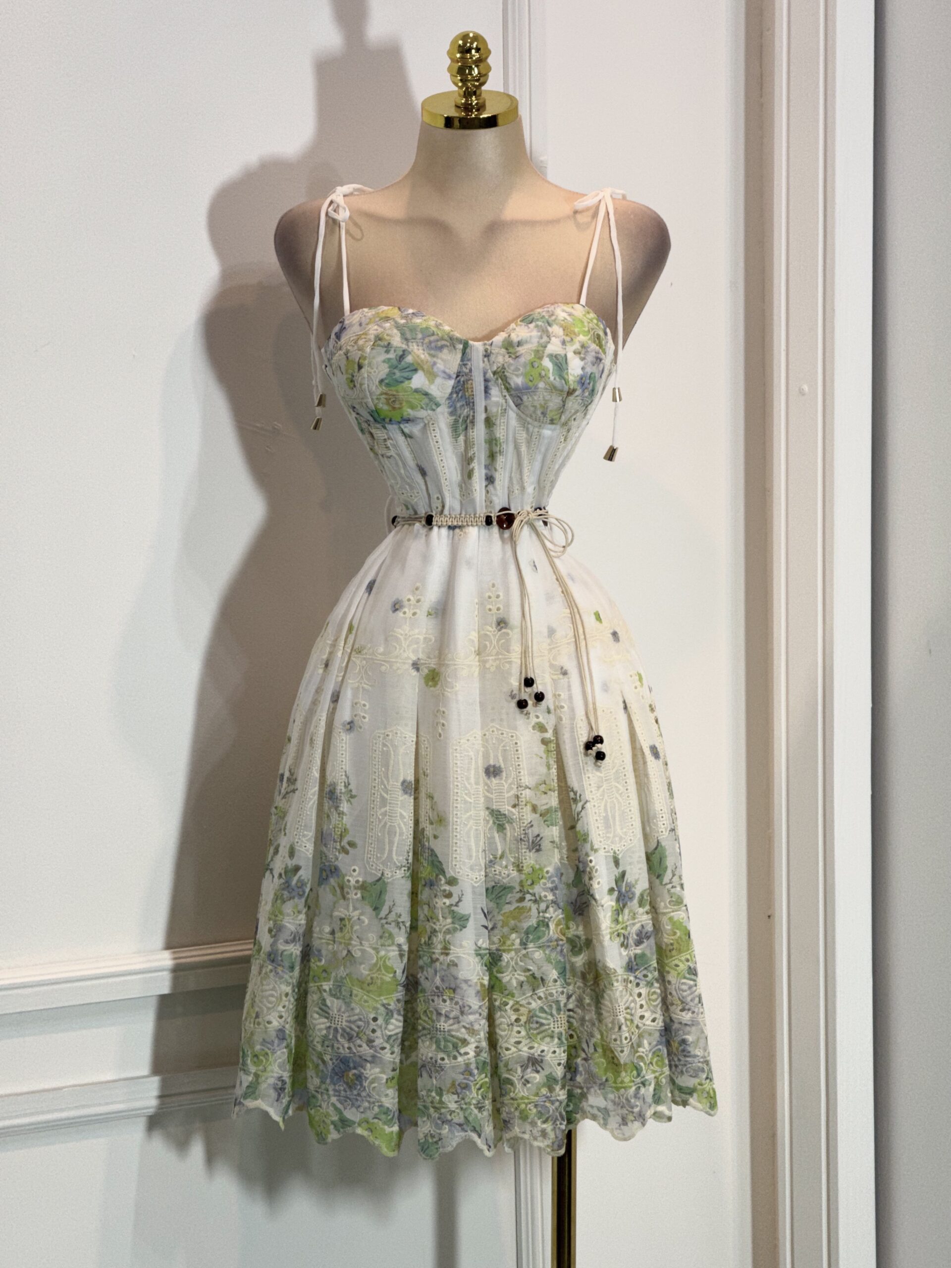 Vestido largo con delicado estampado floral en tono blanco, de inspiración romántica y fresca. Presenta escote tipo corazón con estructura tipo corset que realza el busto y define la cintura de forma favorecedora. Incorpora tirantes delgados ajustables con lazo, que aportan un detalle femenino y delicado. La cintura se acentúa con un fino cordón decorativo, mientras que la falda larga de caída fluida con bordados tipo encaje aporta movimiento y un acabado etéreo. Ideal para eventos de día, bodas al aire libre, celebraciones especiales y ocasiones donde se busca un look romántico, elegante y natural.