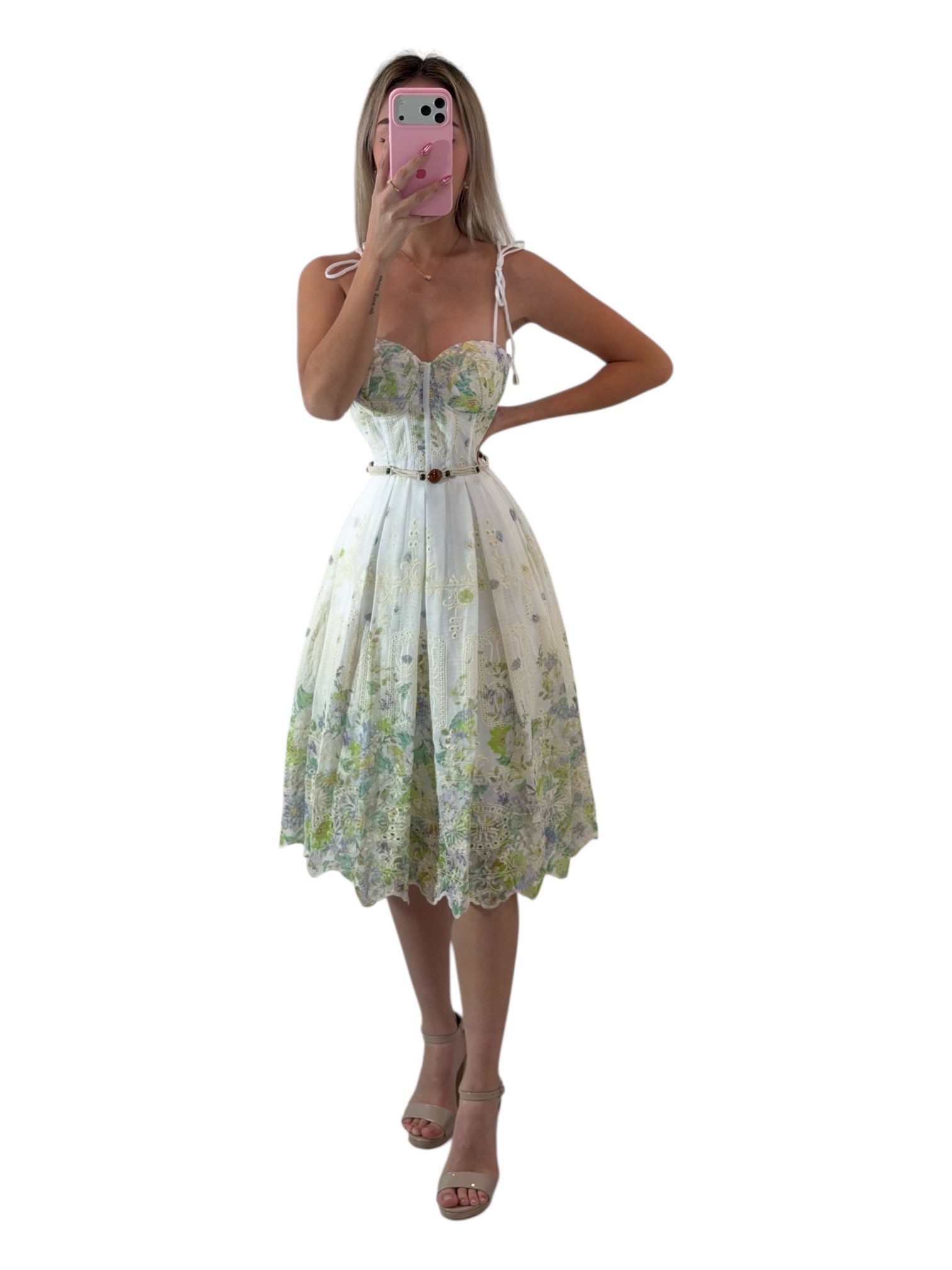 Vestido Midi Blanco Floral Tipo Corset Con Tirantes Ajustables Y Falda Amplia