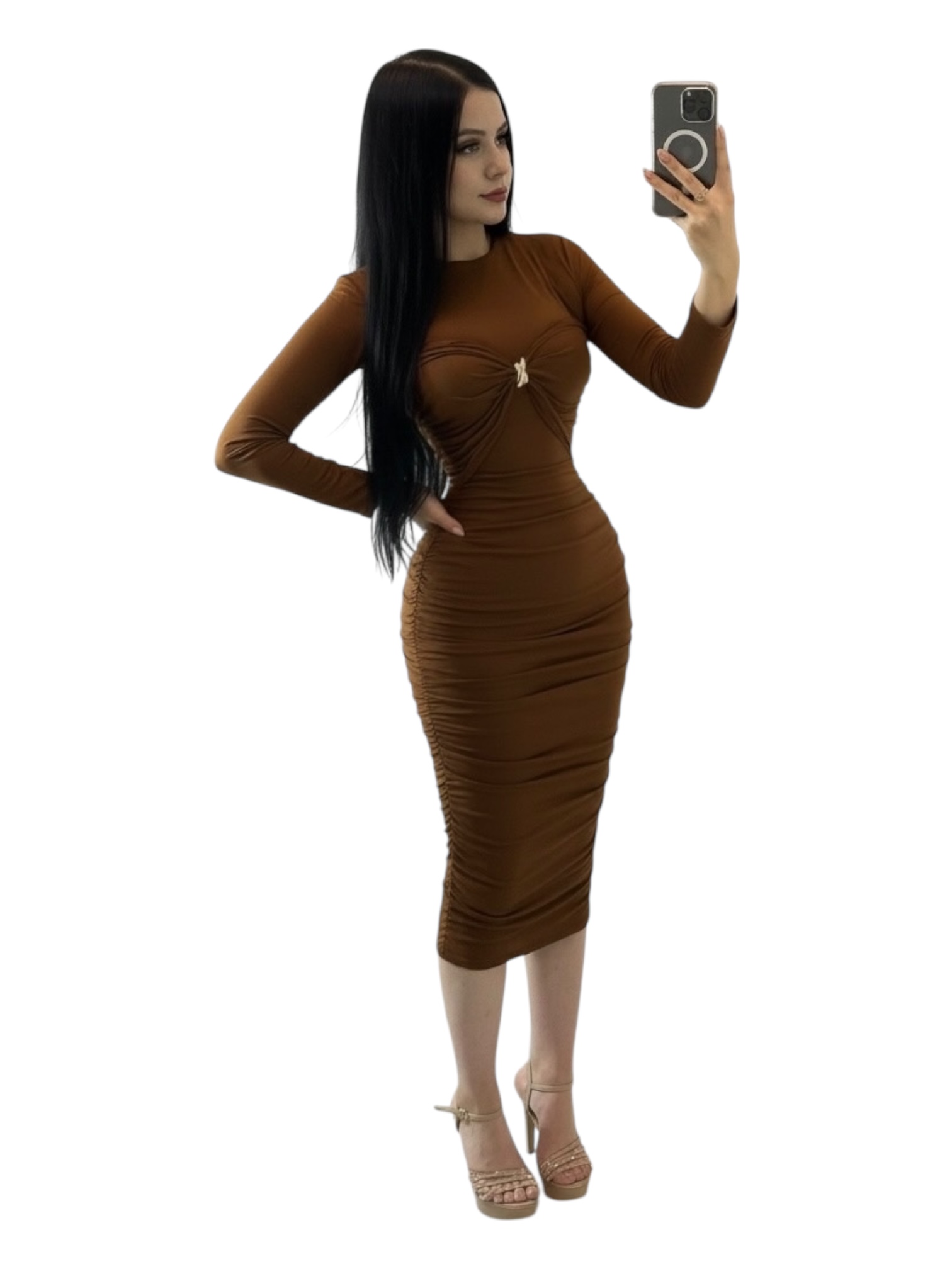 Vestido midi en tono café con un diseño elegante, femenino y perfectamente estilizado conforme a la imagen. Presenta cuello redondo y mangas largas que aportan un acabado sofisticado y equilibrado. El busto incorpora un delicado frunce central con broche metálico decorativo, creando un efecto drapeado que realza la zona superior y aporta un toque distintivo.