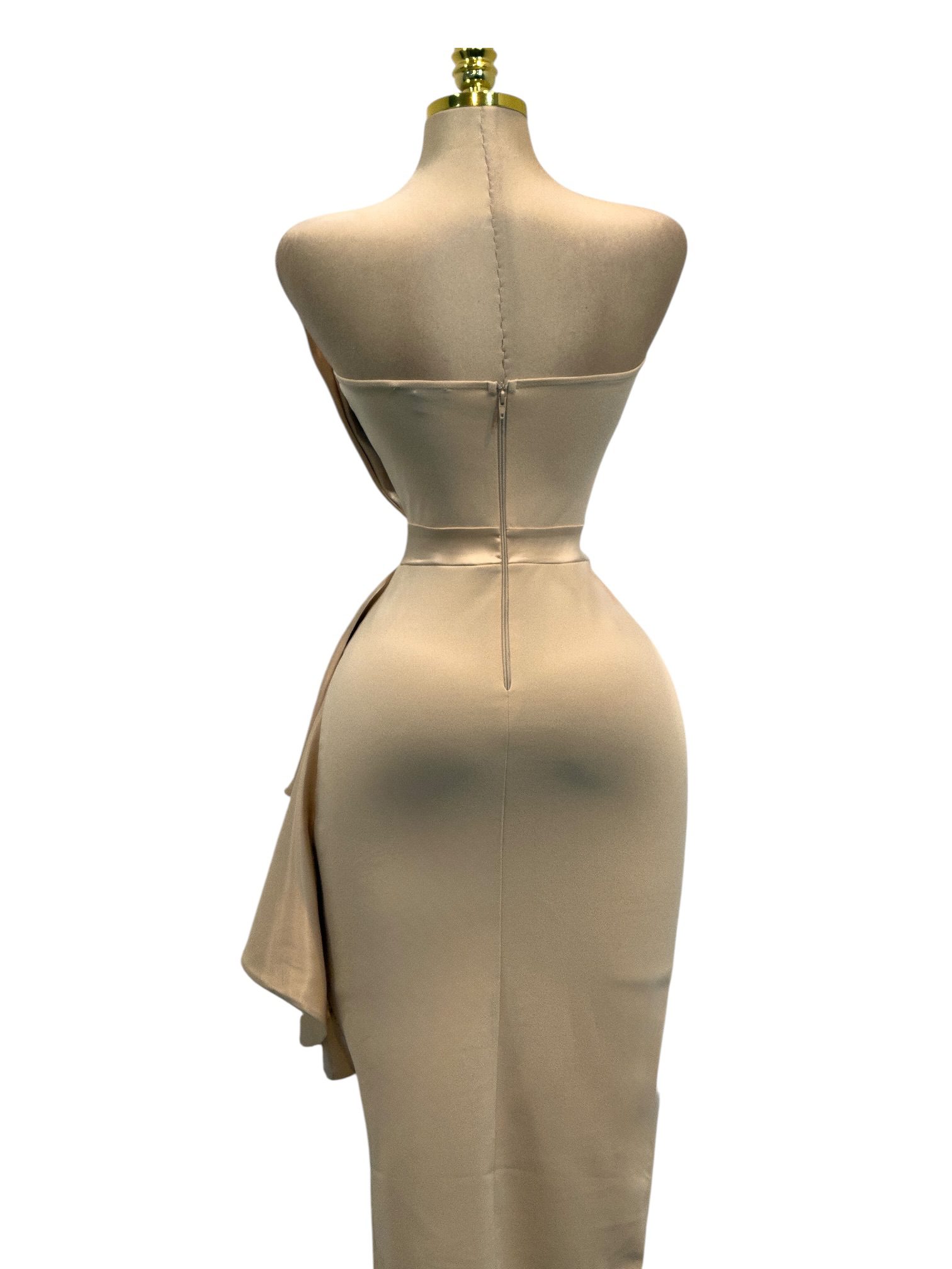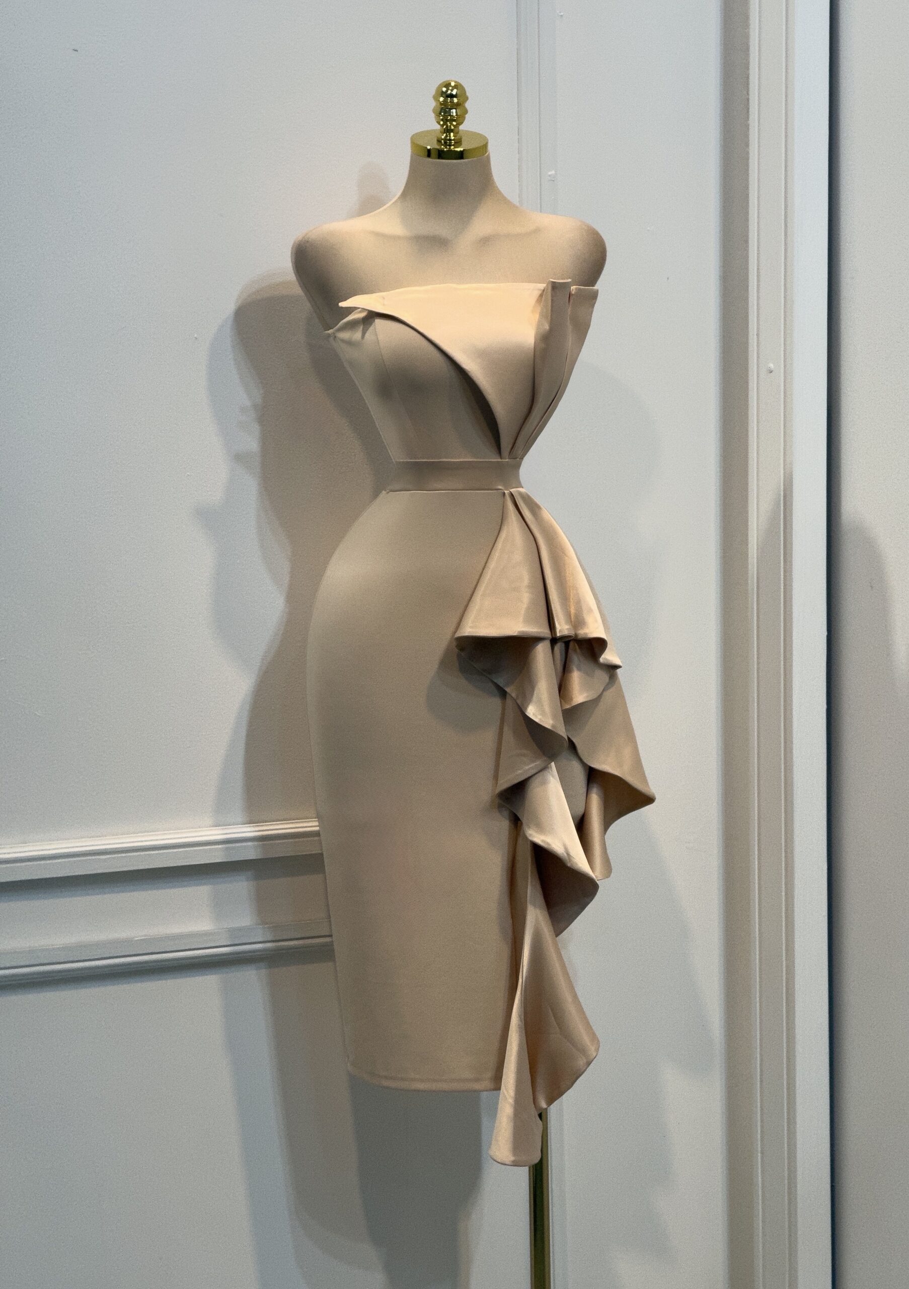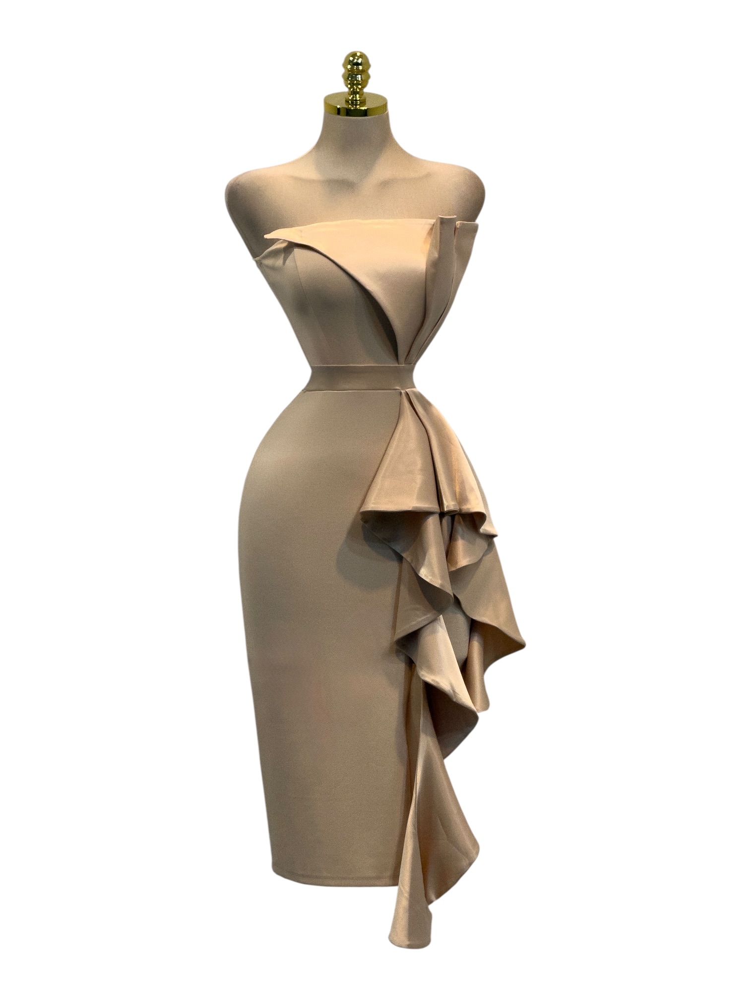 Vestido midi en elegante tono champagne con escote palabra de honor y diseño estructurado que realza la silueta. Presenta detalle de volantes laterales en cascada que aporta movimiento y sofisticación. Ideal para eventos formales, cenas especiales o celebraciones elegantes.