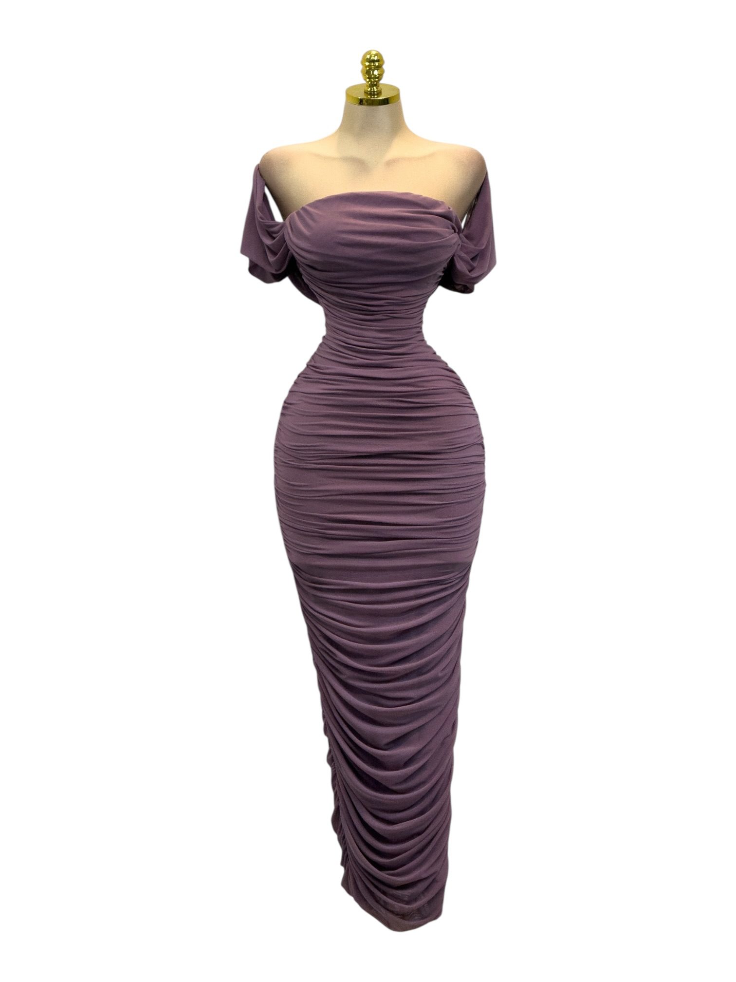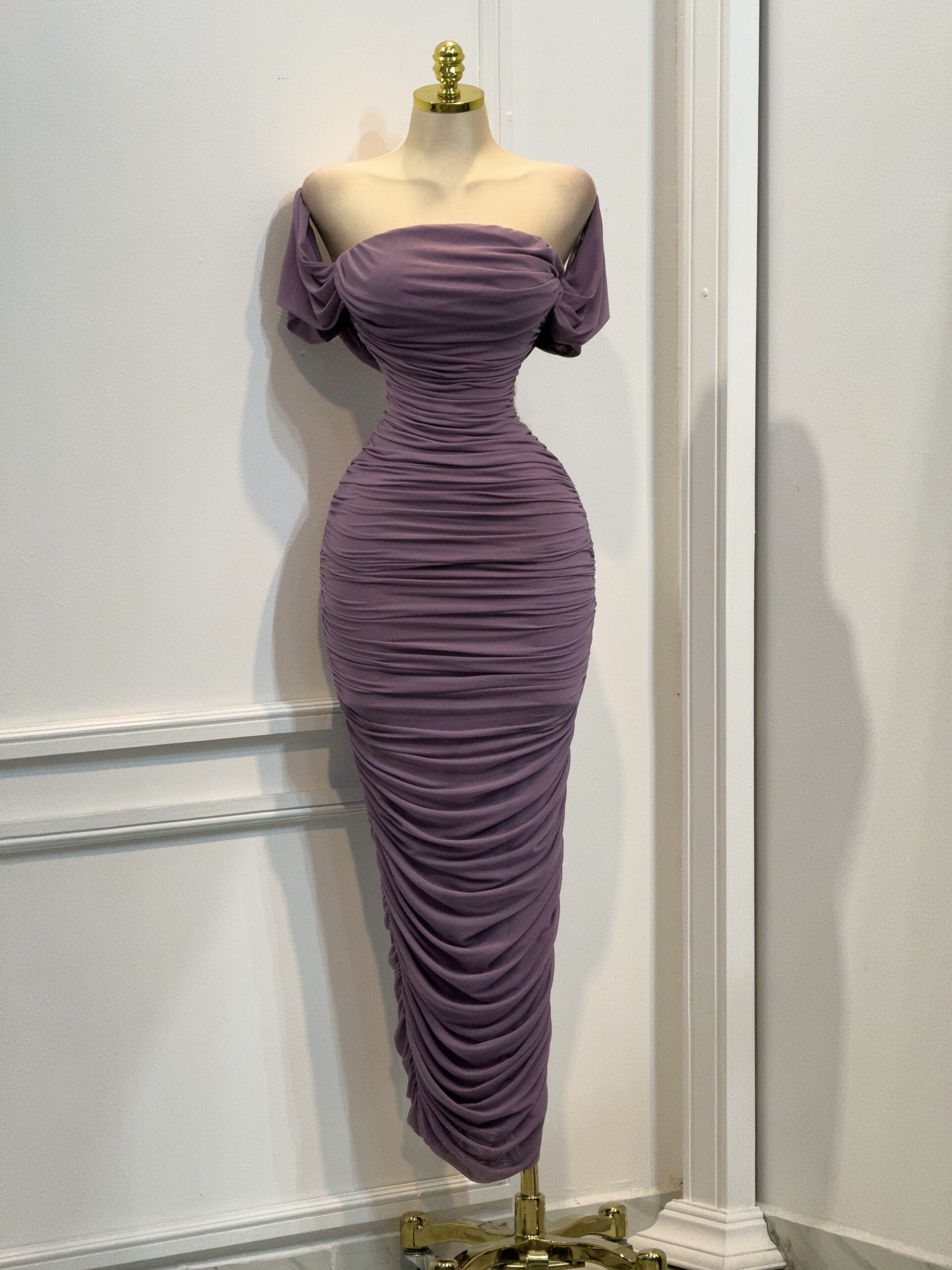 Vestido en tono morado con escote off shoulder y mangas caídas. Diseño entallado con drapeado en todo el cuerpo que estiliza la silueta. Falda ajustada con acabado suave. Ideal para eventos formales o de noche.