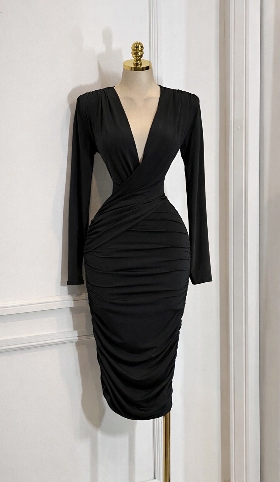 Vestido midi negro con escote profundo en V y mangas largas. Presenta drapeado cruzado en la cintura que estiliza la silueta. Elegante y sofisticado, ideal para eventos formales y noches especiales.