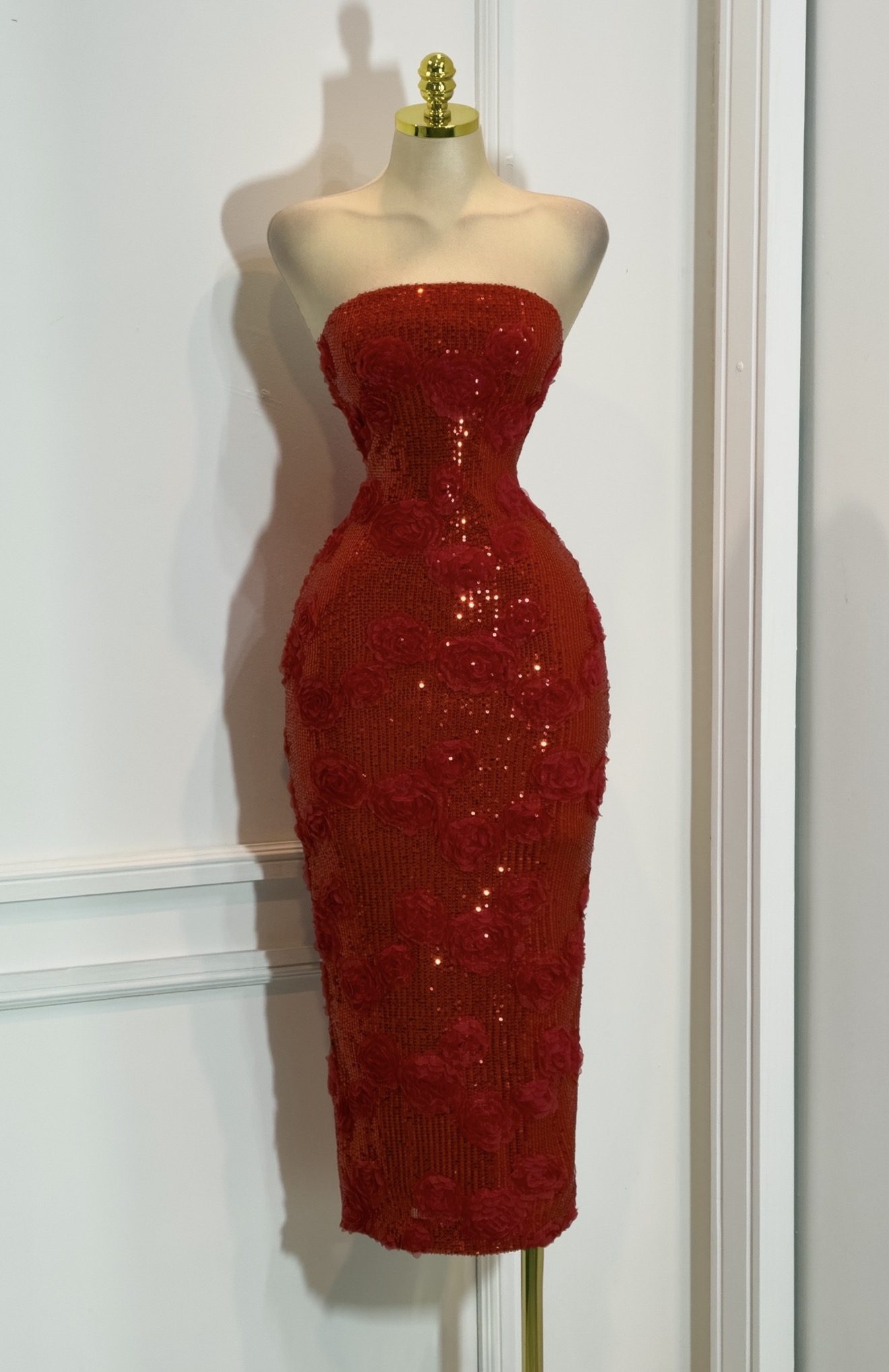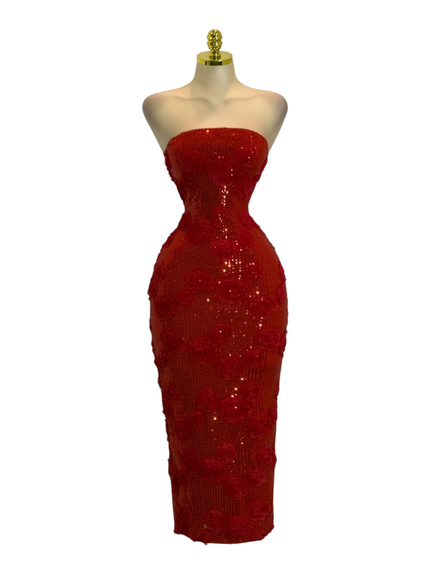 Vestido Midi Rojo Con Aplicaciones Florales En Relieve Y Brillos Sutiles