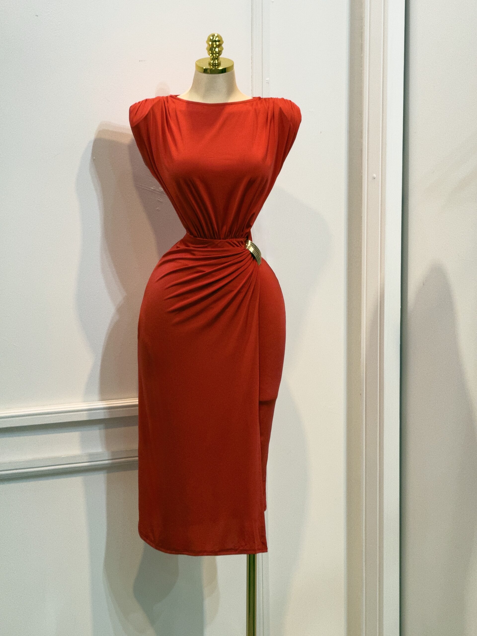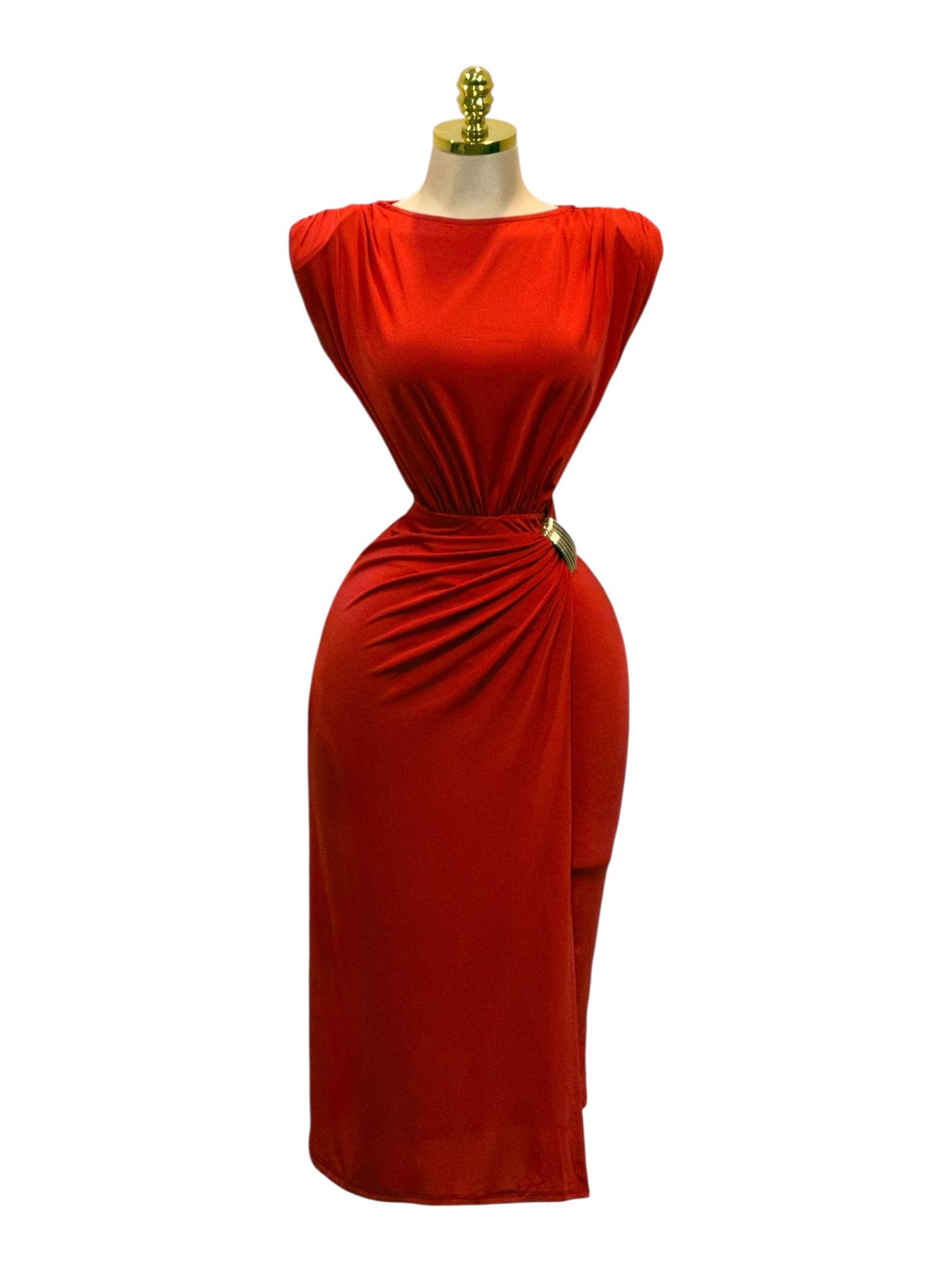 Vestido midi en color rojo con diseño sin mangas y cuello cerrado. Presenta drapeado lateral que estiliza la figura y detalle metálico en la cintura que aporta un toque elegante. Corte ajustado con caída recta, ideal para eventos formales o salidas de noche.