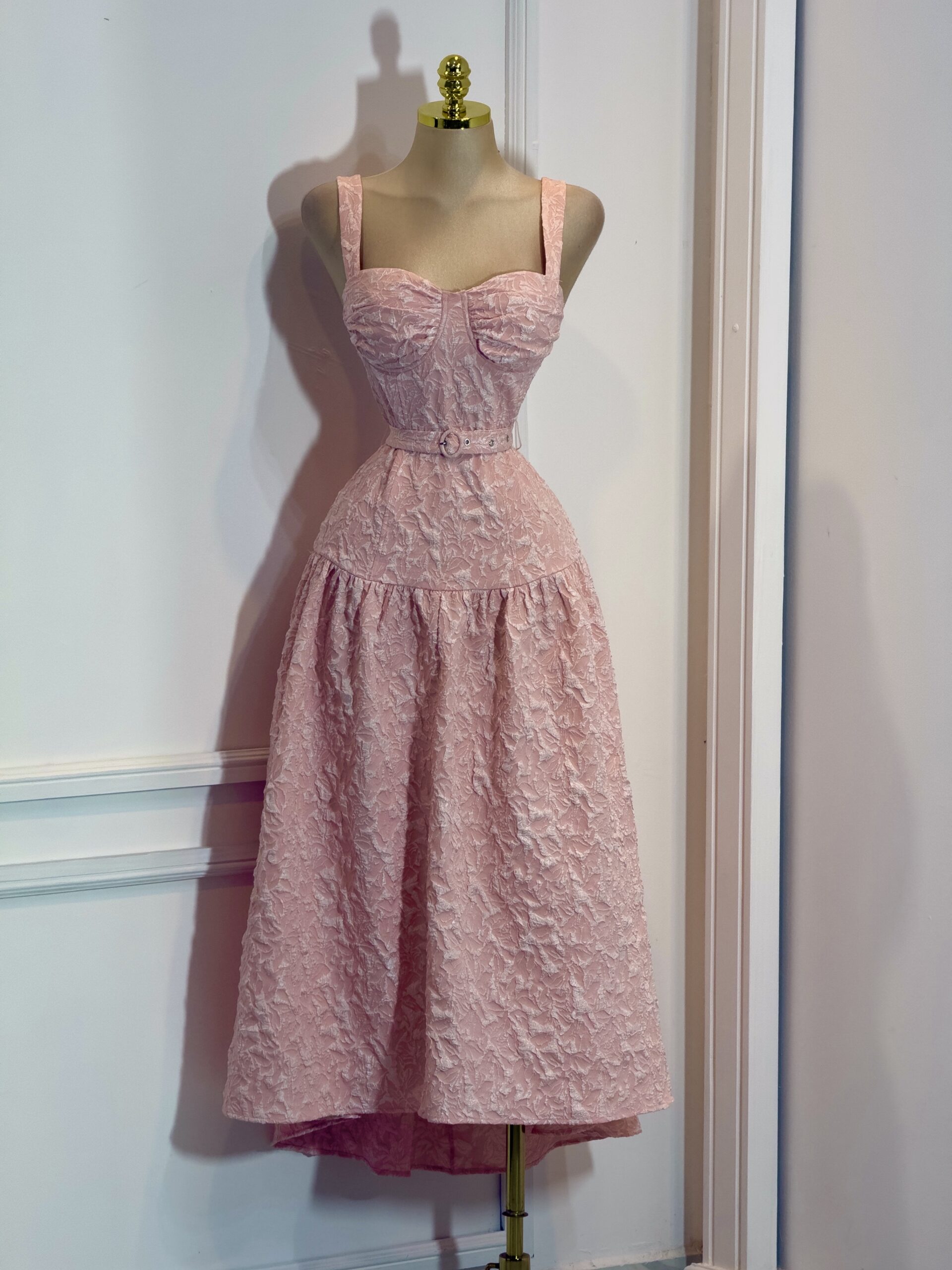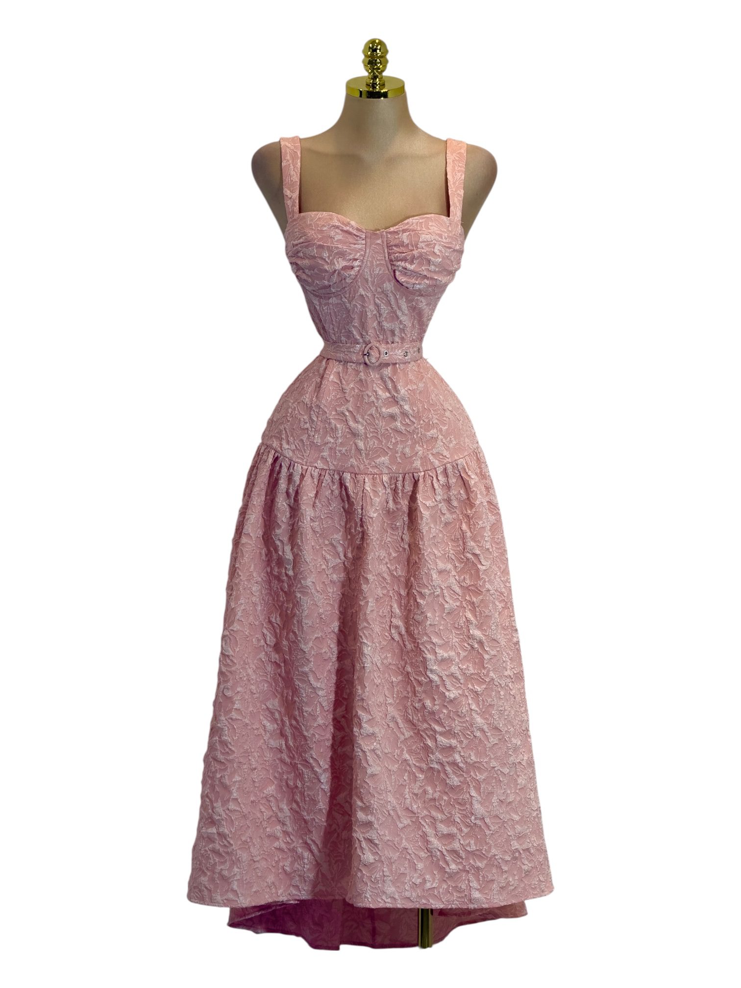 Vestido midi en tono rosa con textura floral. Presenta tirantes anchos, escote corazón y corte entallado que define la silueta. Incluye cinturón del mismo material y falda con ligero volumen. Ideal para eventos, fiestas y ocasiones especiales.