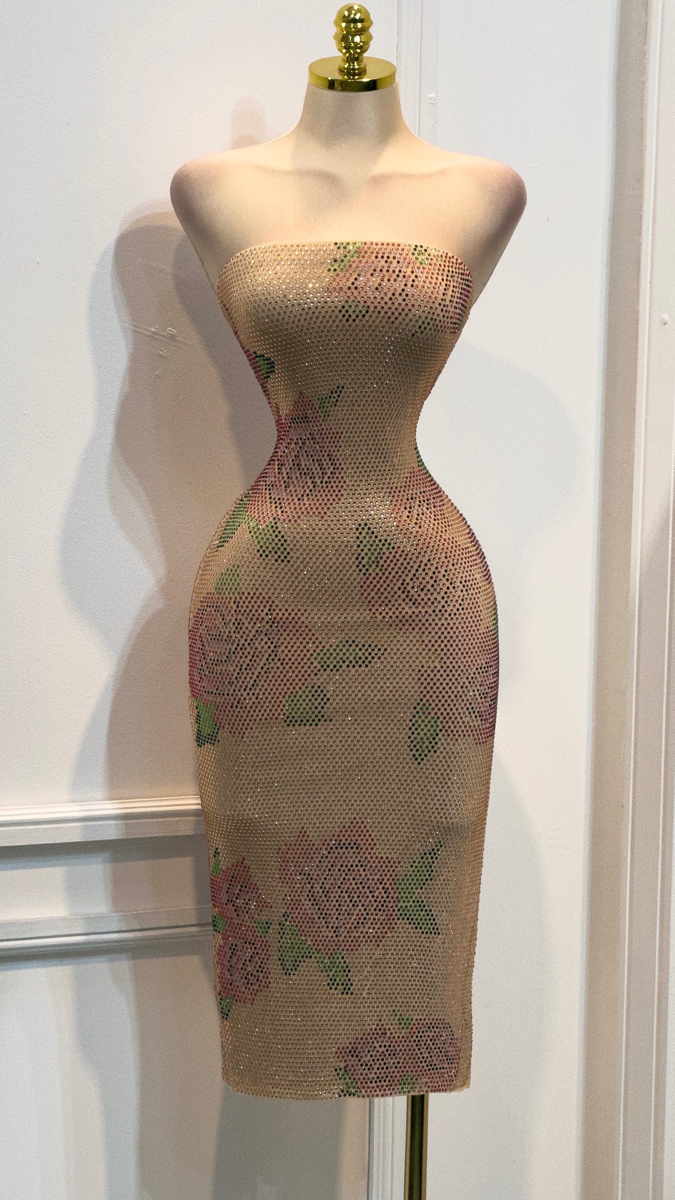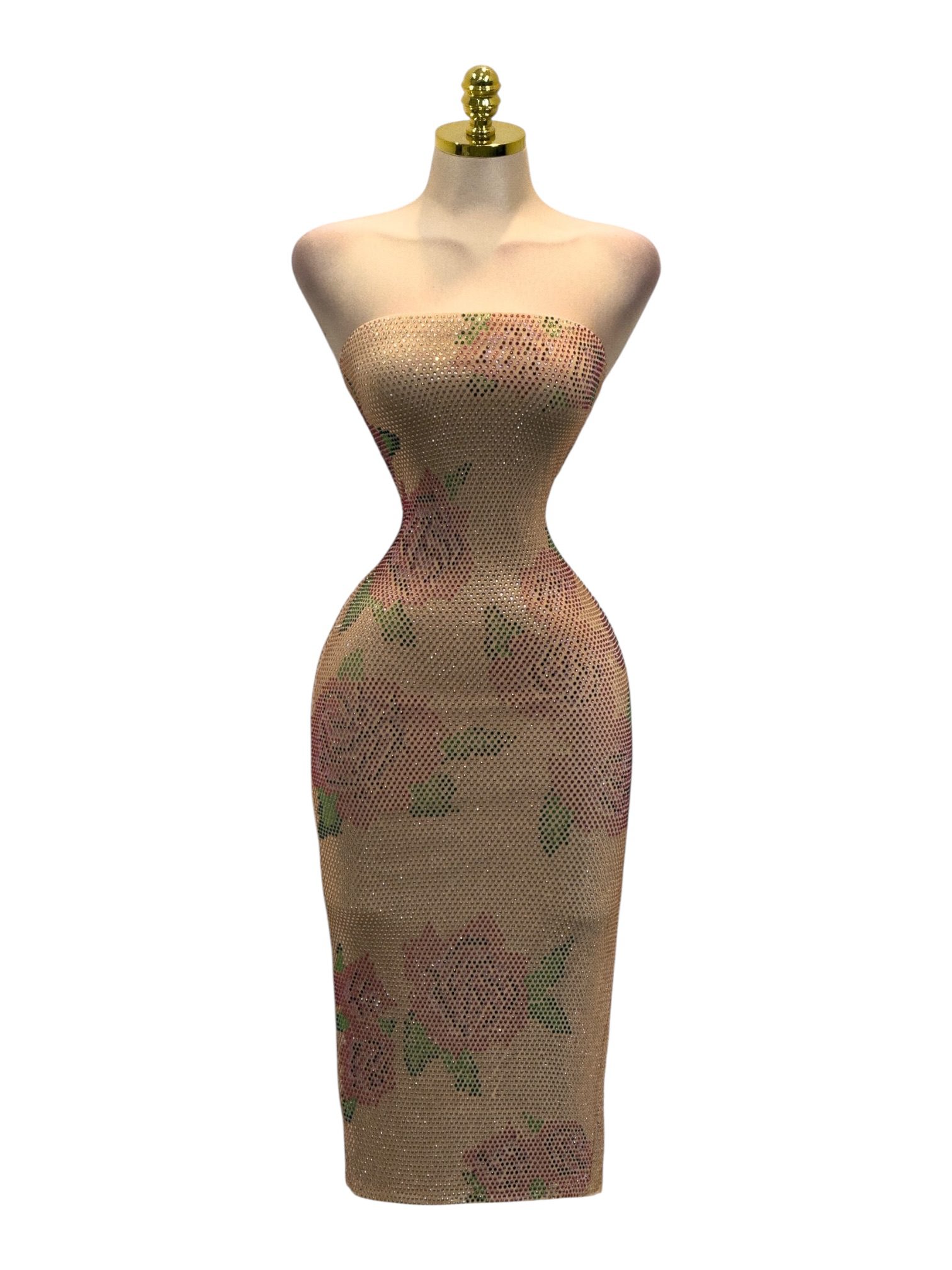 Vestido midi strapless en tono nude con diseño ajustado que realza la silueta. Presenta acabado brillante con delicado estampado floral que aporta un toque sofisticado y femenino. Ideal para eventos especiales o salidas de noche donde quieras destacar con elegancia.