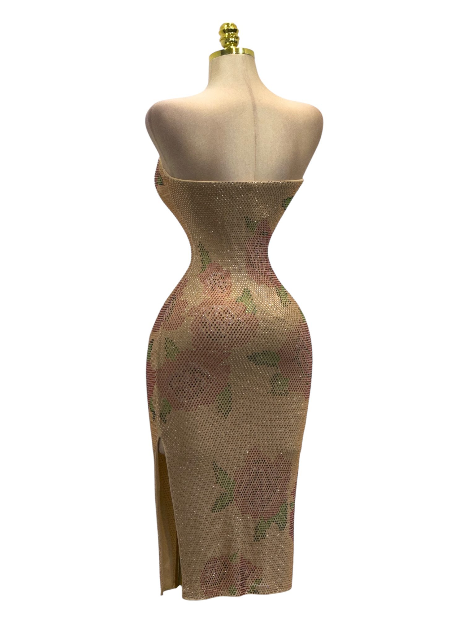Vestido Midi Strapless Nude Con Brillos Y Estampado Floral