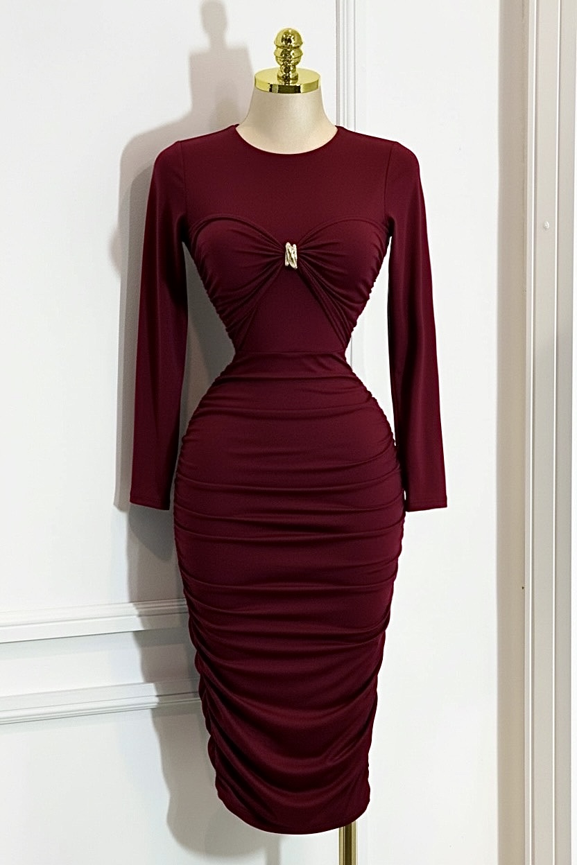 quantity Vestido Midi Vino Con Manga Larga Y Fruncido Central