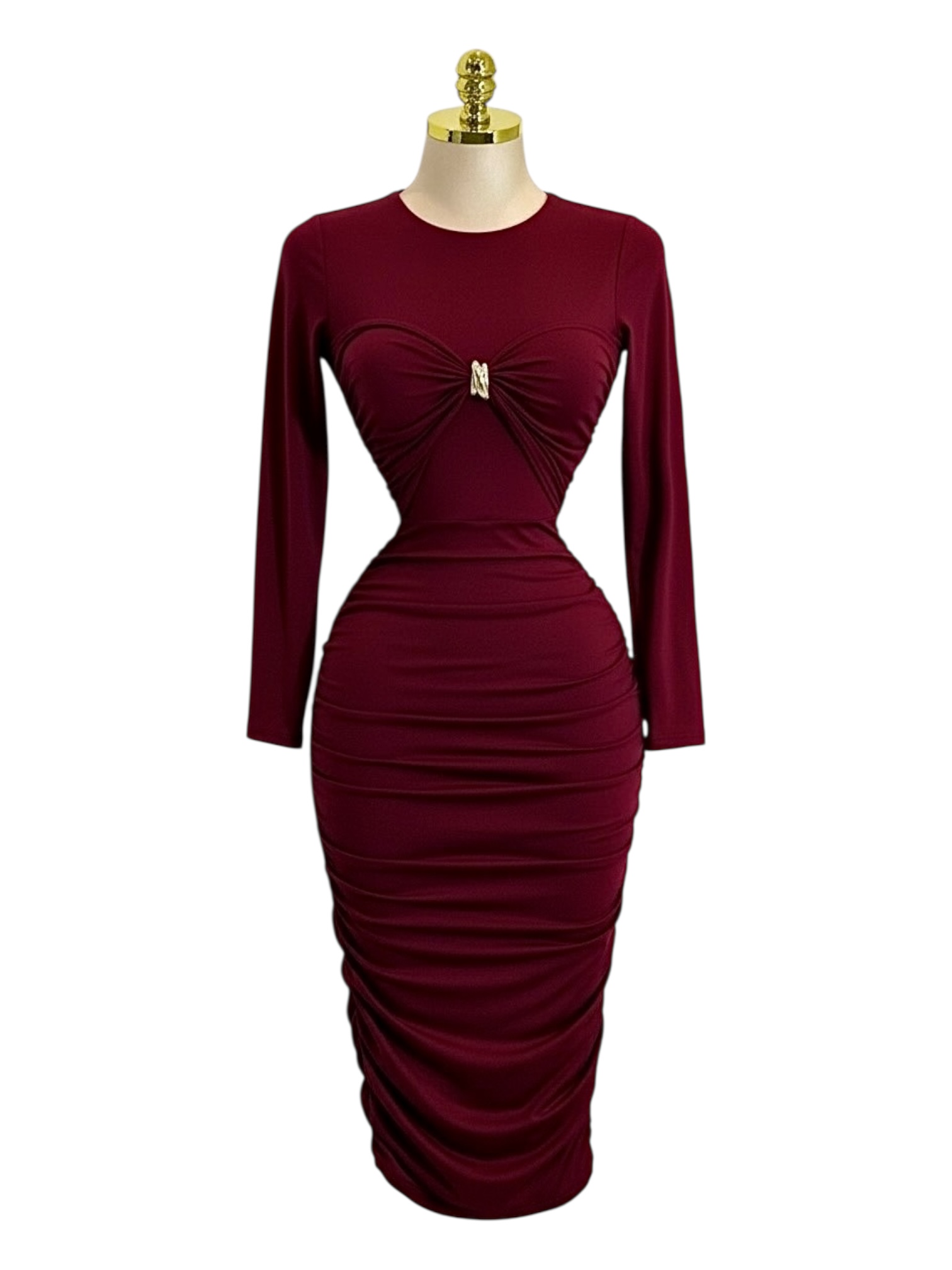 Vestido Midi Vino Con Manga Larga Y Fruncido Central