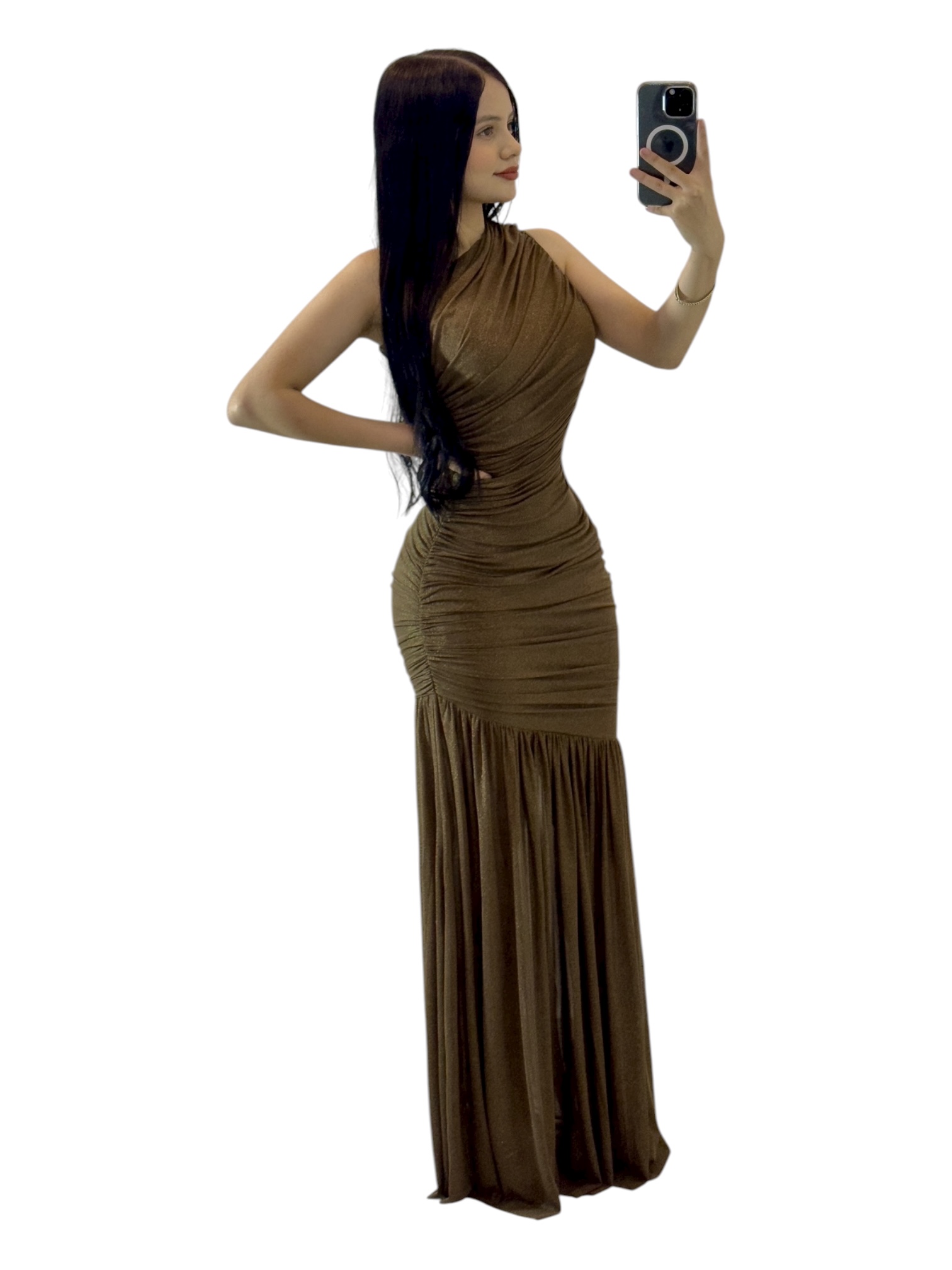 Vestido largo en tono moka que realza la figura con elegancia. Presenta diseño de un solo hombro con drapeado que estiliza la silueta y aporta un aire sofisticado. La falda de corte largo con caída fluida y plisado ligero añade movimiento y distinción. Ideal para cenas, galas o eventos formales donde busques un look moderno, refinado y lleno de presencia.