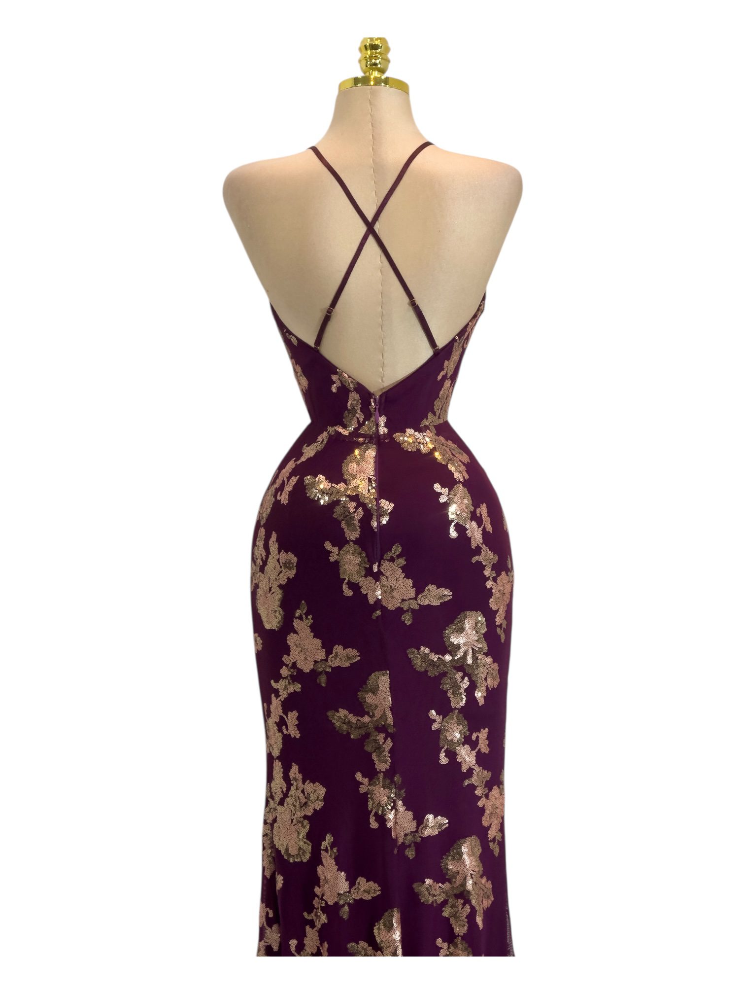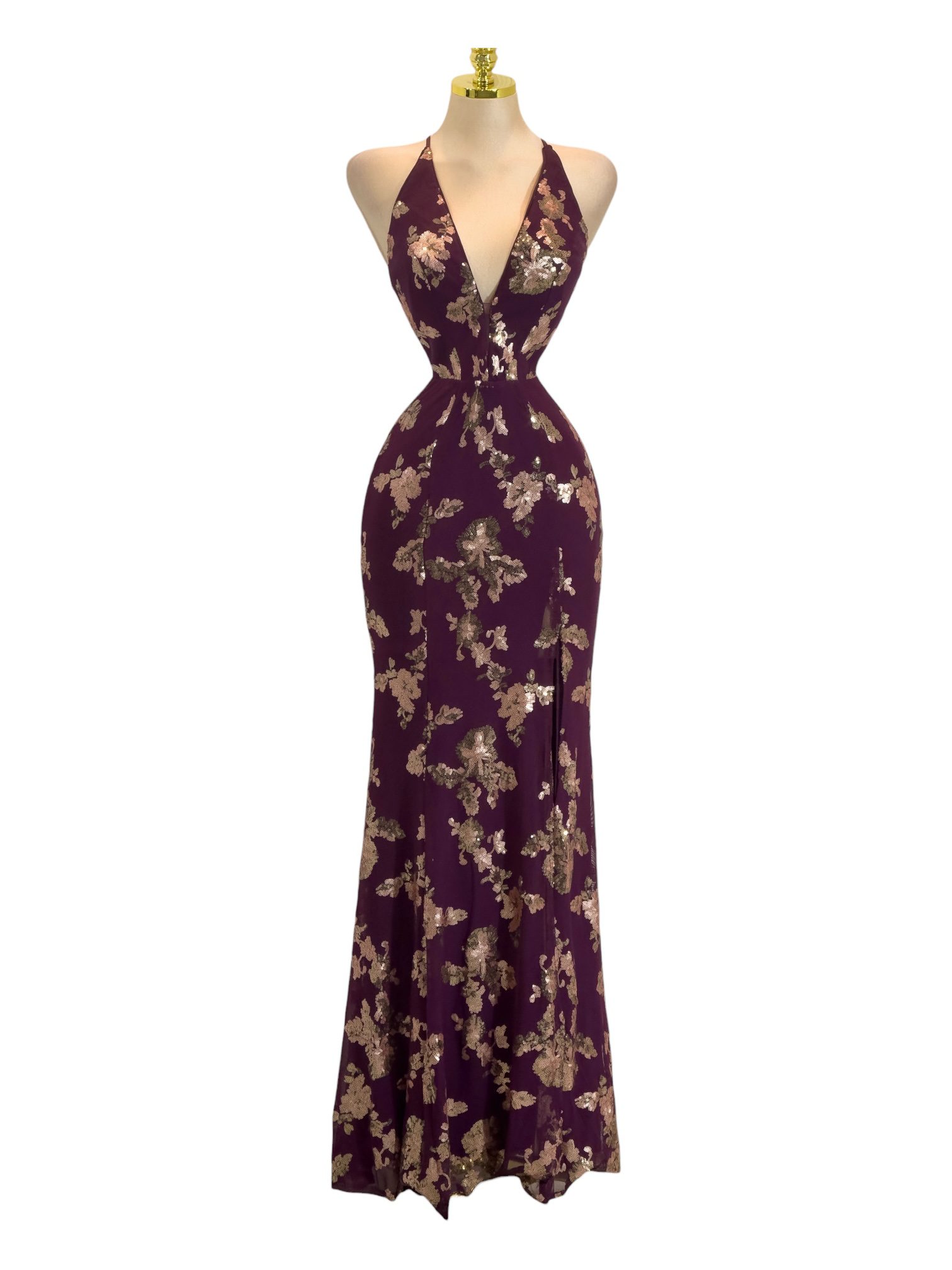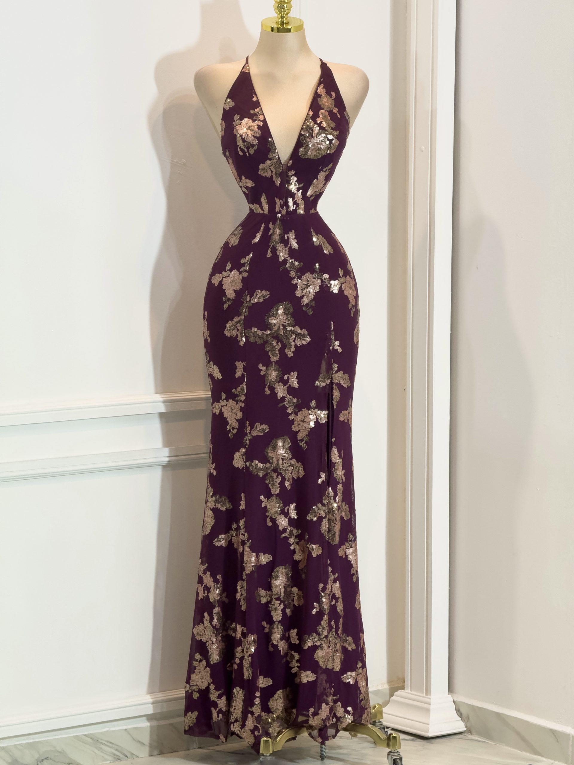 Vestido largo en tono morado con aplicaciones florales en acabado brillante que aportan un efecto glamuroso y sofisticado. Presenta un escote profundo en V que realza el busto y añade un toque sensual, acompañado de tirantes delgados que estilizan la parte superior. El cuerpo entallado define la silueta con elegancia, mientras que la falda larga de caída fluida crea un movimiento delicado y refinado. Una pieza ideal para galas, eventos formales o celebraciones donde busques lucir un look moderno, atractivo y de alto impacto visual.