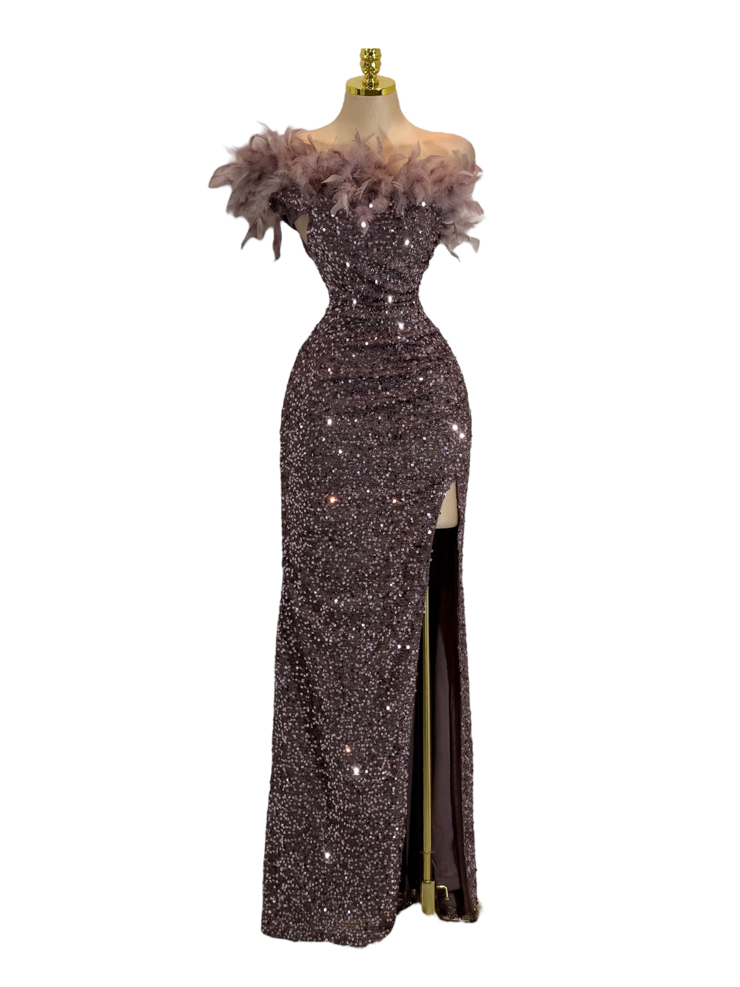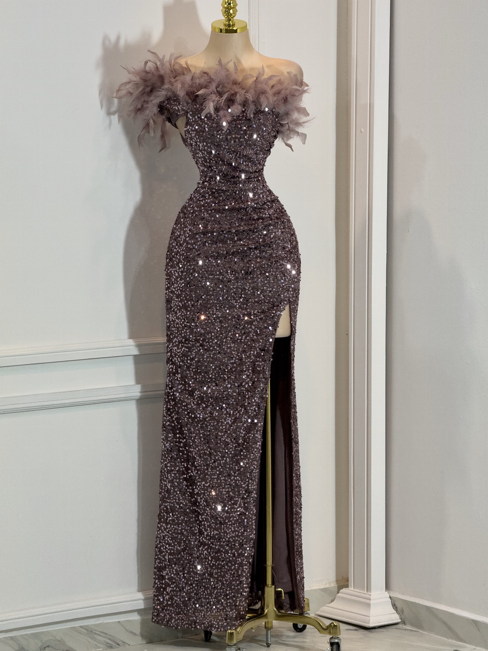 Vestido largo en tono morado cubierto de lentejuelas que aportan un brillo elegante y sofisticado. Presenta escote bardot adornado con delicadas plumas que enmarcan los hombros y añaden un toque de glamour y distinción. El diseño entallado realza la figura, mientras que la abertura lateral en la falda aporta sensualidad y movimiento. Ideal para galas, eventos formales o celebraciones donde busques un look deslumbrante, refinado y lleno de presencia.