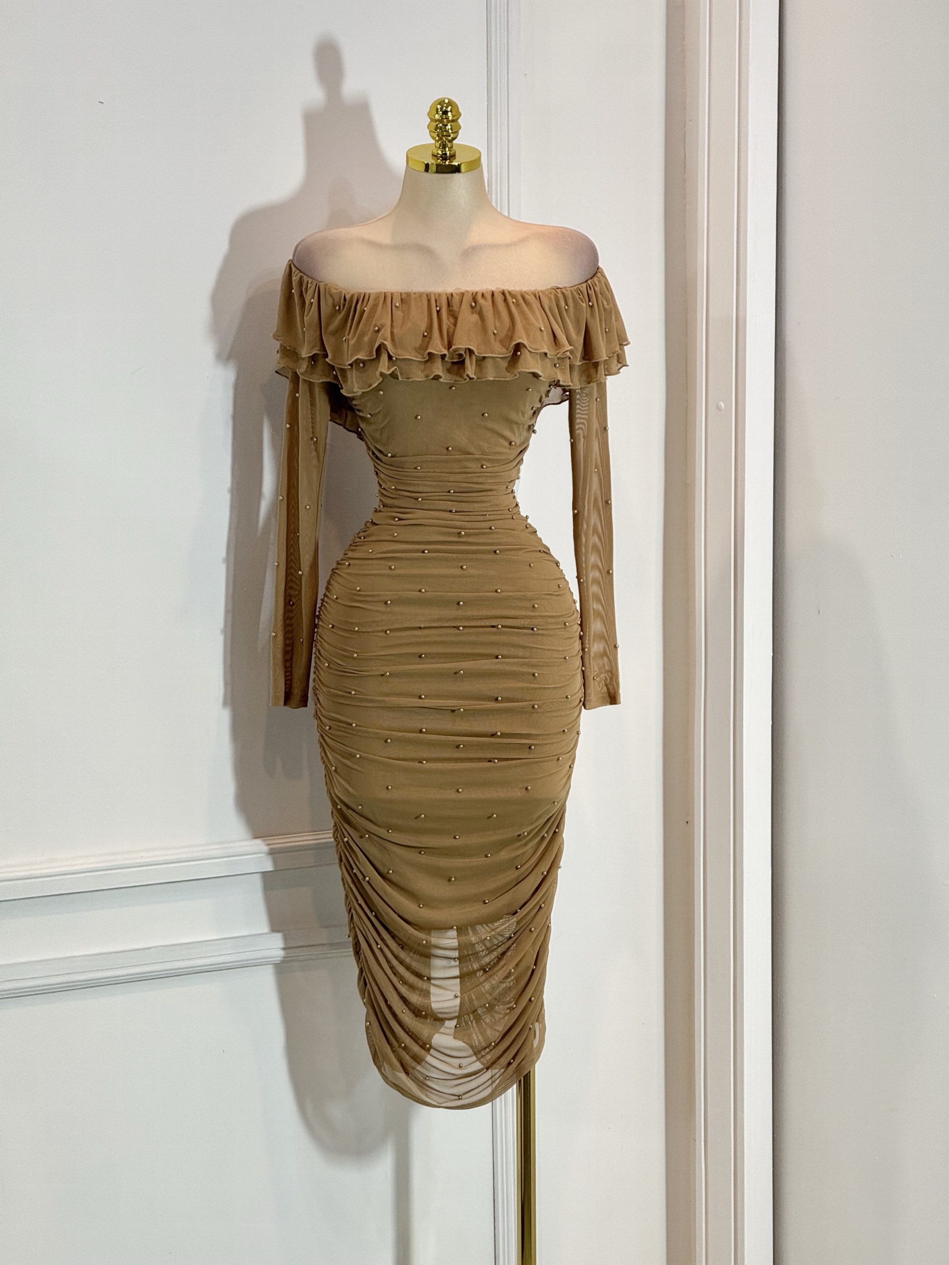 VESTIDO: MIDI MOSTAZA CON ESCOTE BARDOT, VOLANTE Y APLICACIONES DE PERLAS