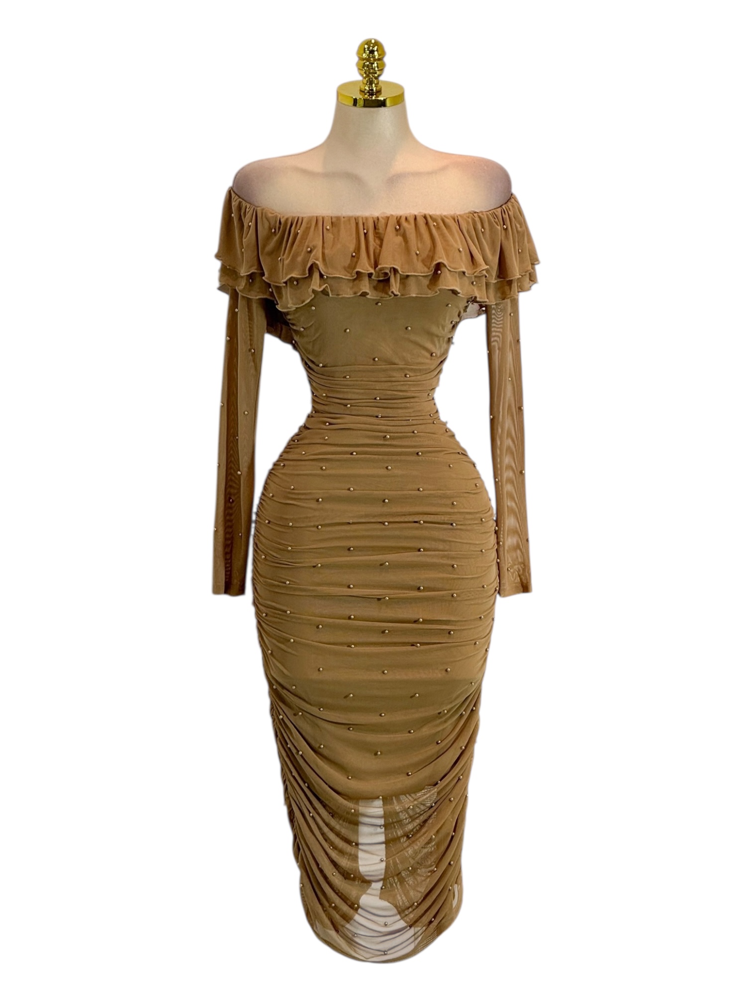 Vestido midi en tono mostaza con malla superpuesta decorada con delicadas aplicaciones de perlas. Presenta escote bardot con detalle de volante que enmarca los hombros y aporta un aire romántico y femenino. El diseño fruncido a lo largo del cuerpo realza la silueta y estiliza la figura, mientras que su longitud midi añade elegancia y equilibrio. Ideal para cocteles, cenas o eventos especiales donde busques un look sofisticado, moderno y lleno de distinción.