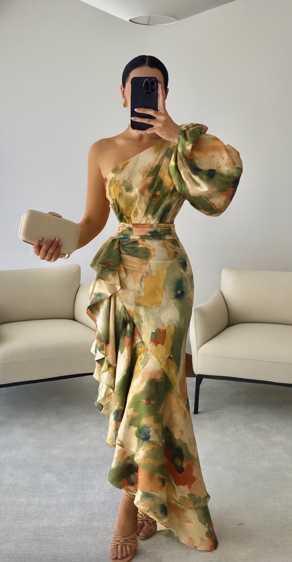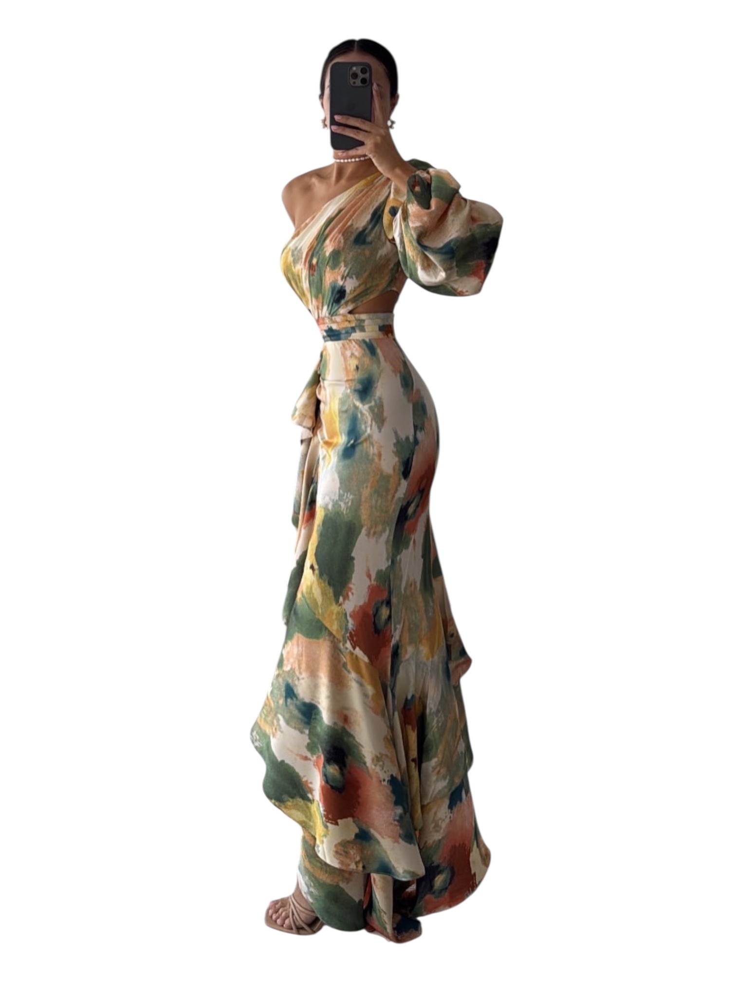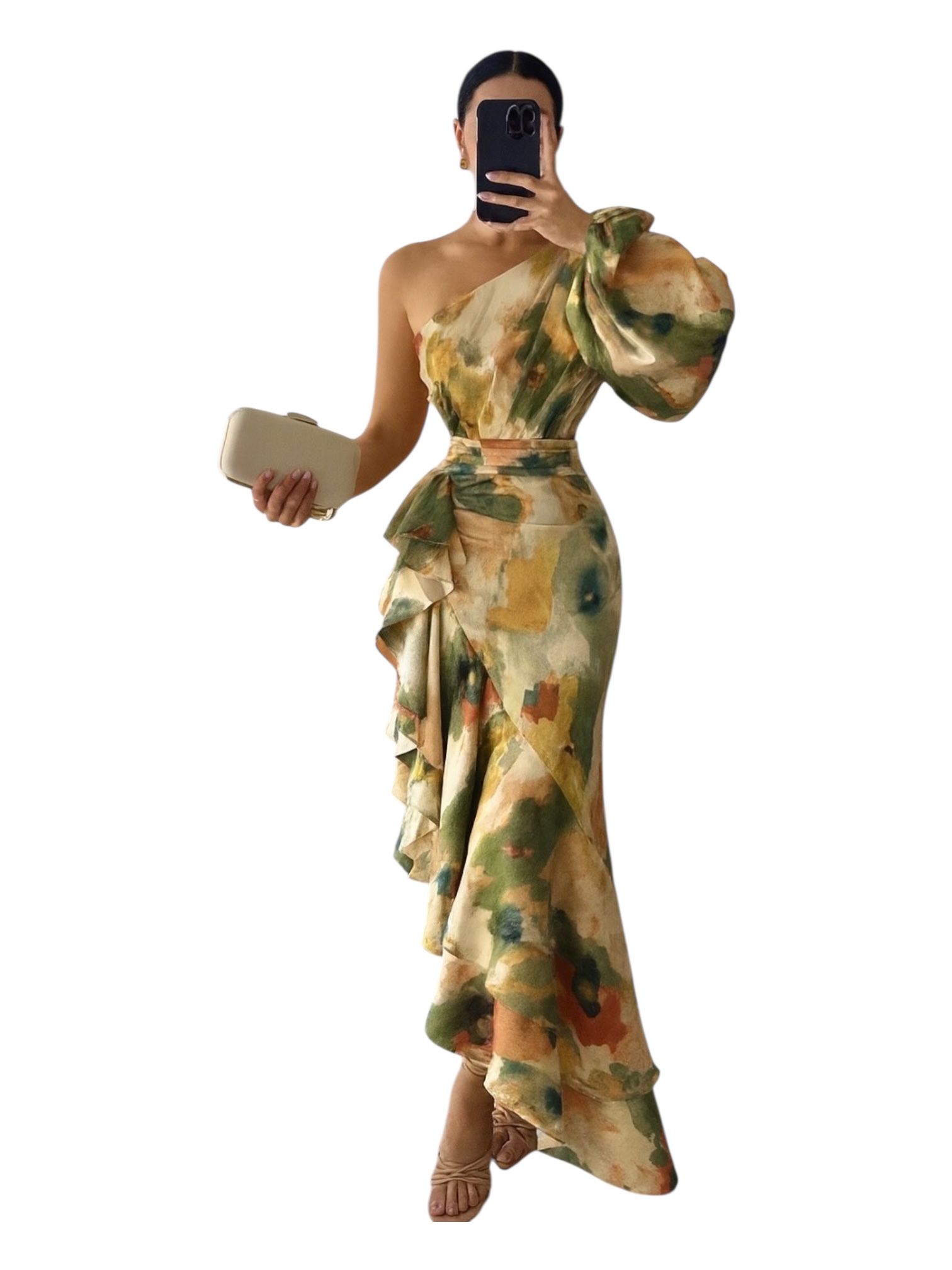 Vestido largo con estampado artístico que aporta un acabado vibrante y elegante. Presenta un escote asimétrico con una sola manga globo que añade volumen y un toque sofisticado. El cuerpo entallado realza la silueta e incluye aberturas laterales sutiles que aportan un detalle moderno. La falda larga en capas con caída fluida crea movimiento y un efecto etéreo. Ideal para eventos especiales, celebraciones o noches donde busques un look llamativo, chic y de alto impacto visual.