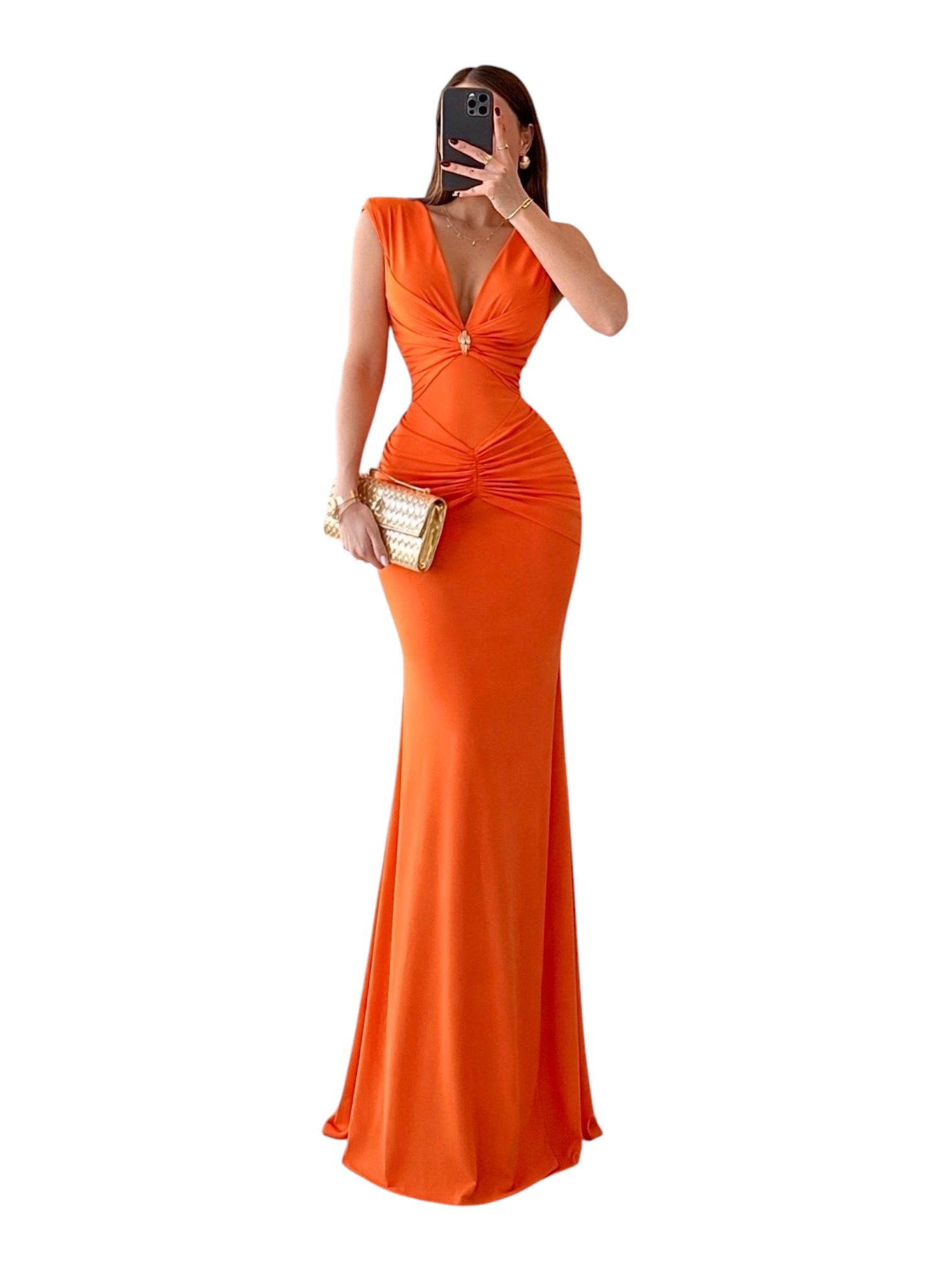 Vestido Naranja Con Escote Pronunciado Y Corte Sirena Ajustado