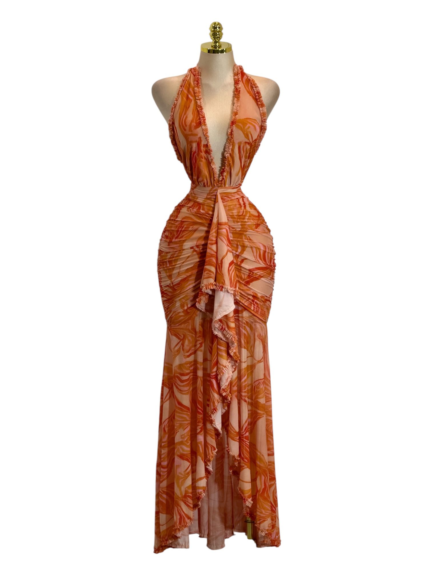VESTIDO: LARGO ESTAMPADO NARANJA CON HALTER Y FRUNCIDO