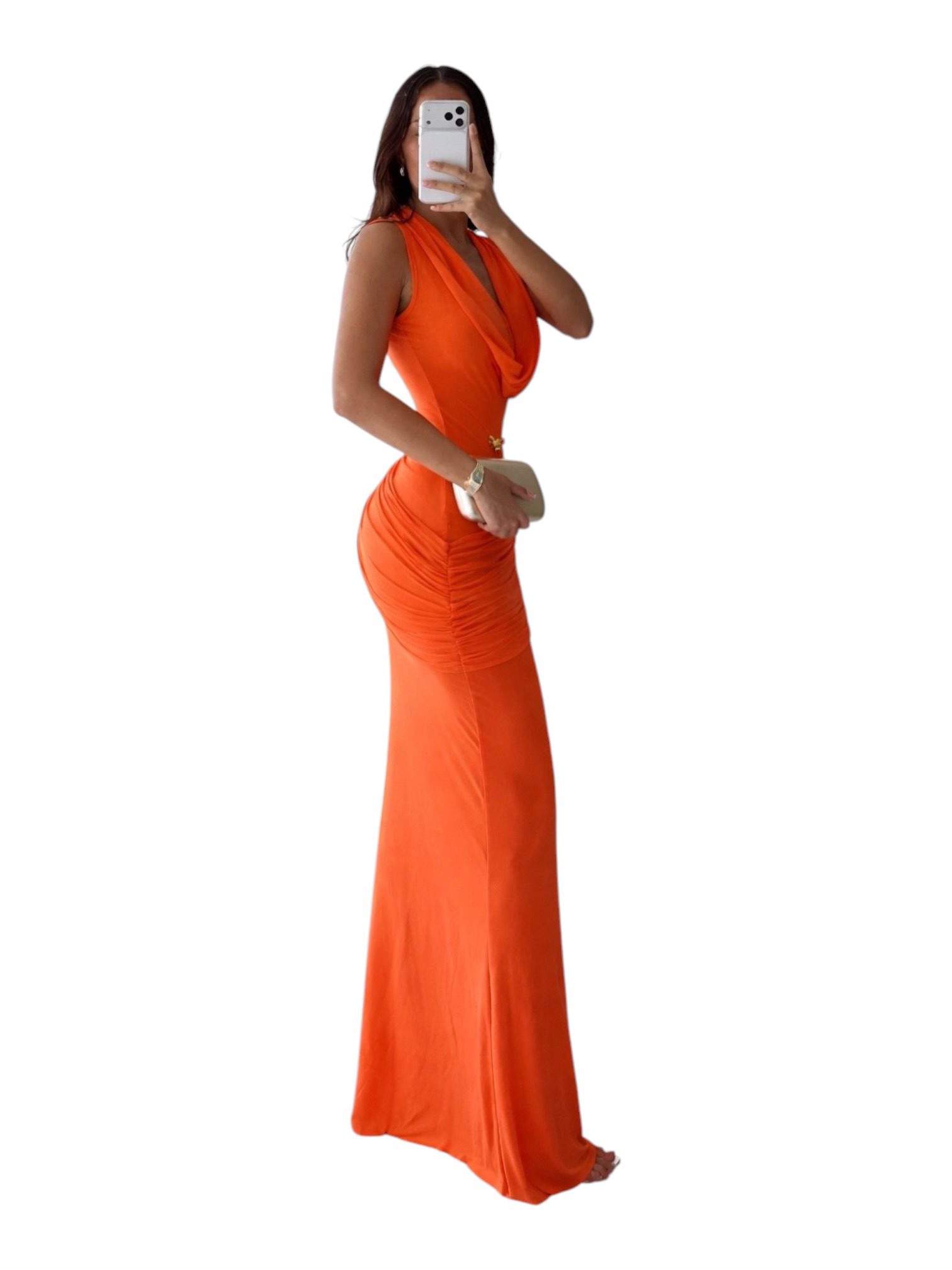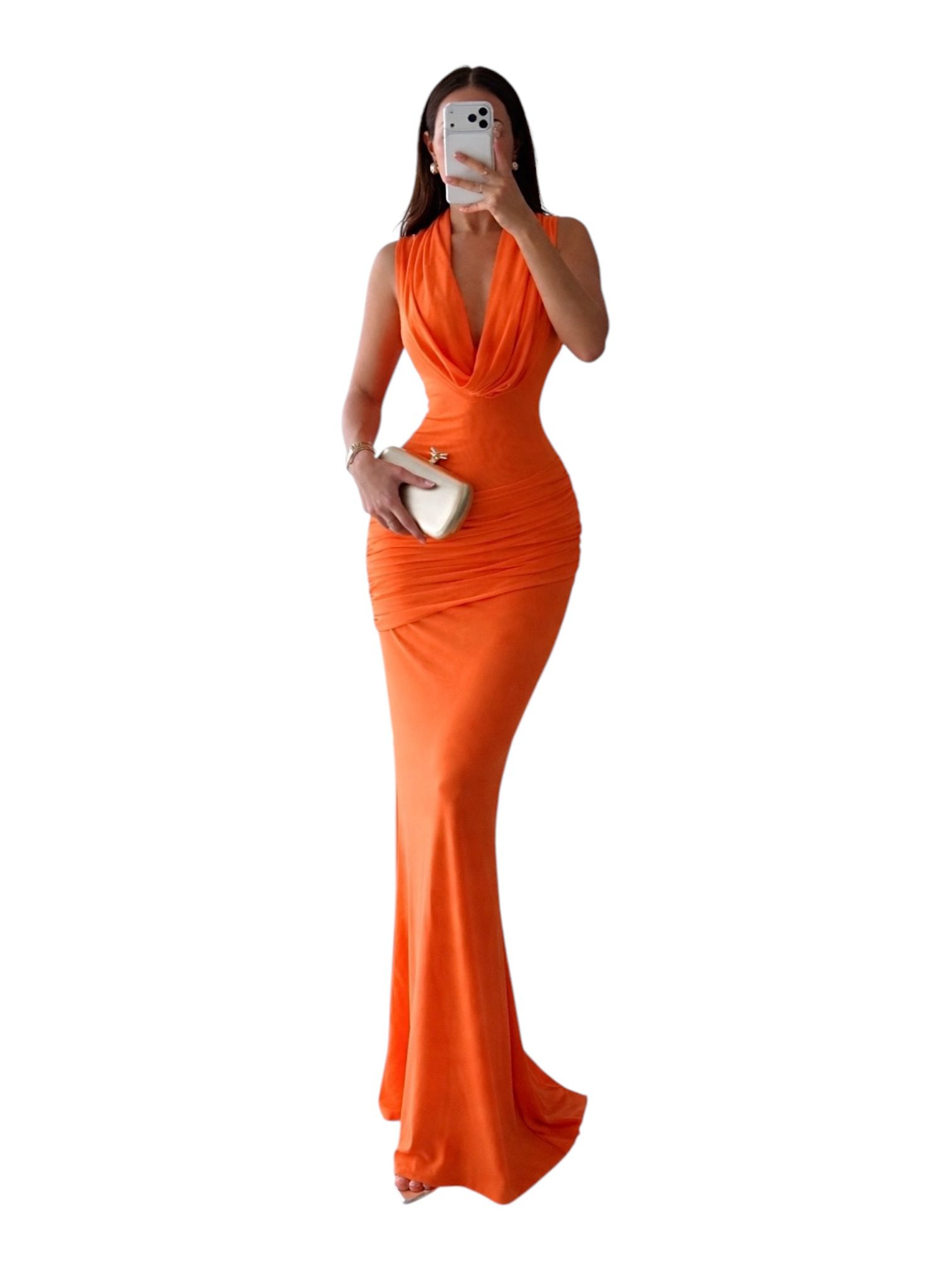 Vestido Naranja Intenso Con Escote Halter Drapeado Y Silueta Ajustada