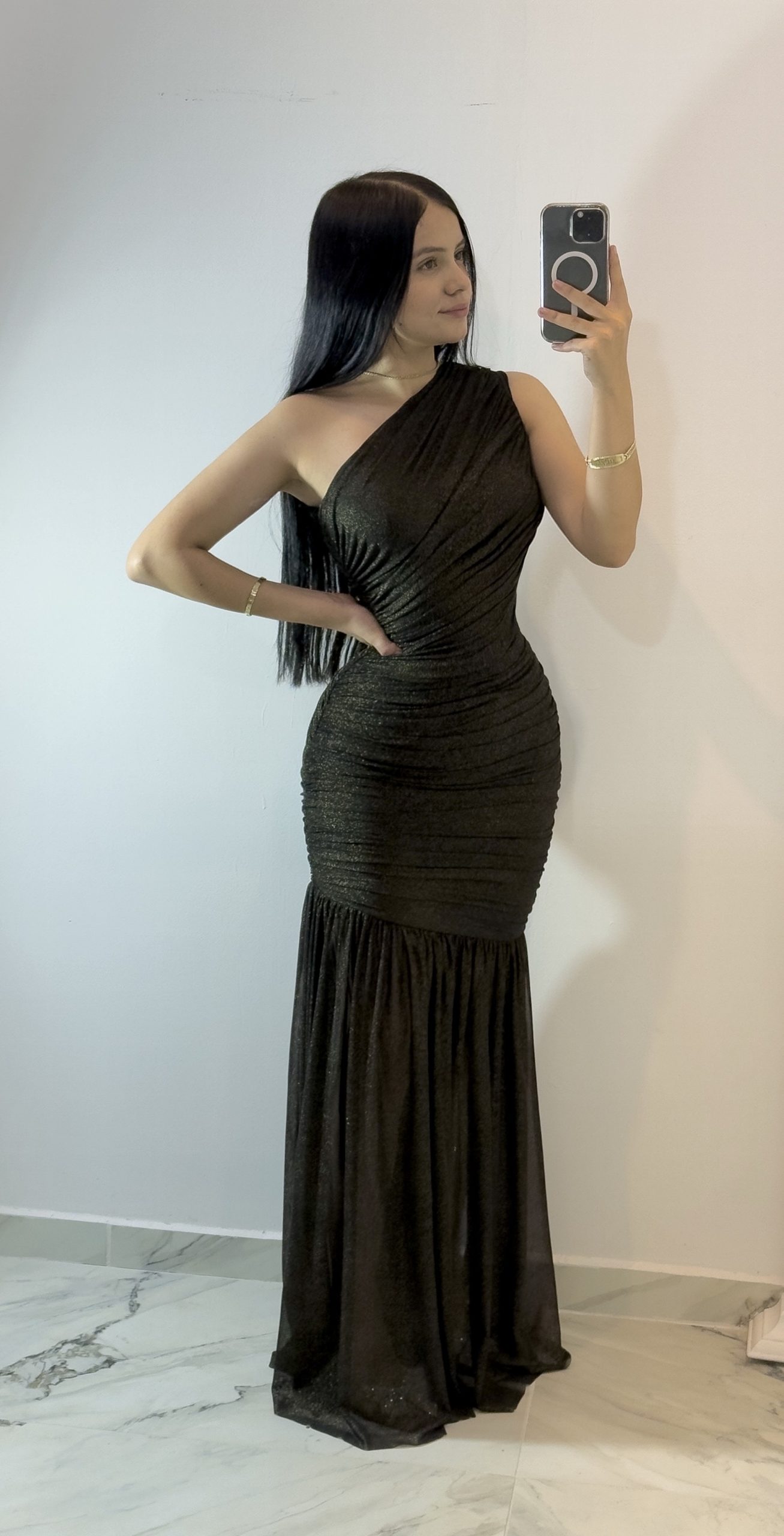 Vestido largo en tono negro confeccionado en tejido con sutil brillo que aporta elegancia y modernidad. Presenta diseño de un solo hombro con drapeado que realza la silueta y crea un efecto visual favorecedor. La cintura se ajusta delicadamente, mientras que la falda plisada de caída fluida añade movimiento y sofisticación. Ideal para galas, cenas o eventos de noche donde busques un look refinado, glamuroso y lleno de estilo.