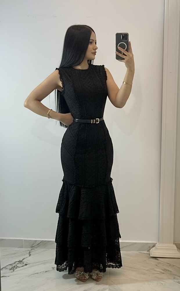 VESTIDO: LARGO NEGRO CON ENCAJE, VOLANTES Y CINTURÓN