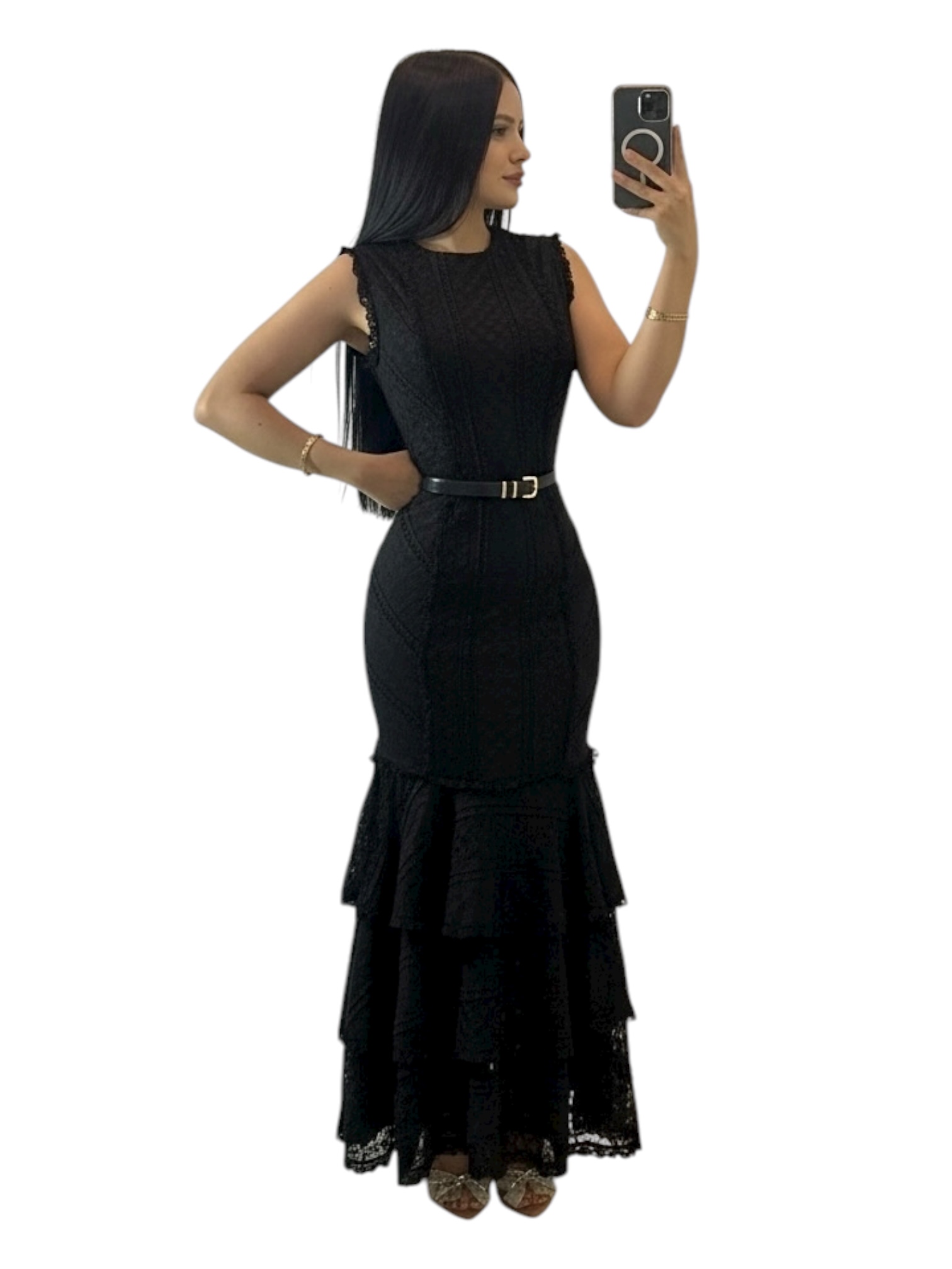 Vestido largo en tono negro confeccionado en tejido de encaje con diseño geométrico que aporta textura y elegancia. Presenta cuello cerrado y sin mangas, realzando los hombros con un toque sofisticado. La cintura se define con un cinturón fino que estiliza la figura, mientras que la falda con volantes escalonados añade movimiento y un aire romántico. Ideal para cenas, eventos de noche o celebraciones donde busques un look clásico, refinado y lleno de distinción.