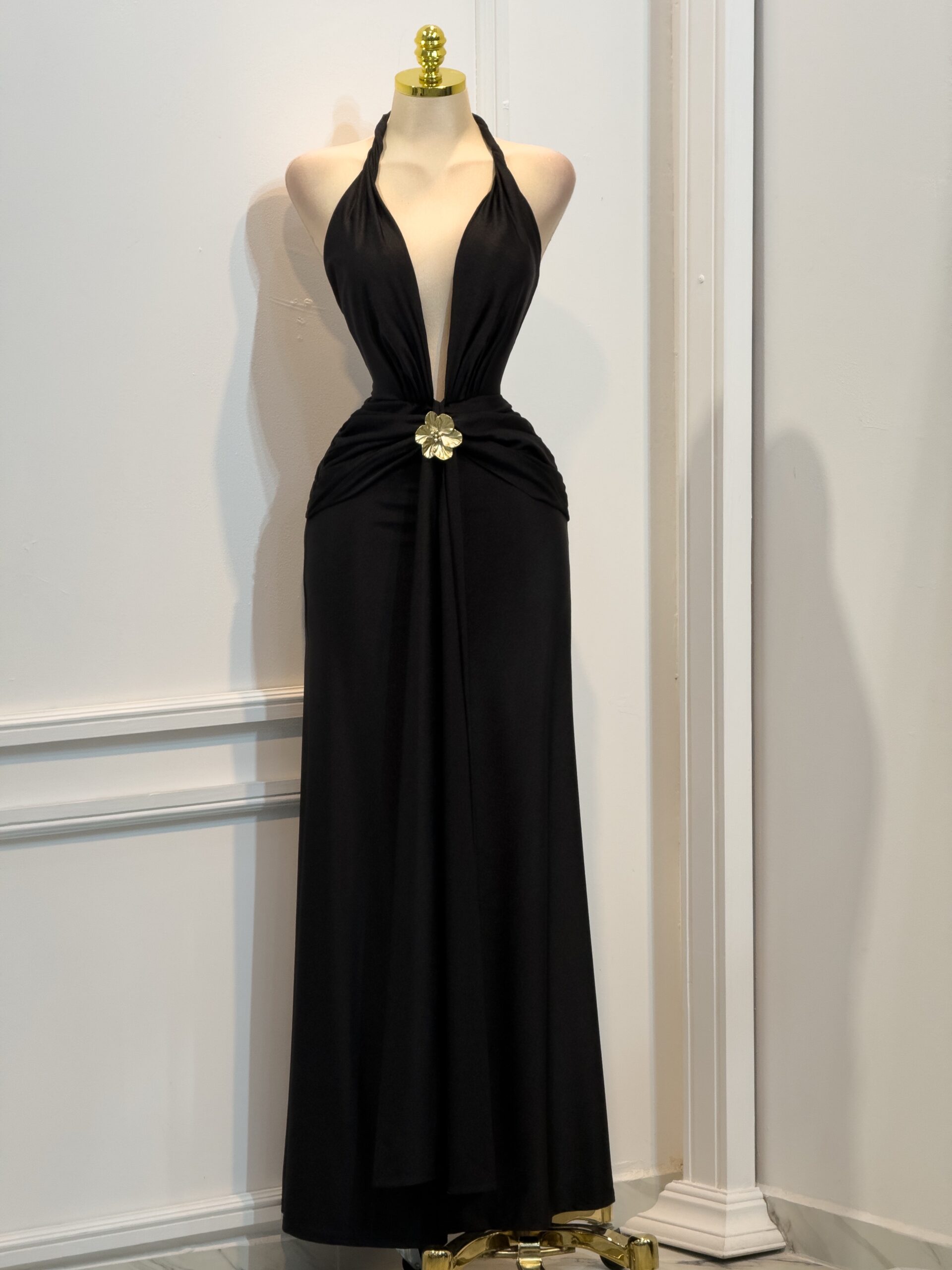 Vestido Negro Con Escote Halter Profundo Y Broche Dorado En Cintura