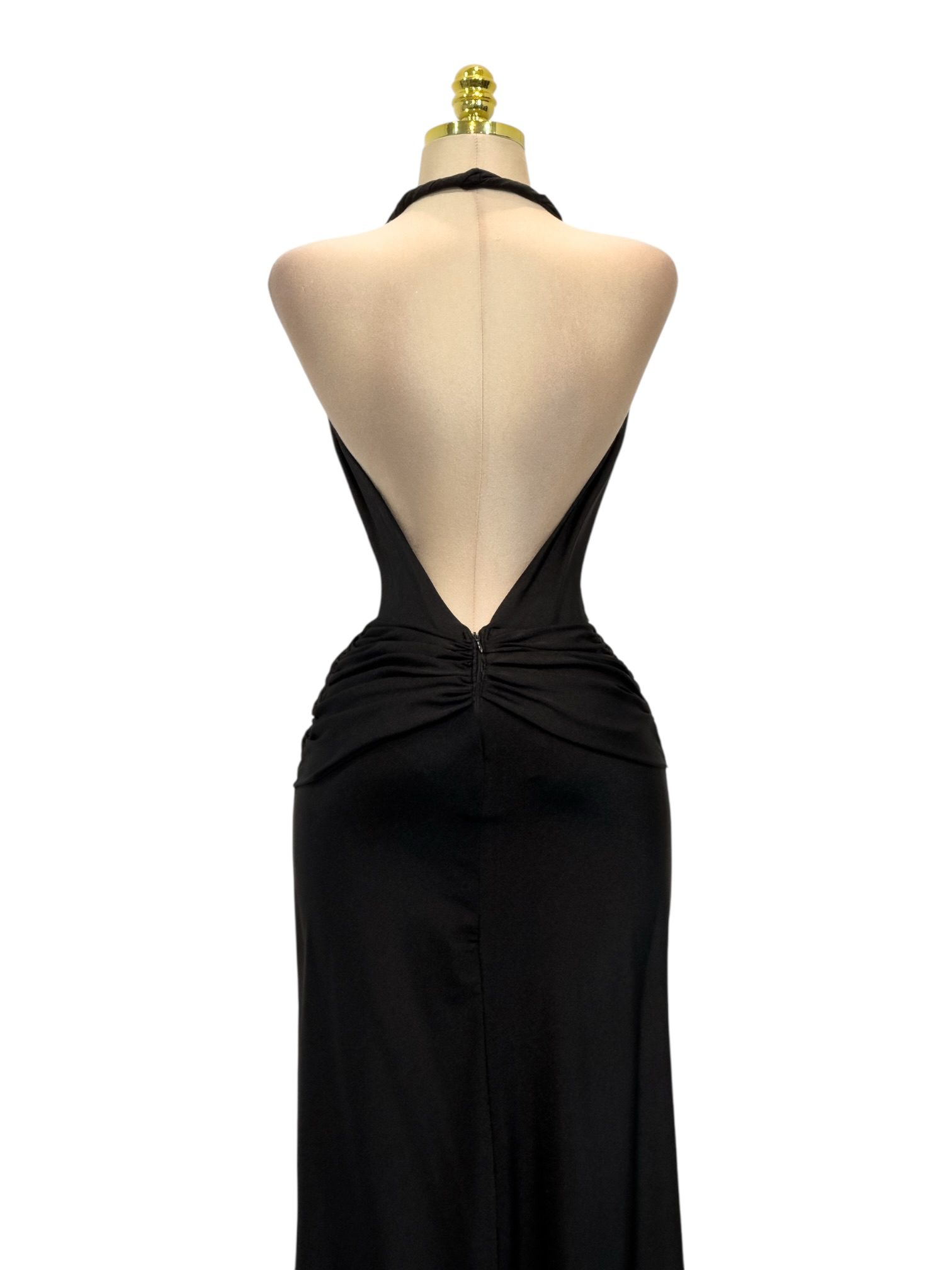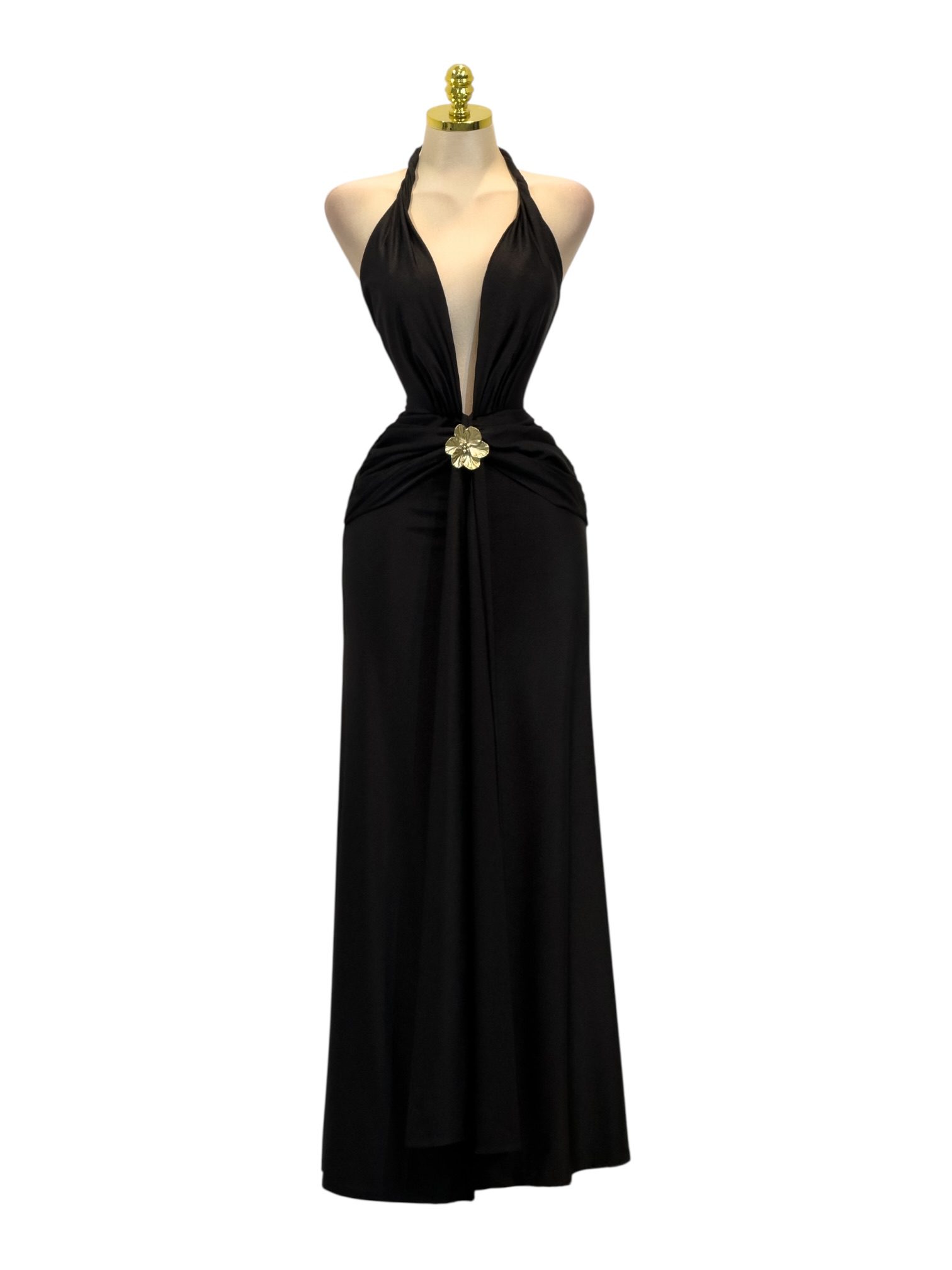 Vestido largo negro con escote halter y pronunciado escote en V. Diseño con drapeado en cintura y aplicación metálica central que estiliza la silueta. Elegante y perfecto para eventos de noche.