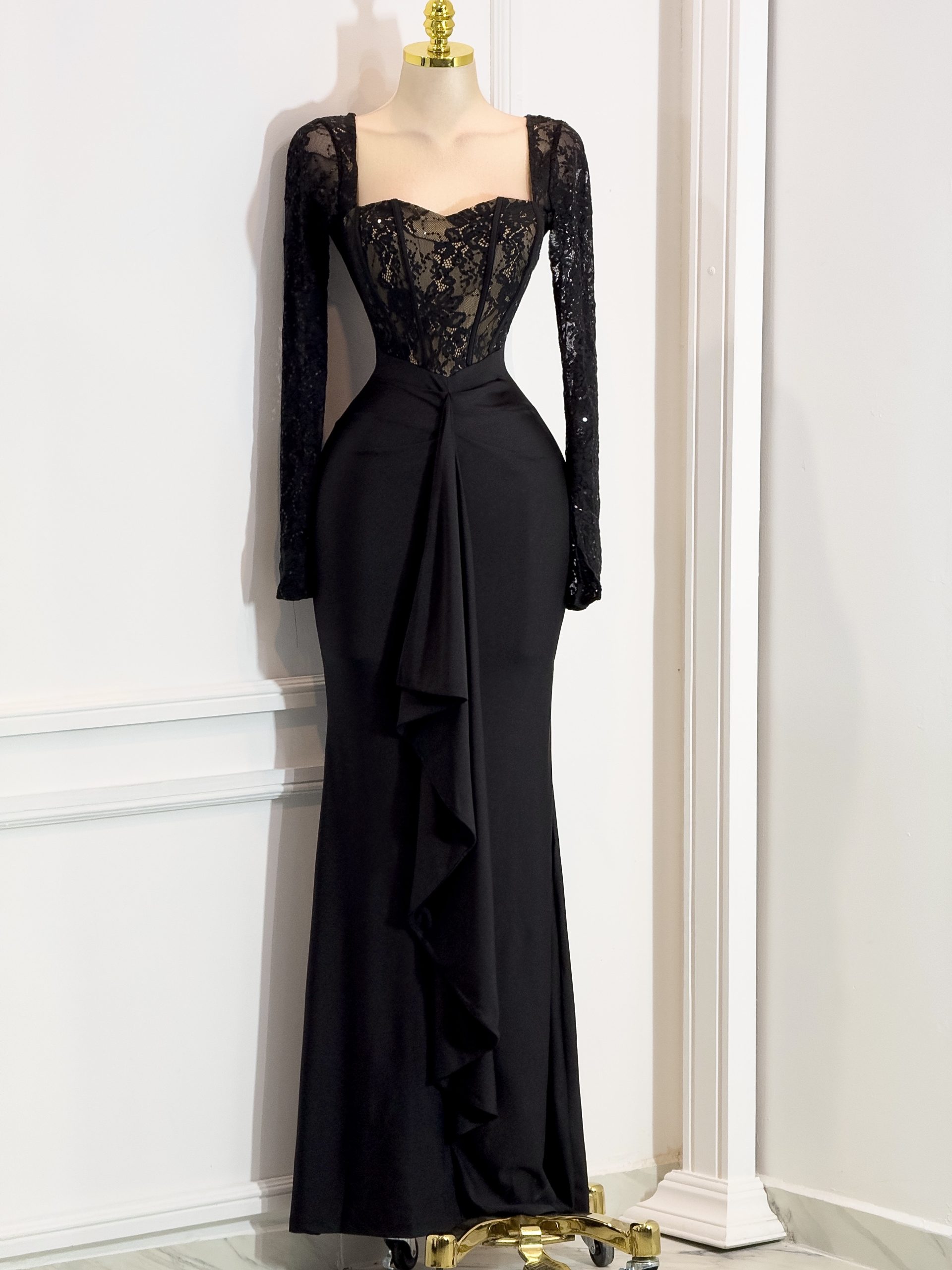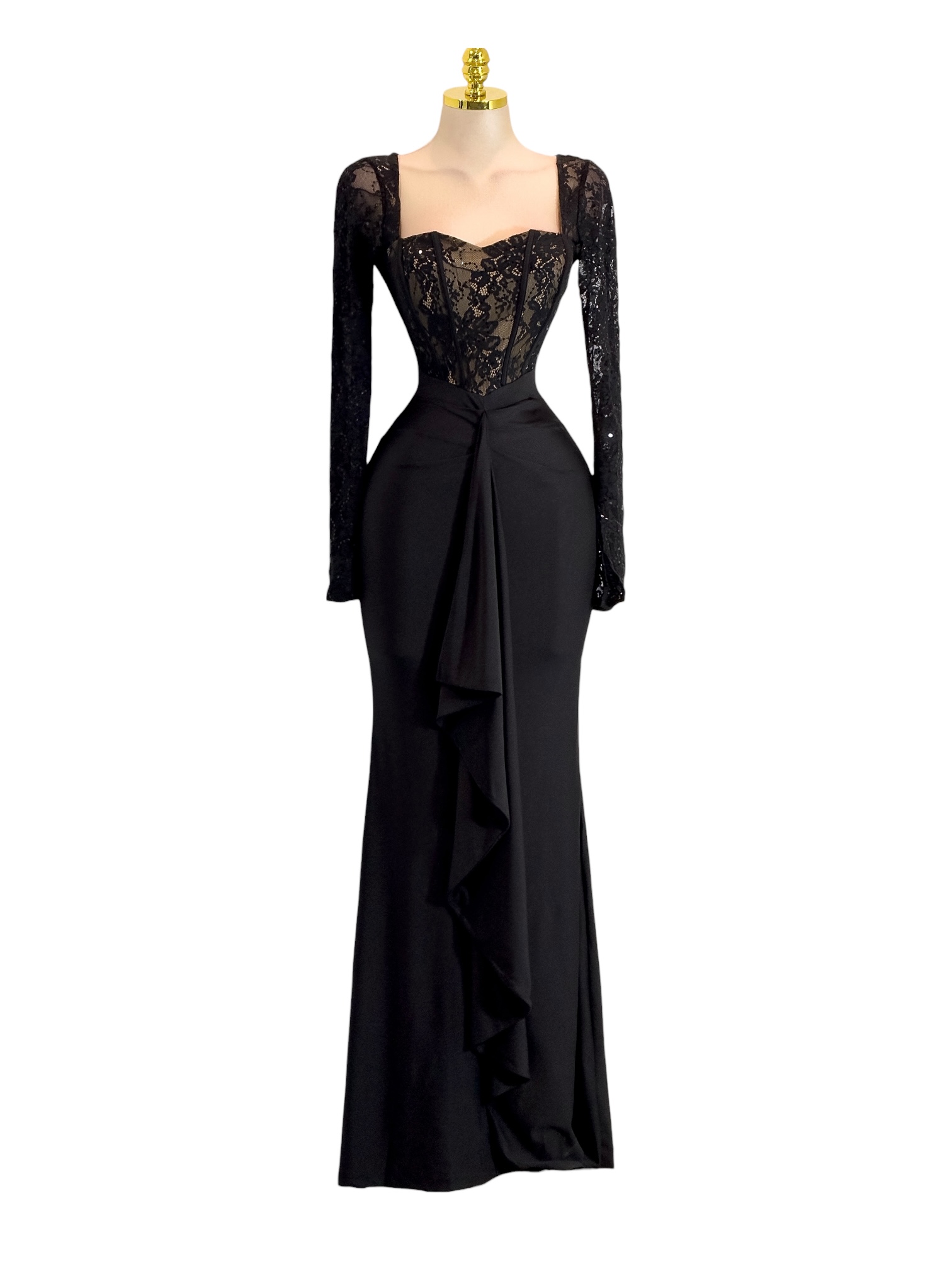 Vestido largo en tono negro con un diseño exquisito y sofisticado que combina encaje, estructura y caída fluida. Presenta un corset elaborado en encaje transparente con efecto delicado y sensual, acompañado de mangas largas del mismo material que aportan elegancia y un toque romántico.La cintura se define con un drapeado central que estiliza la silueta, dando paso a una falda larga con un volante frontal en cascada que añade movimiento, dramatismo y un acabado refinado.Ideal para galas, eventos formales o noches especiales donde busques lucir un look distinguido, femenino y de alto impacto visual.