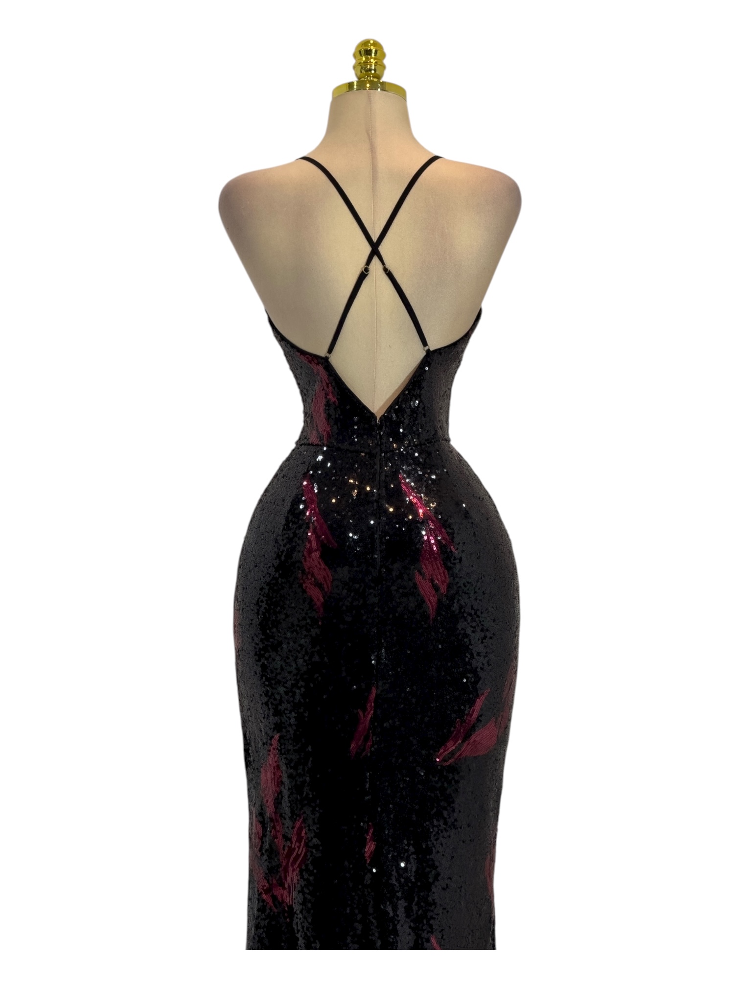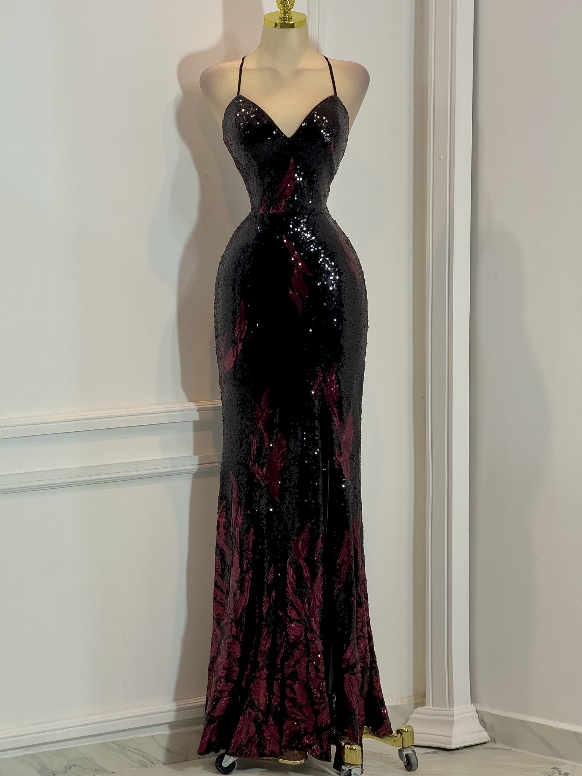 Vestido largo en tono negro con reflejos carmesi, cubierto de lentejuelas que capturan la luz con un brillo sofisticado. Presenta escote en “V” con tirantes delgados que aportan un toque delicado y femenino, mientras que la abertura frontal en la falda añade sensualidad y movimiento. La silueta entallada realza las curvas y estiliza la figura con elegancia. Ideal para galas, eventos formales o celebraciones nocturnas donde busques un look deslumbrante, moderno y lleno de glamour.