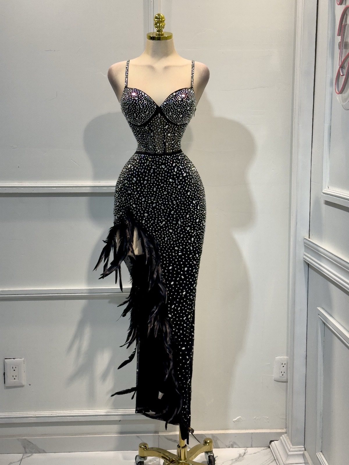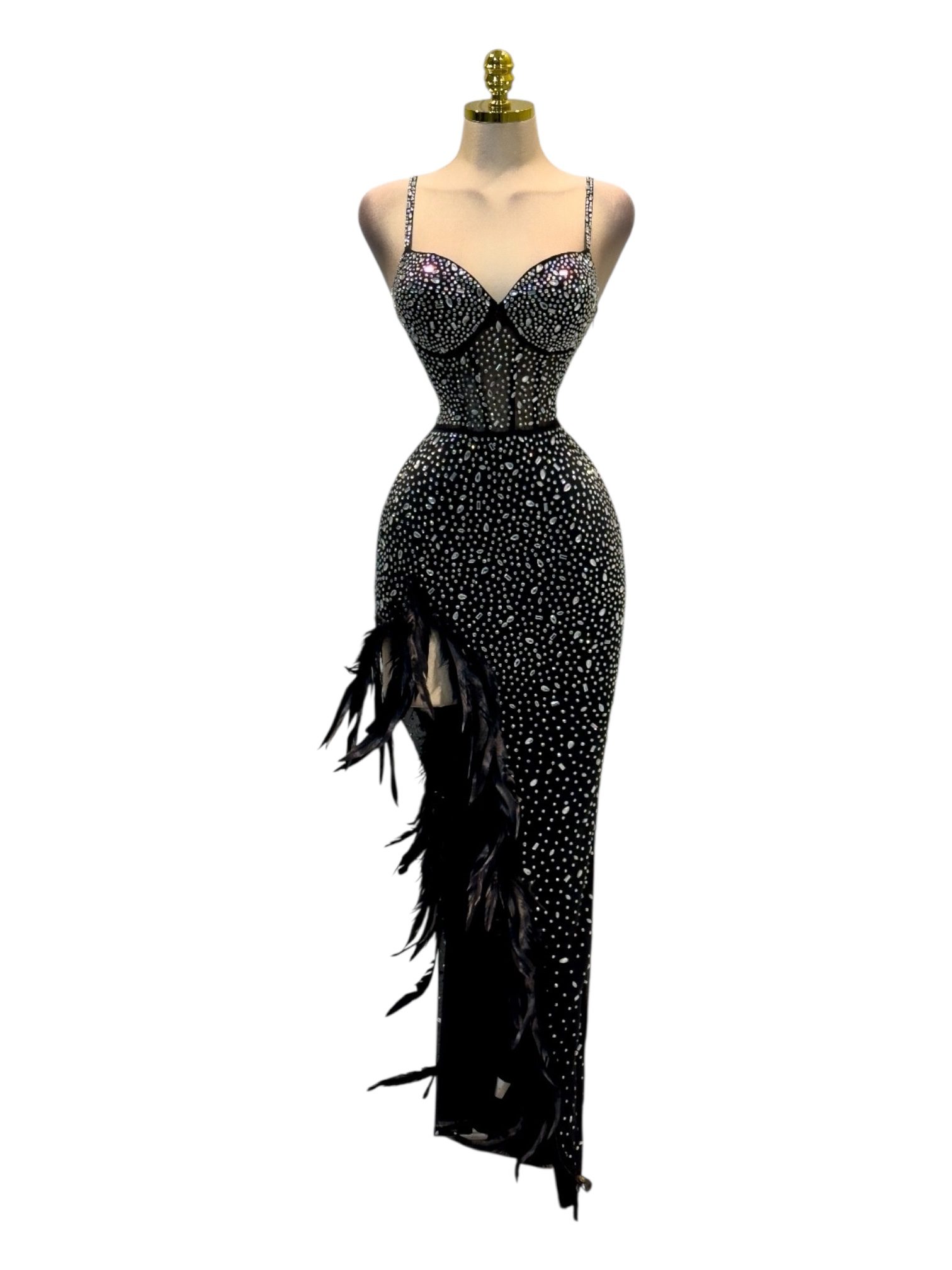 Vestido largo en tono negro con delicadas piedras que aportan un aire glamuroso y sofisticado. Presenta escote en V con tirantes finos que realzan el busto y una silueta ajustada que define la figura. Su falda incorpora un detalle de flecos en un lateral que añade movimiento y un toque distintivo. Ideal para galas, recepciones o eventos de noche donde busques destacar con un look elegante y llamativo.