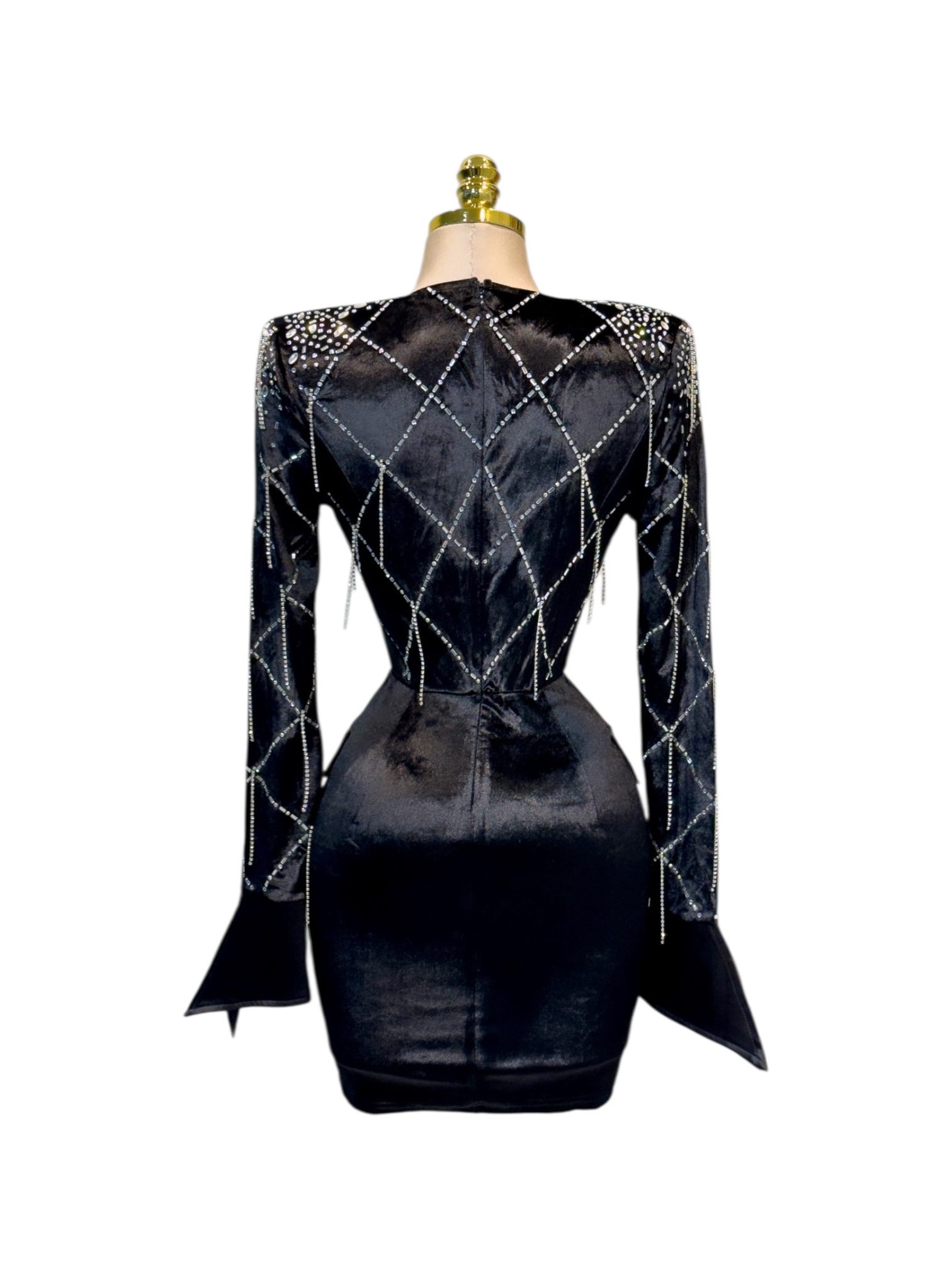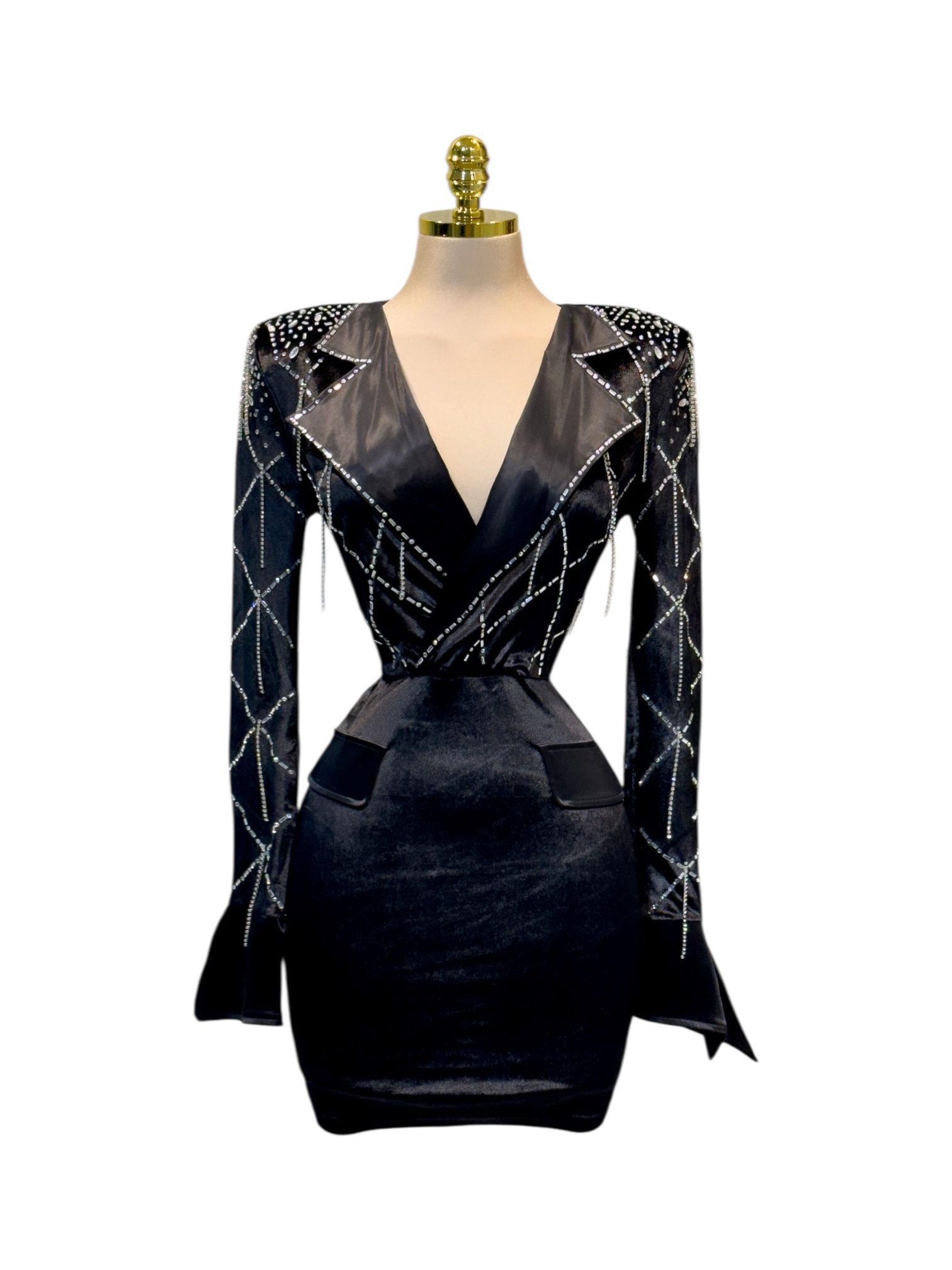 Vestido corto tipo blazer en tono negro con escote en V que estiliza el cuello y realza el busto. Su diseño entallado incorpora aplicaciones brillantes en patrón geométrico, aportando un toque moderno y sofisticado. Ideal para noches de fiesta, cenas elegantes o eventos donde busques un look audaz y glamuroso.