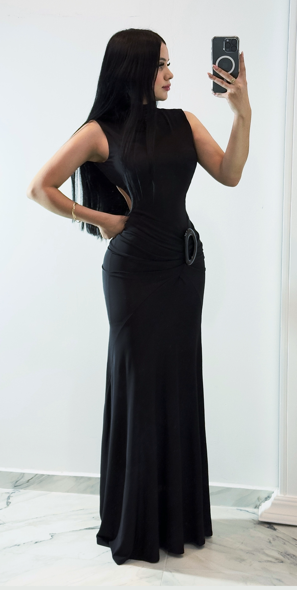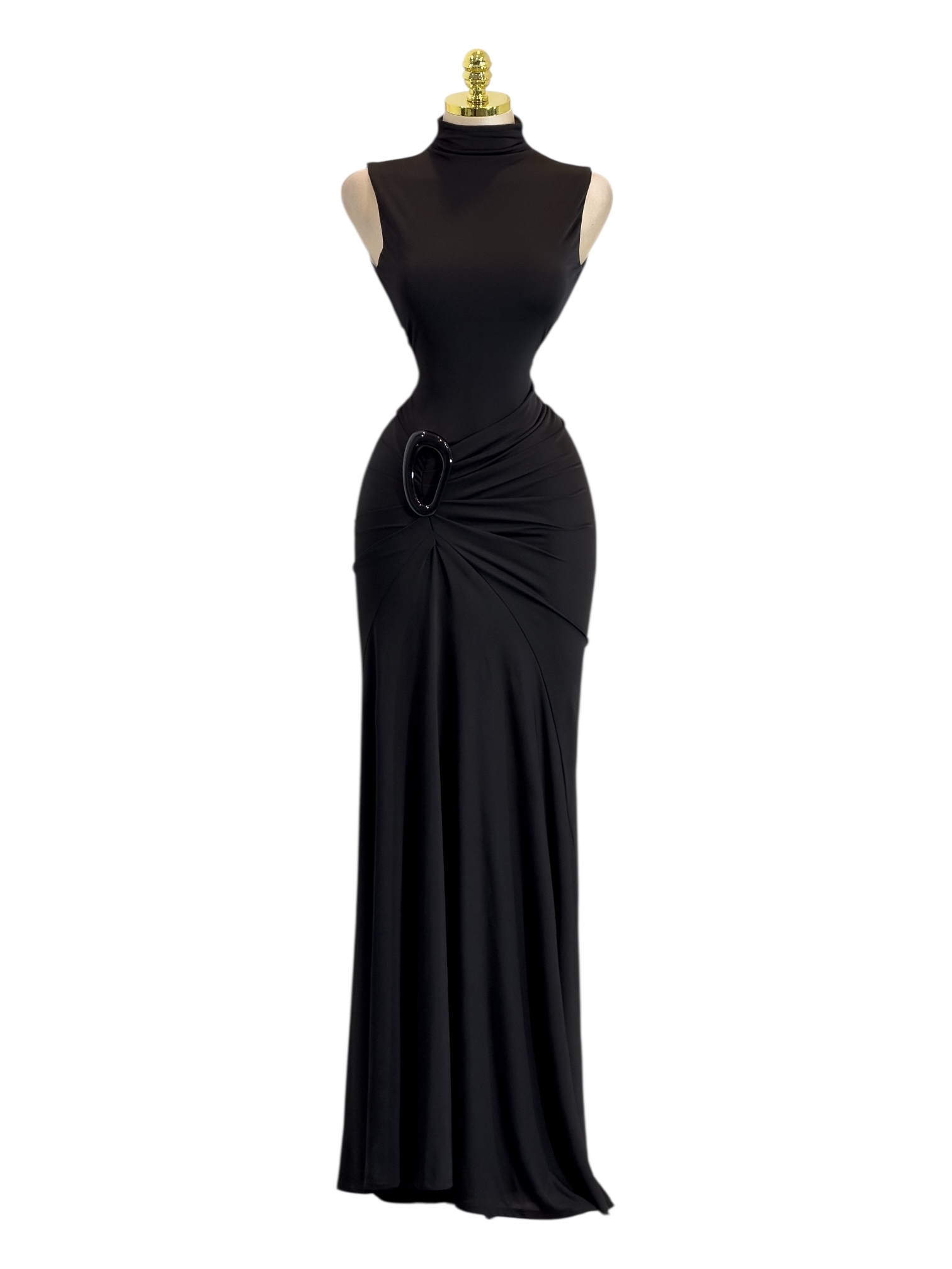 Vestido largo en tono negro con diseño elegante y moderno. Presenta cuello alto que aporta un acabado pulido y sofisticado, acompañado de un corte lateral discreto que añade un toque femenino y actual. La cintura se acentúa con un aplique decorativo que crea un ligero efecto fruncido, mientras que la falda larga de caída fluida estiliza la figura y aporta movimiento. Ideal para cenas formales, eventos especiales o noches donde busques un look refinado, minimalista y de alto impacto visual.
