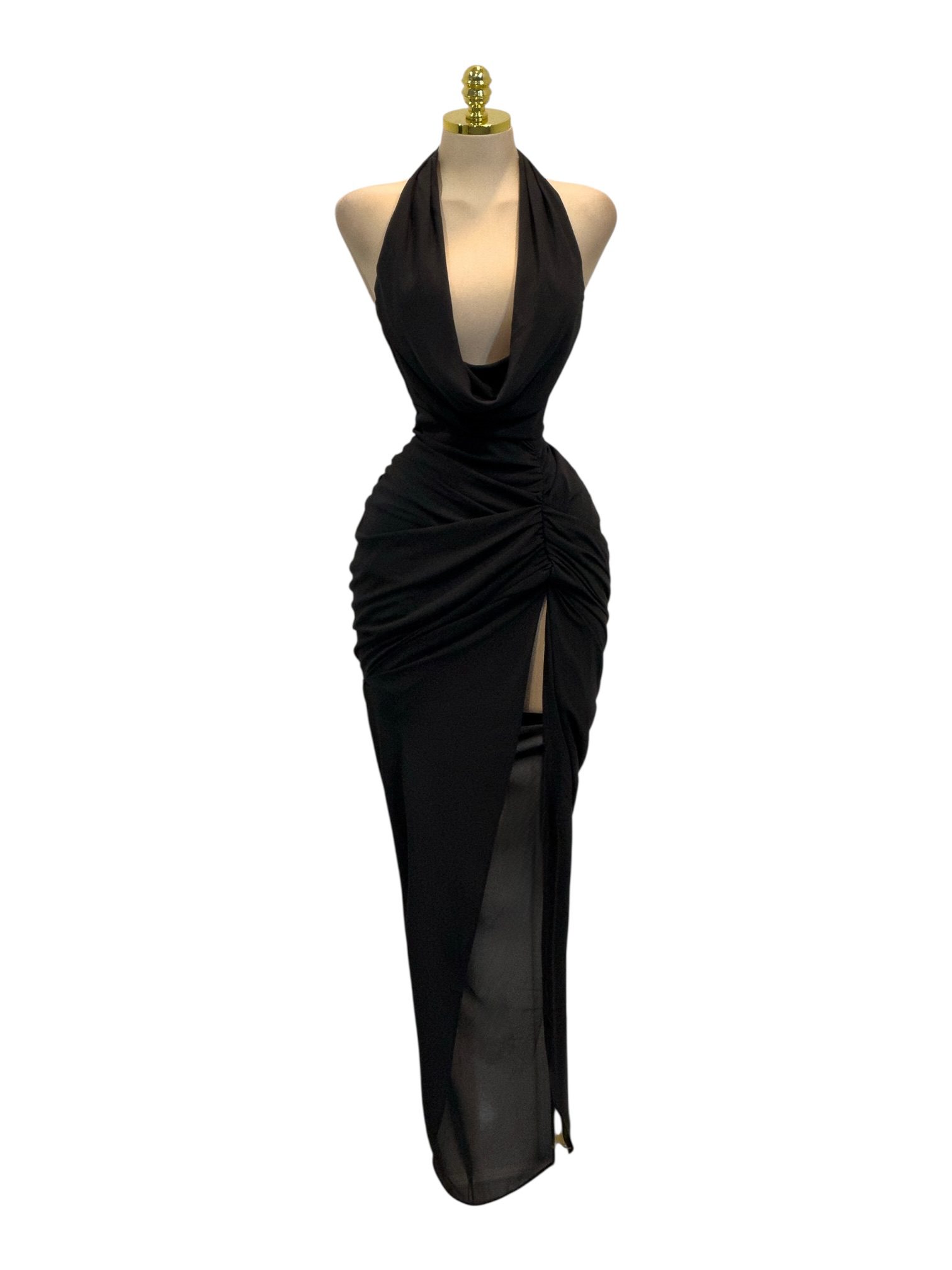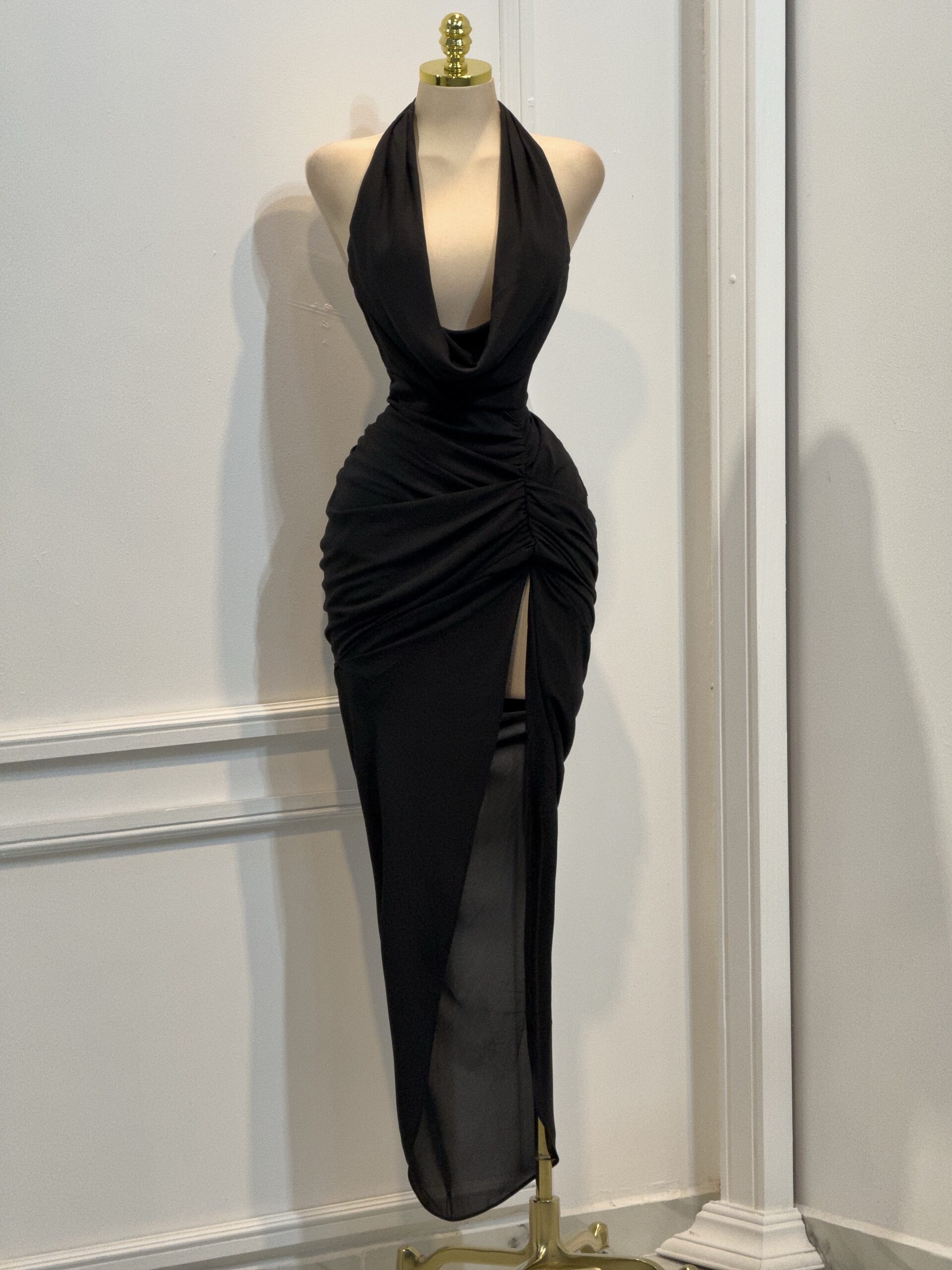 Vestido Negro Halter Con Escote Drapeado Y Abertura