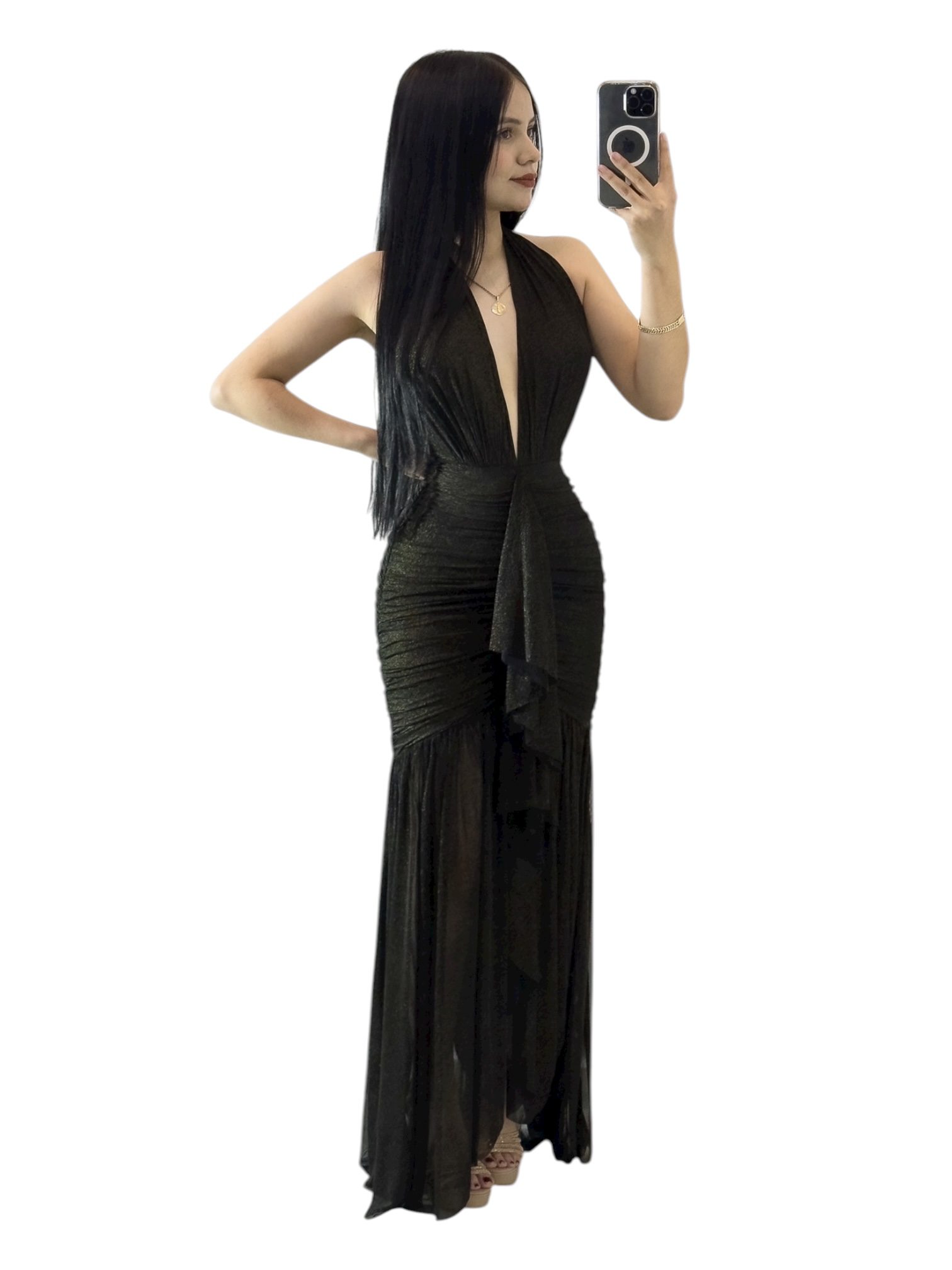 Vestido largo en tono negro con sutil brillo que aporta un acabado elegante y sofisticado. Presenta escote profundo en “V” que realza el busto y alarga visualmente la figura. El frunce lateral define la cintura, mientras que el volante que desciende hasta el bajo añade movimiento y un toque de dramatismo refinado. Ideal para galas, cenas o eventos de noche donde busques un look sensual, distinguido y lleno de elegancia.