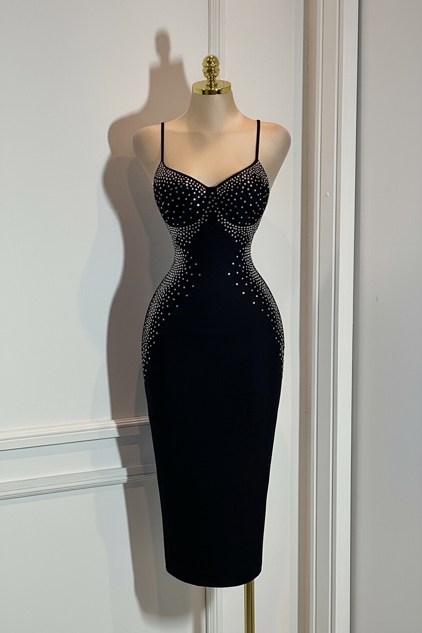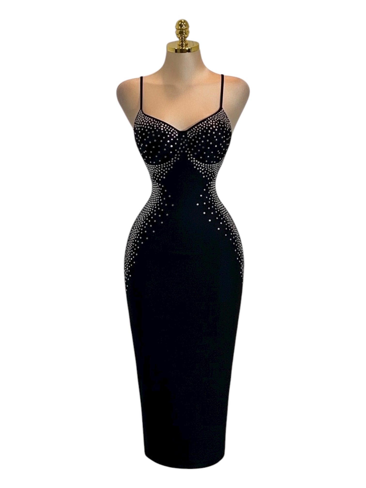 Vestido midi en tono negro que se ajusta a la silueta con elegancia y precisión. Presenta tirantes delgados y un escote ligeramente en “V” que realza el busto con sutileza. El diseño incorpora aplicaciones de pedreria distribuidas estratégicamente a lo largo del torso y las caderas, creando un efecto visual que estiliza y acentúa la figura. El corte entallado ofrece un acabado sofisticado y moderno. Ideal para cócteles, cenas o eventos nocturnos donde busques un look pulido, sensual y lleno de distinción.