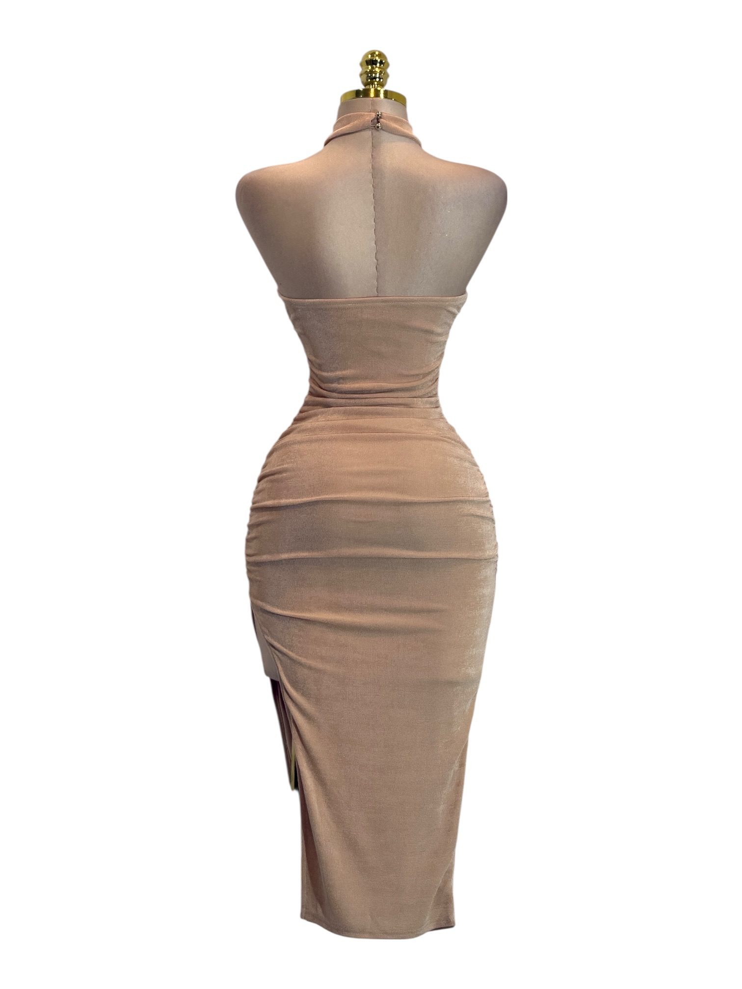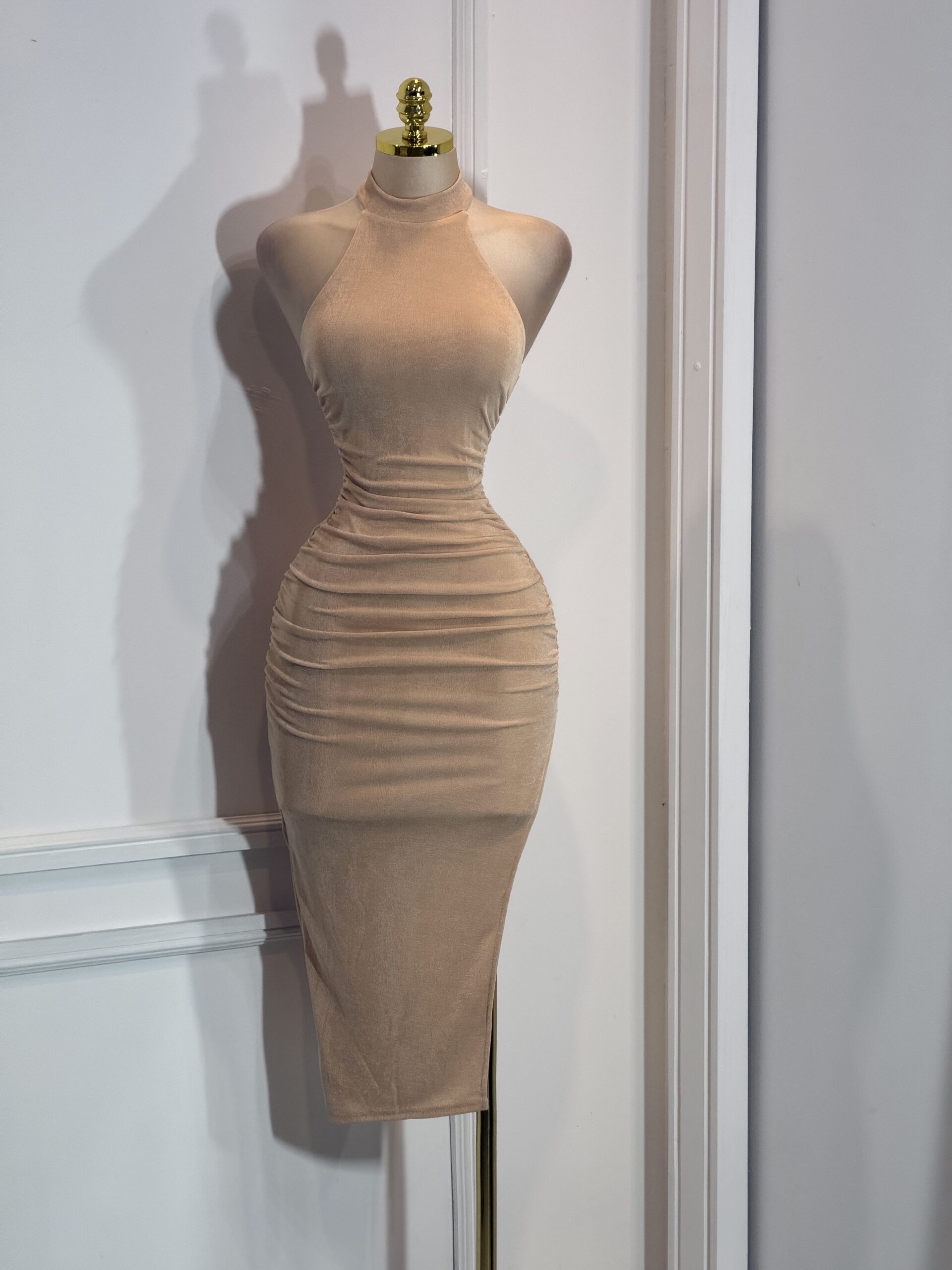 Vestido midi en tono nude con diseño halter y cuello alto. Corte ajustado con efecto drapeado en la cintura que estiliza la figura. Minimalista y sofisticado, ideal para eventos de noche o salidas especiales.
