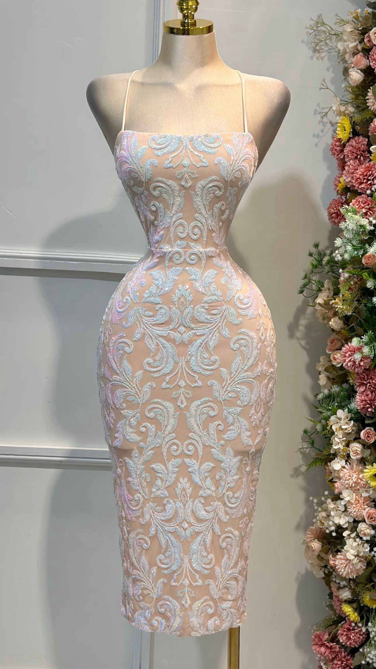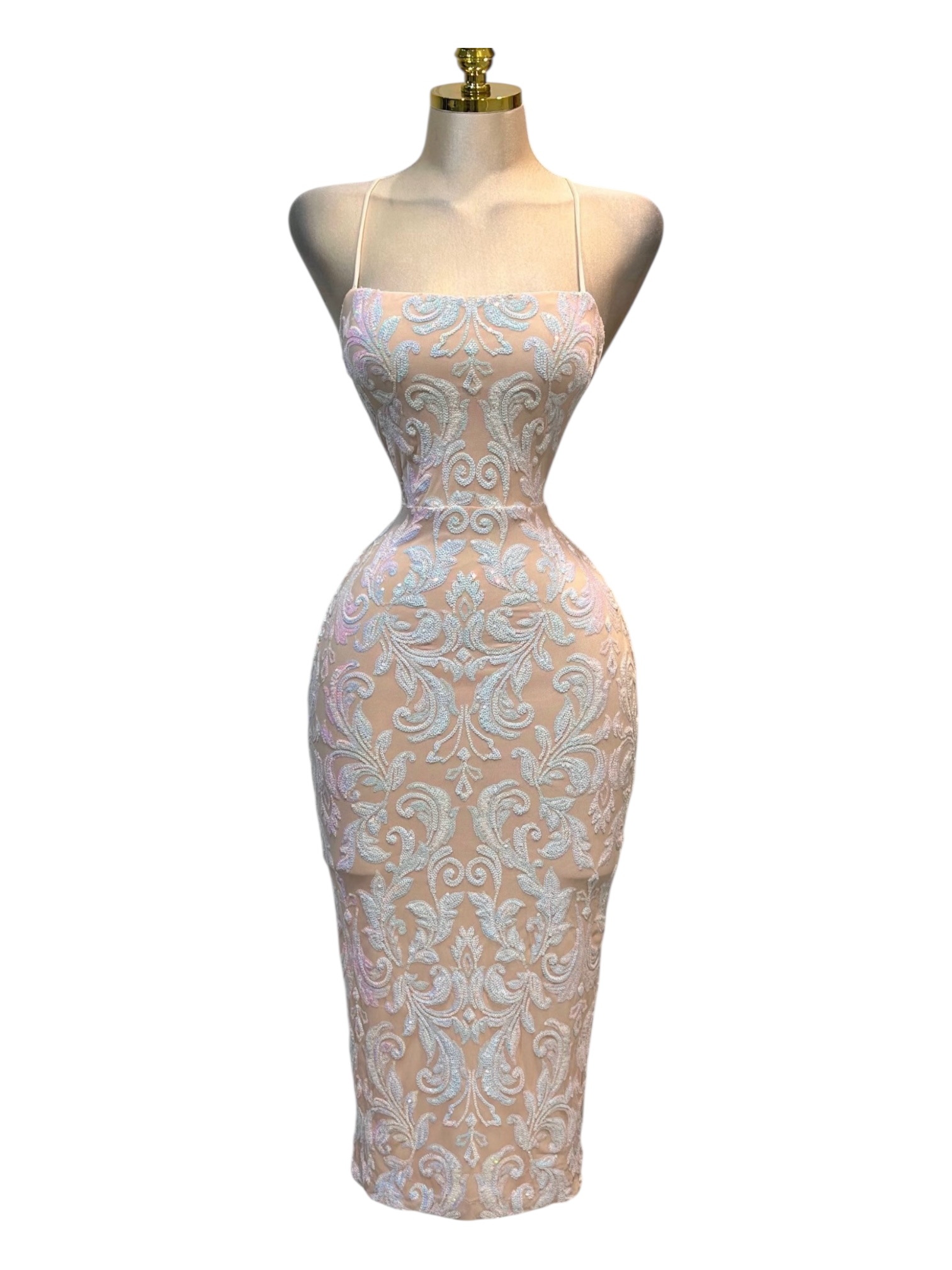 Vestido Nude Midi Con Bordado Barroco Y Tirantes Delgados