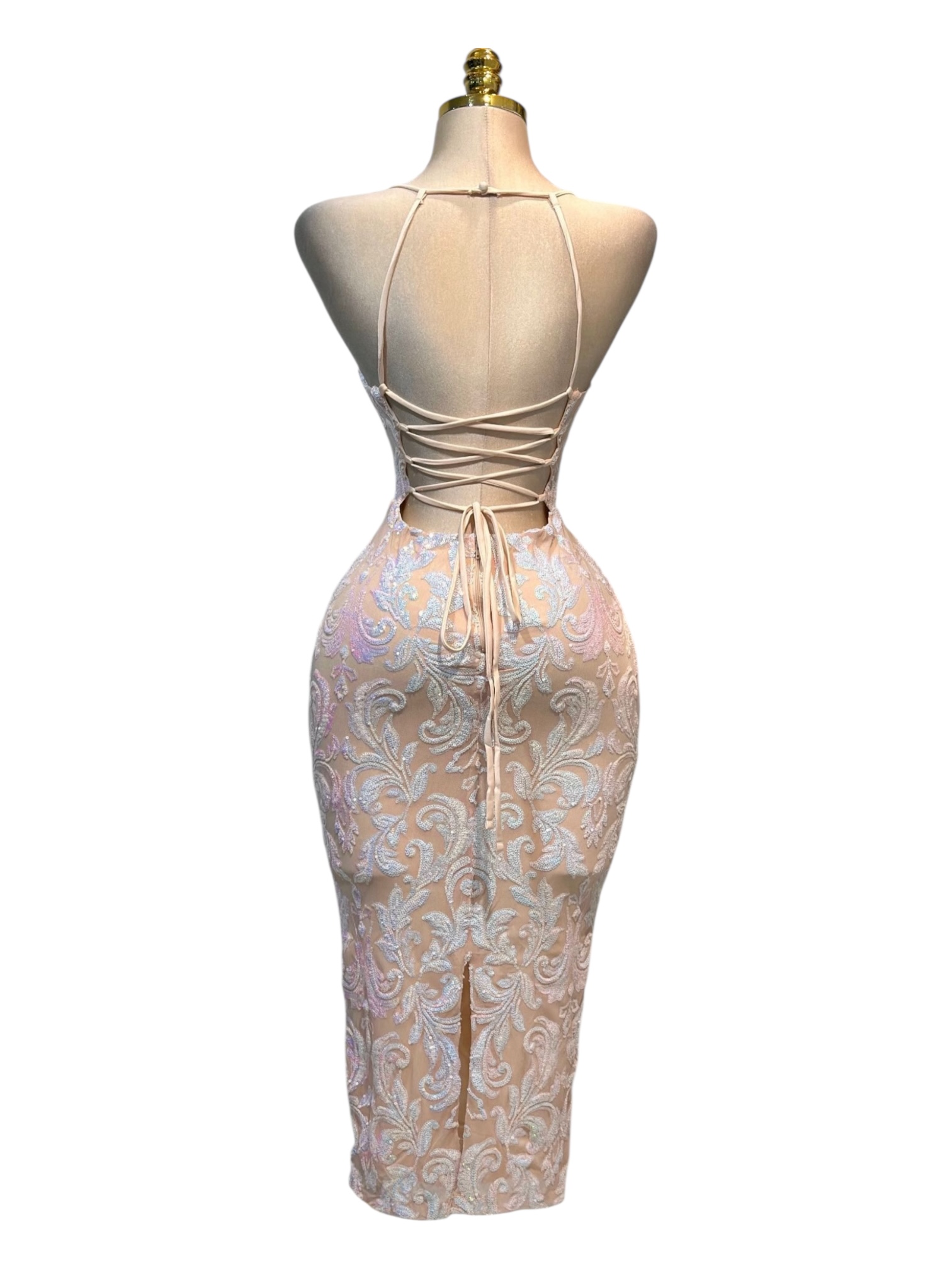 quantity Vestido Nude Midi Con Bordado Barroco Y Tirantes Delgados