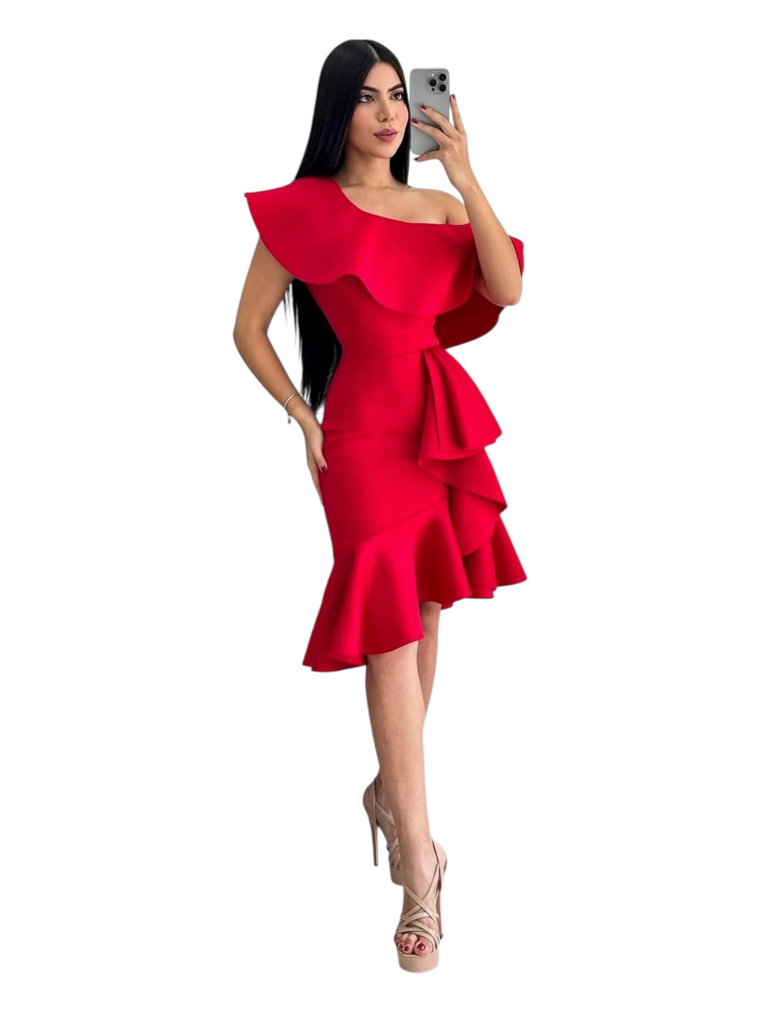 VESTIDO: MIDI ROJO CON ESCOTE ASIMÉTRICO Y VOLANTES ESTRUCTURADOS