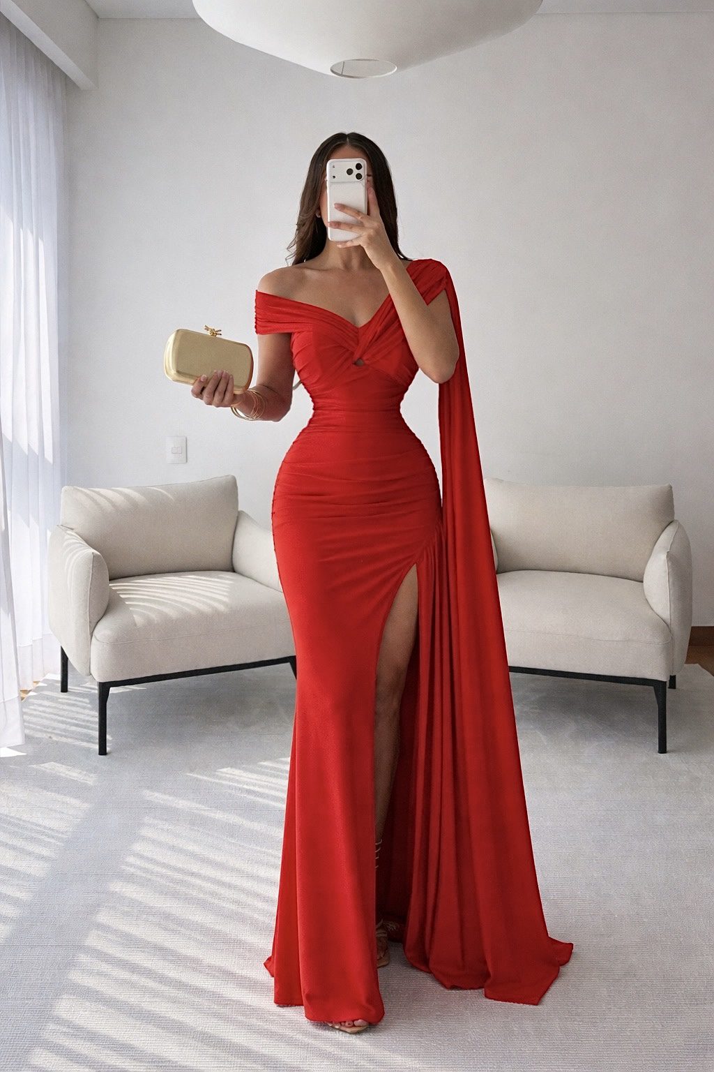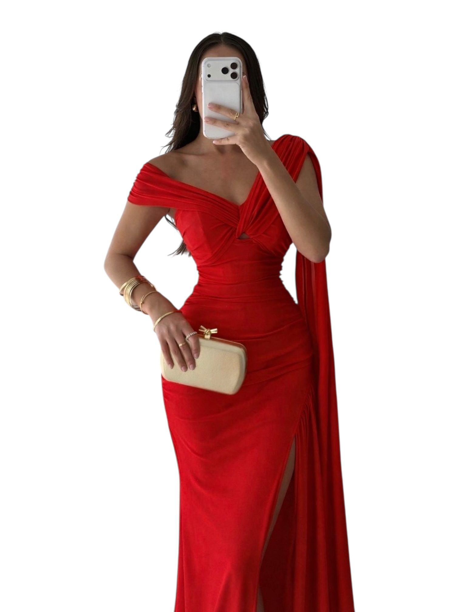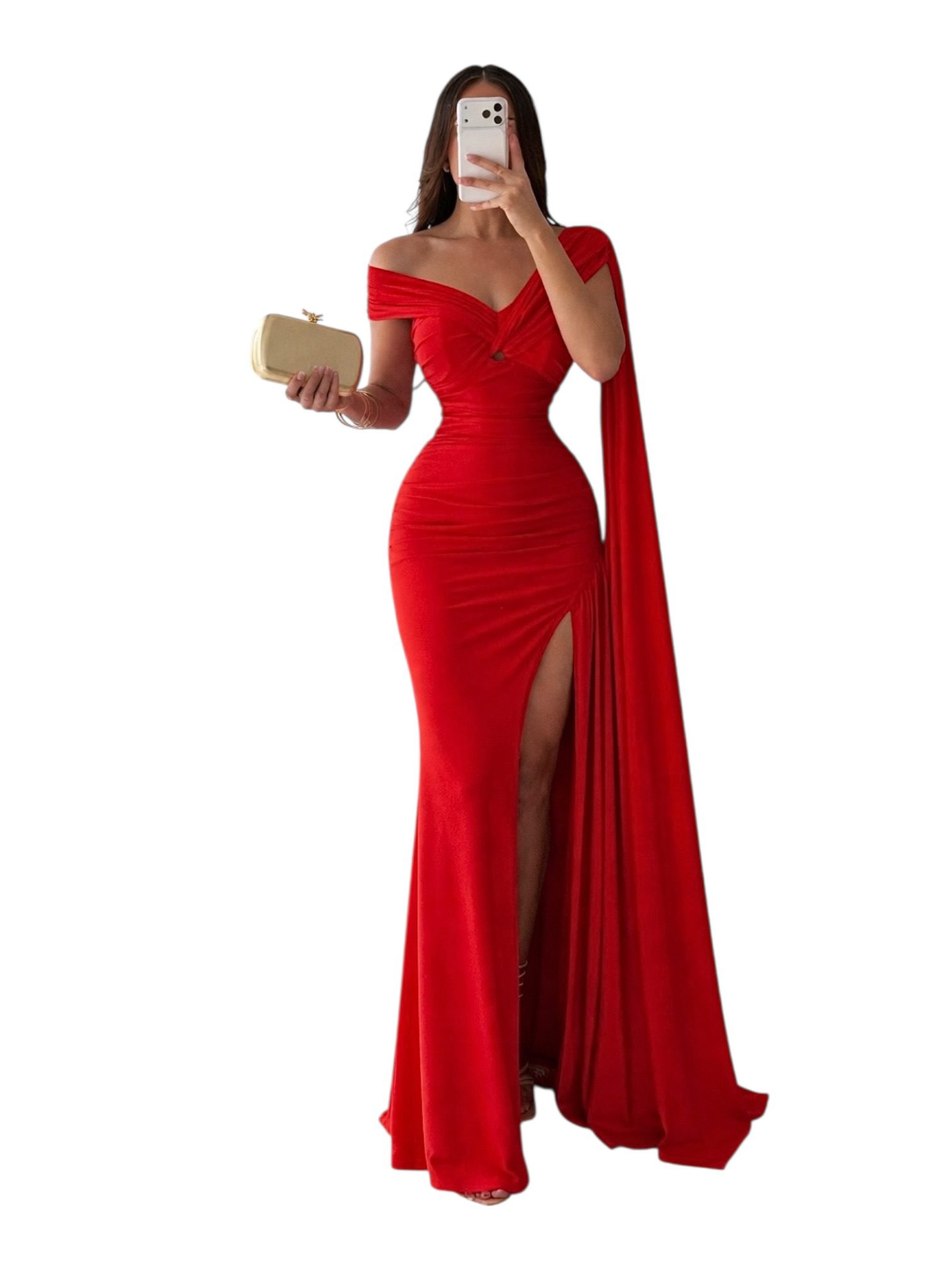 Vestido largo en color rojo con escote off shoulder y diseño entallado que realza la silueta. Incluye abertura lateral en la pierna y caída fluida con detalle de tela extendida que aporta movimiento y elegancia. Ideal para eventos formales o de noche.