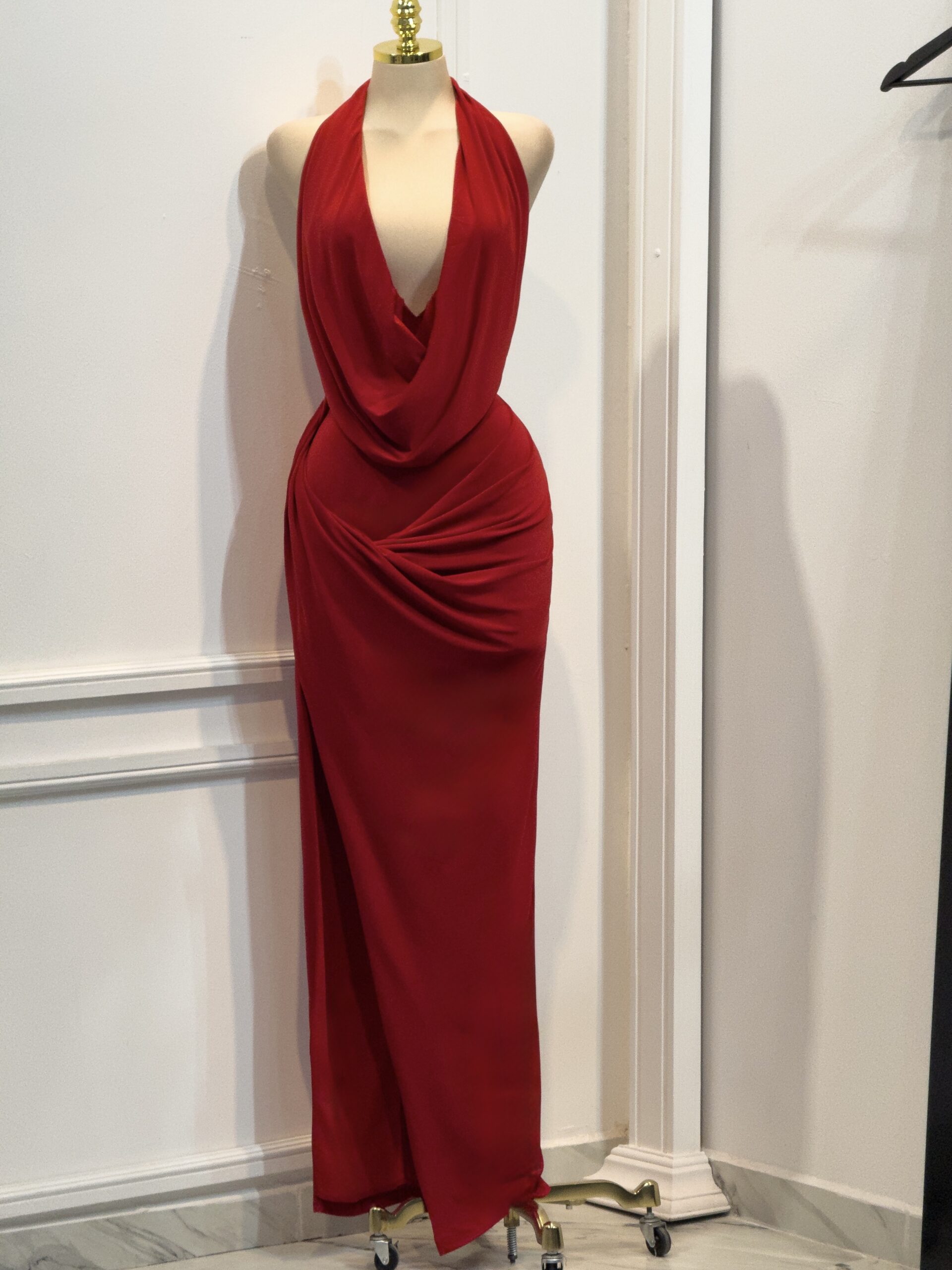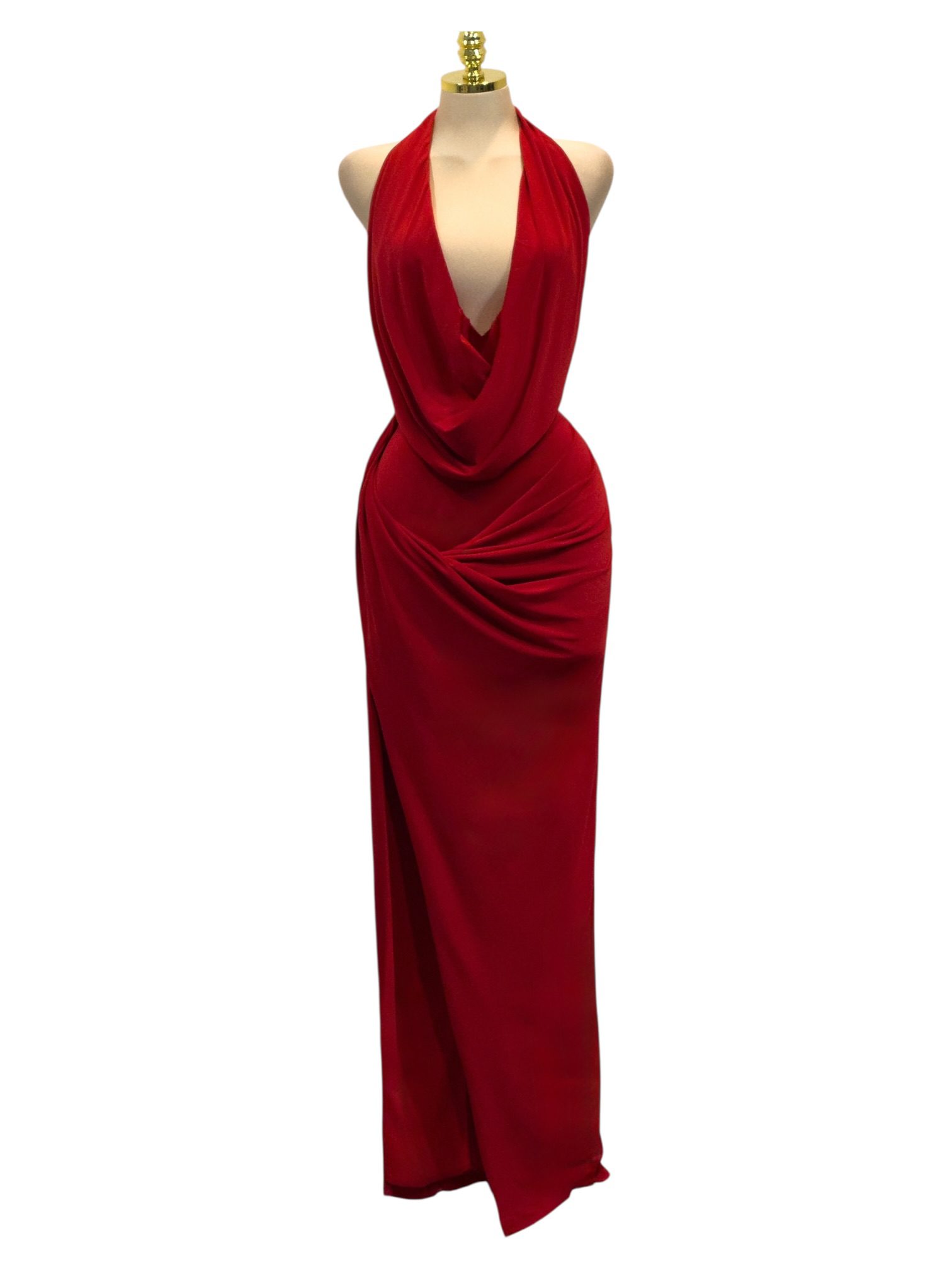 Vestido largo en tono rojo con escote halter y caída tipo cowl. Diseño con drapeado en la cadera que estiliza la silueta y falda fluida con abertura sutil. Elegante y perfecto para eventos de noche.