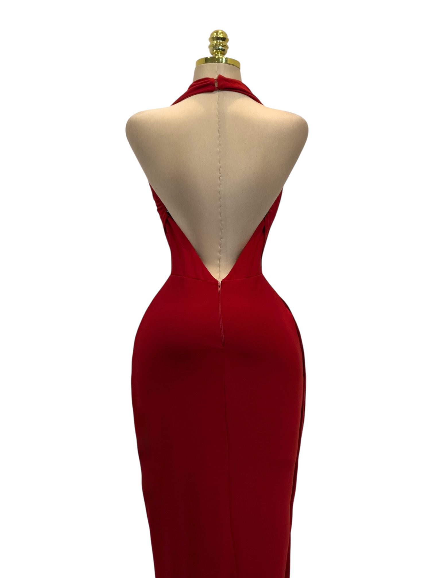 VESTIDO: LARGO ROJO HALTER CON DRAPEADO