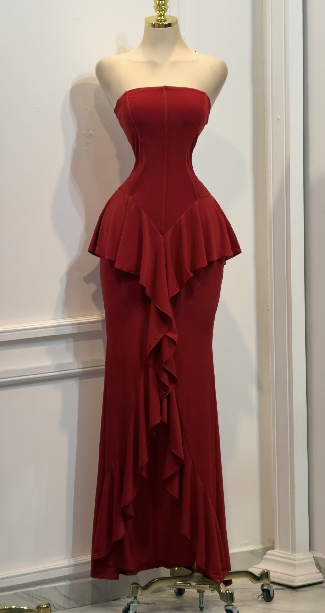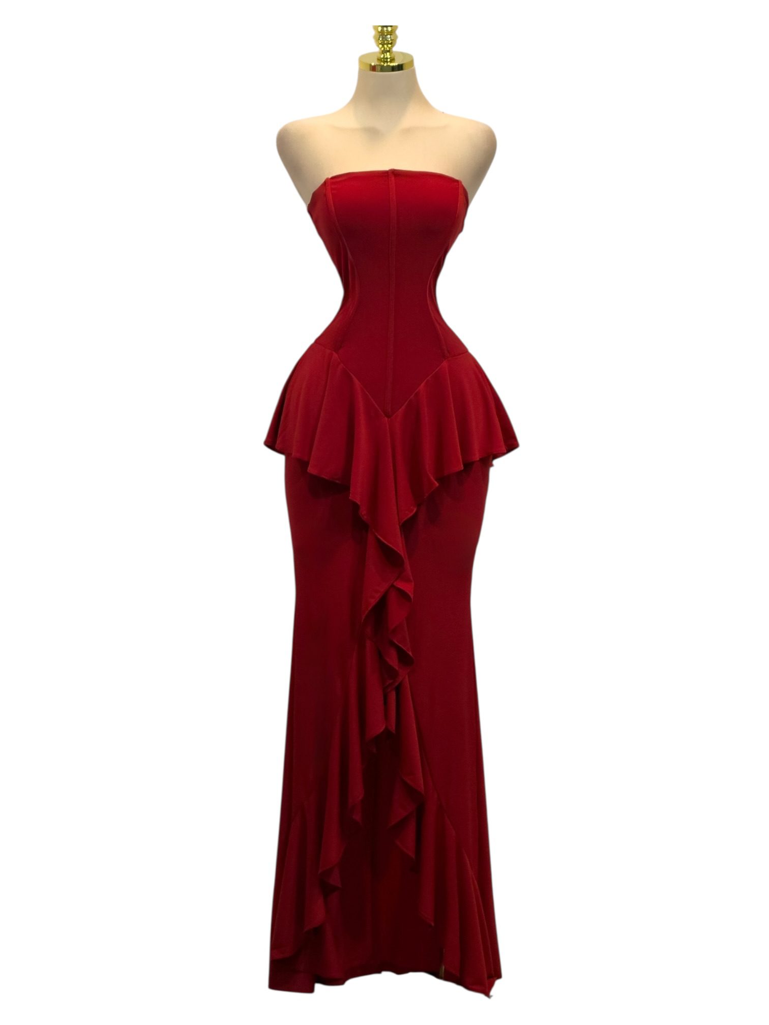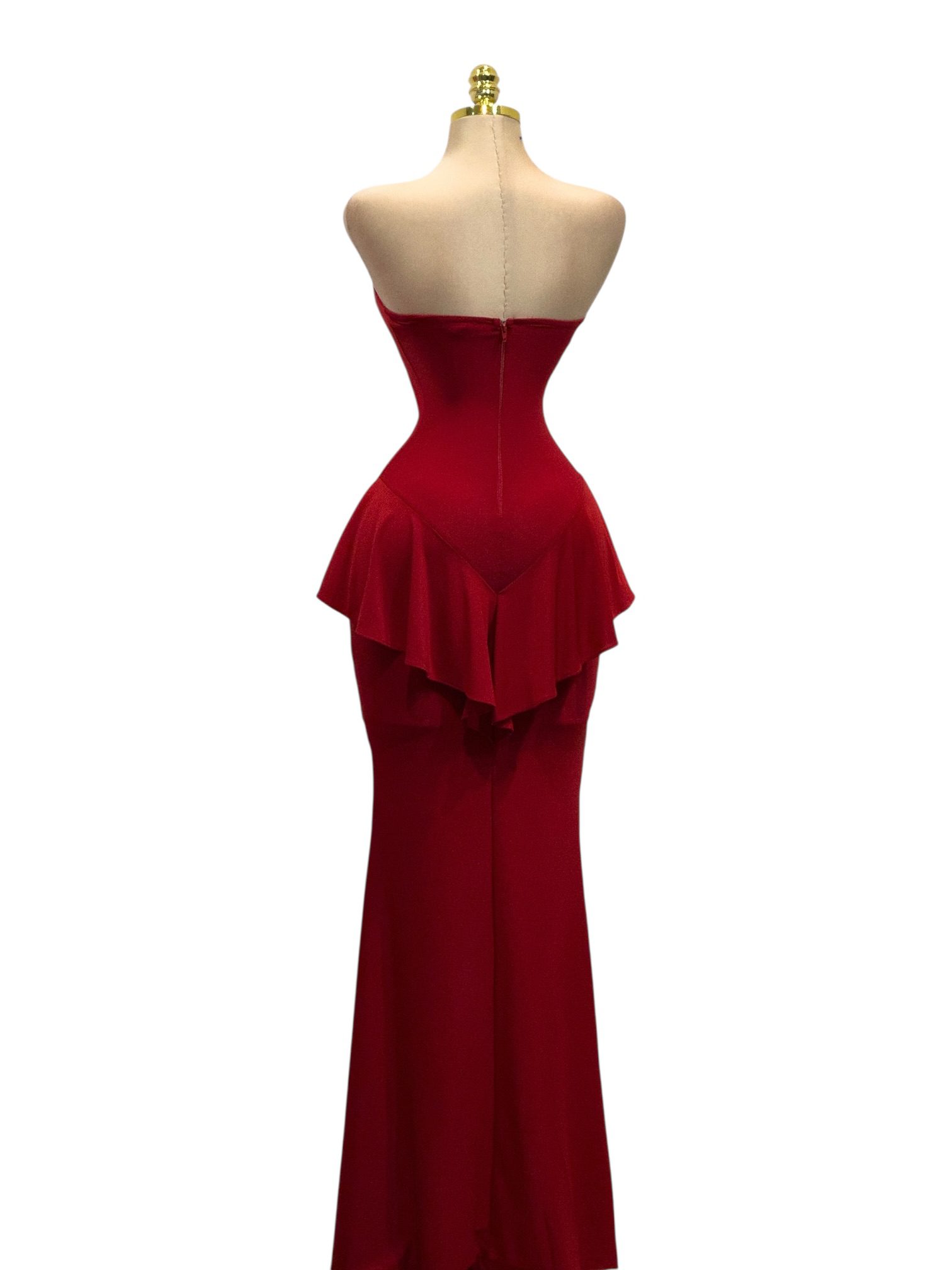 Vestido largo en color rojo con escote strapless y corte tipo corset que define la silueta. Diseño con peplum y volantes en cascada al frente que aportan movimiento y un toque dramático. Ideal para eventos formales o de noche.
