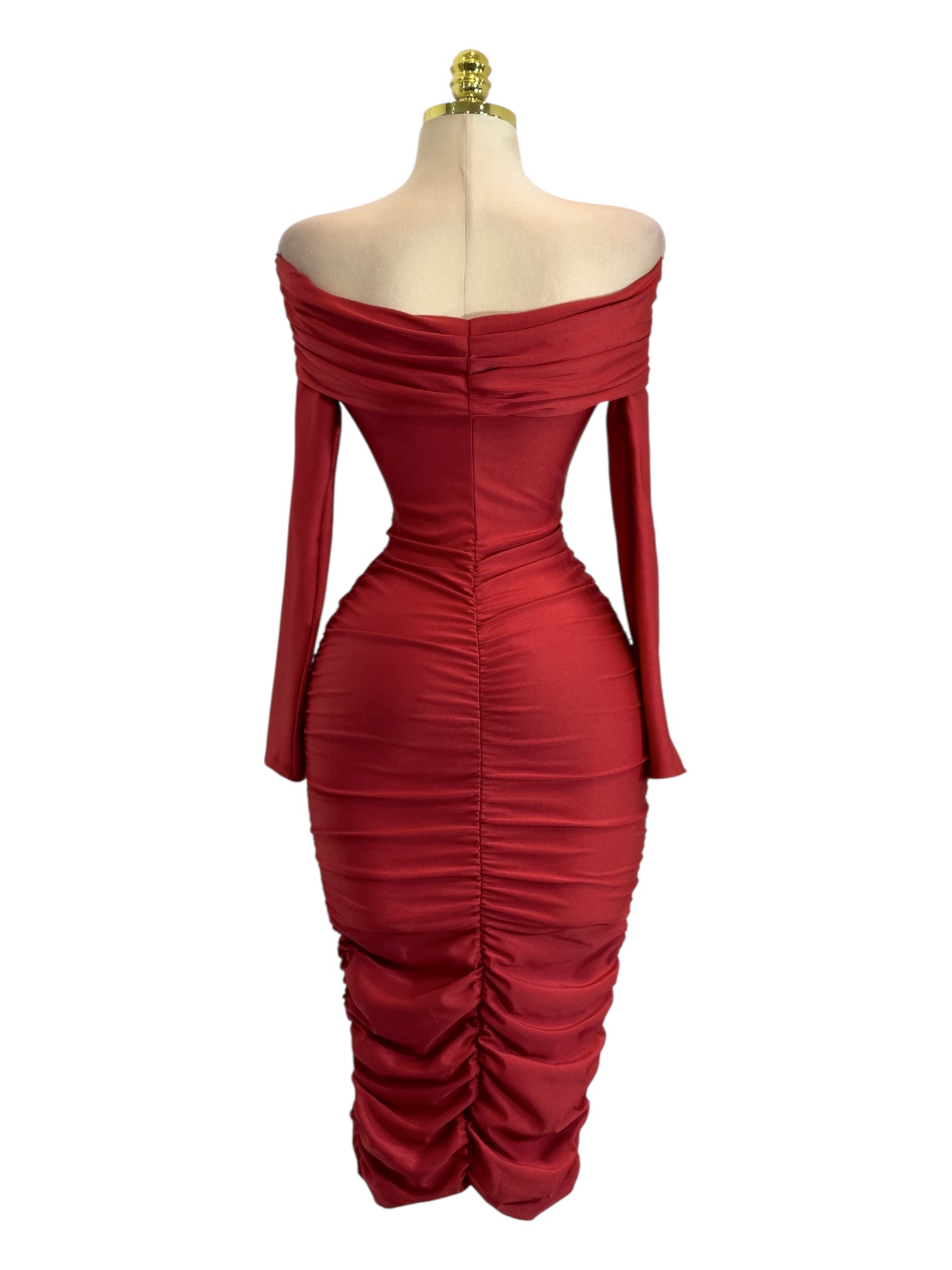 Vestido midi en tono rojo con diseño off shoulder que realza los hombros y aporta un acabado elegante y sensual. Presenta cuerpo entallado con frunces pronunciados que moldean la silueta de manera favorecedora, creando un efecto estilizado y sofisticado. Ideal para cenas, eventos especiales o noches donde busques lucir un look llamativo, femenino y de alto impacto visual.