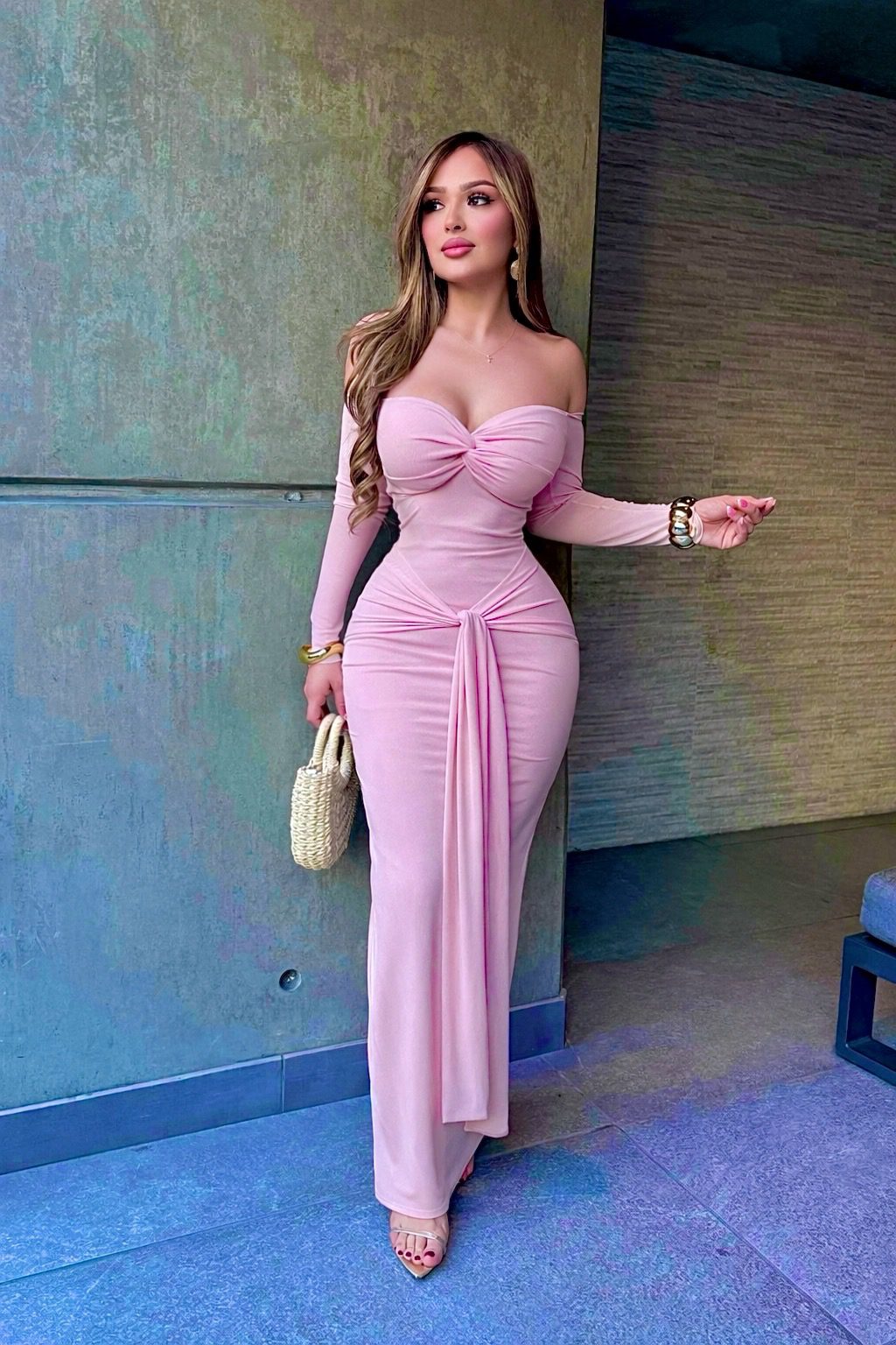 Vestido Rosa Con Drapeado En Busto Y Nudo Frontal