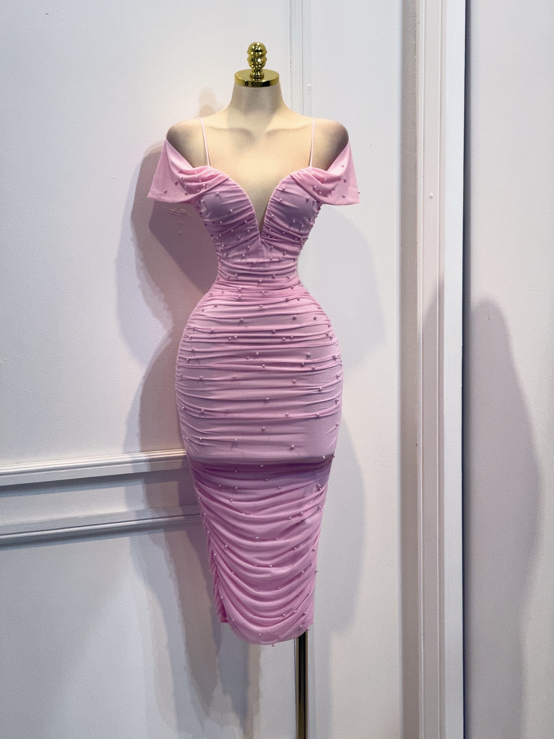 Vestido Rosa Con Escote Drapeado Y Detalles De Perlas
