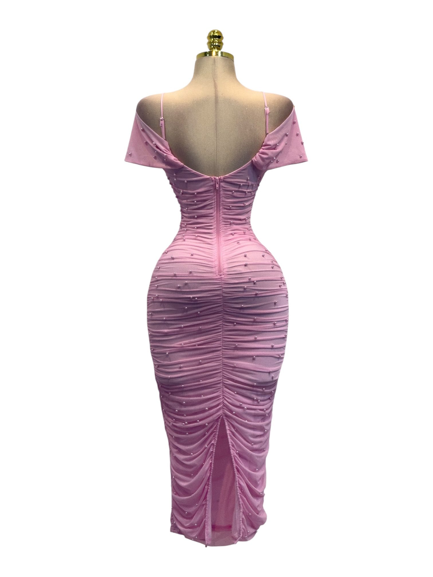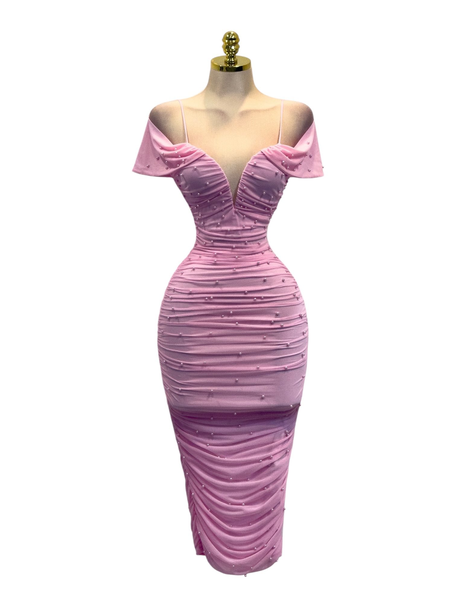 Vestido midi en color rosa con escote corazón y delicados tirantes finos. Presenta hombros caídos que aportan un toque romántico y femenino. Su diseño fruncido estiliza la silueta, mientras que las pequeñas aplicaciones tipo perla añaden brillo sutil y elegancia, ideal para eventos especiales o celebraciones.
