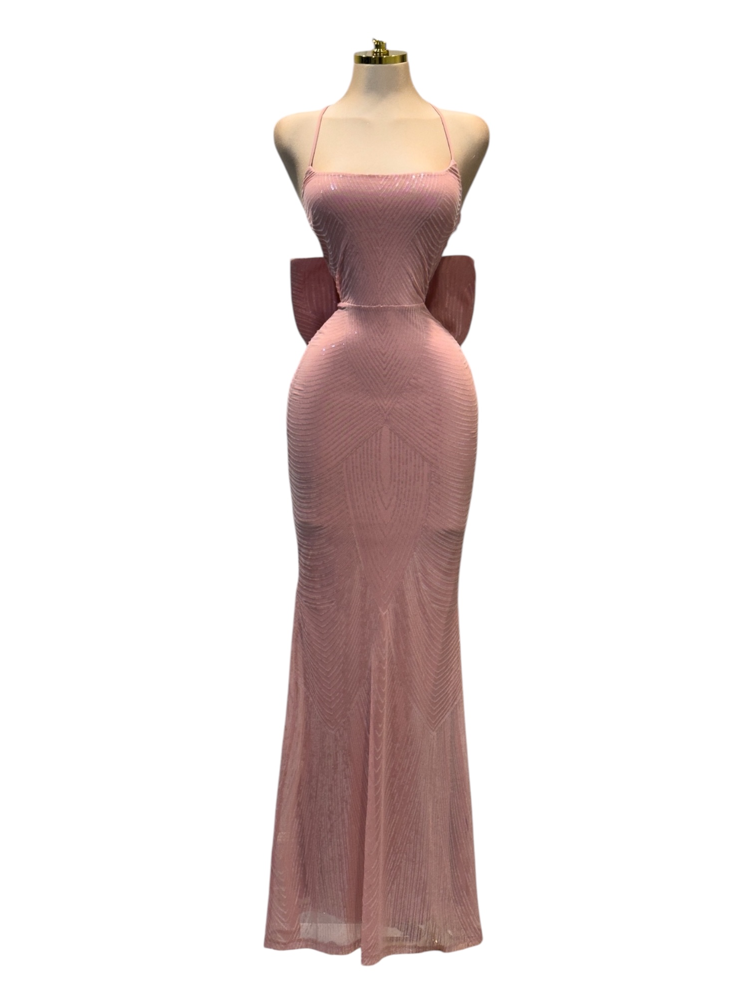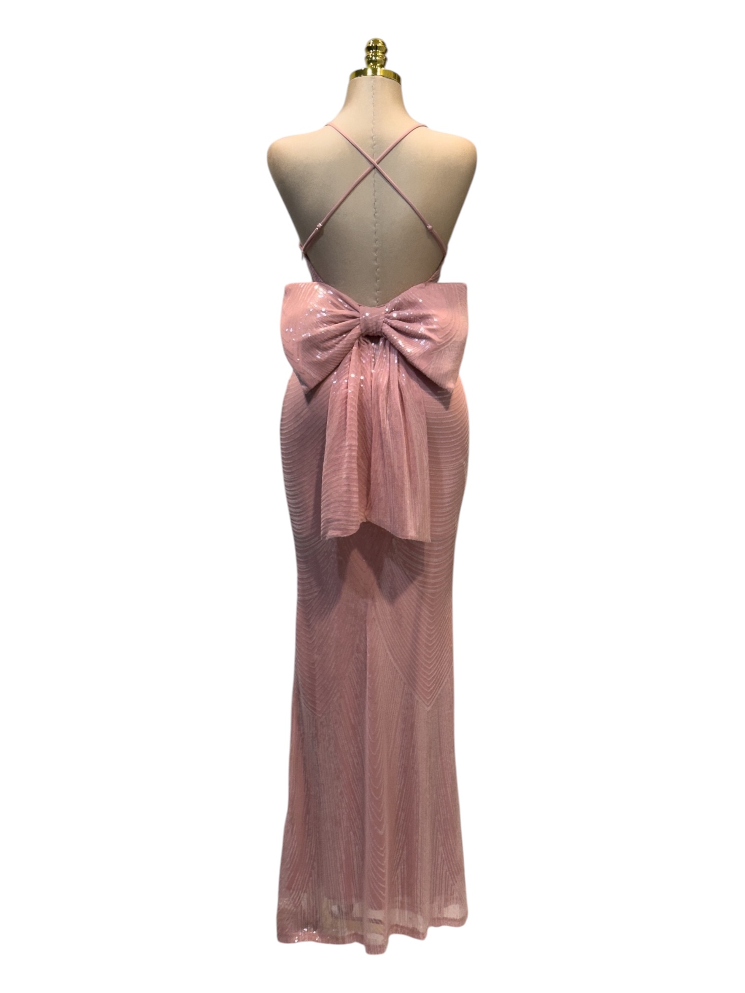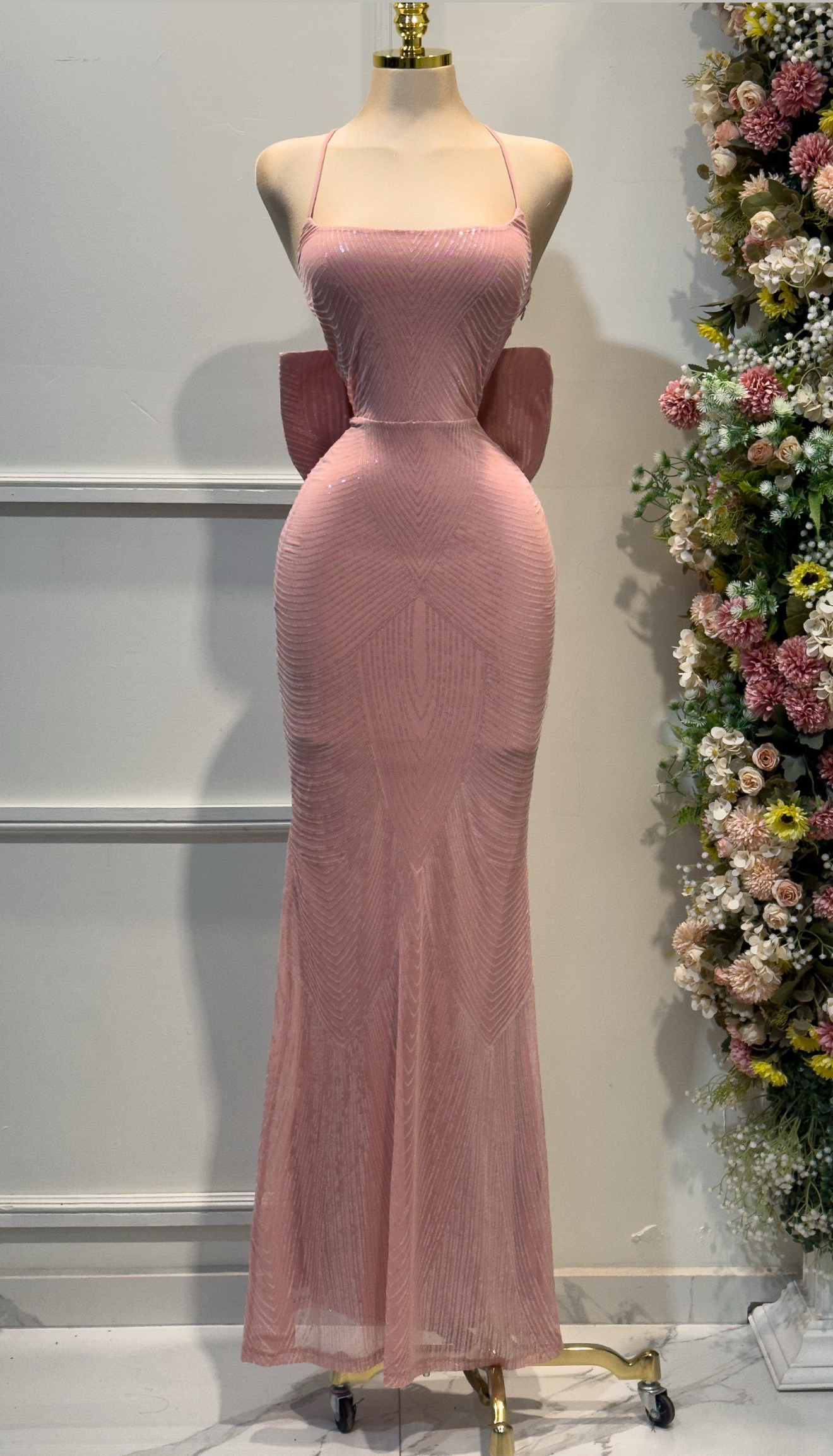 VESTIDO: LARGO ROSA CON LENTEJUELAS Y MOÑO ESTRUCTURADO