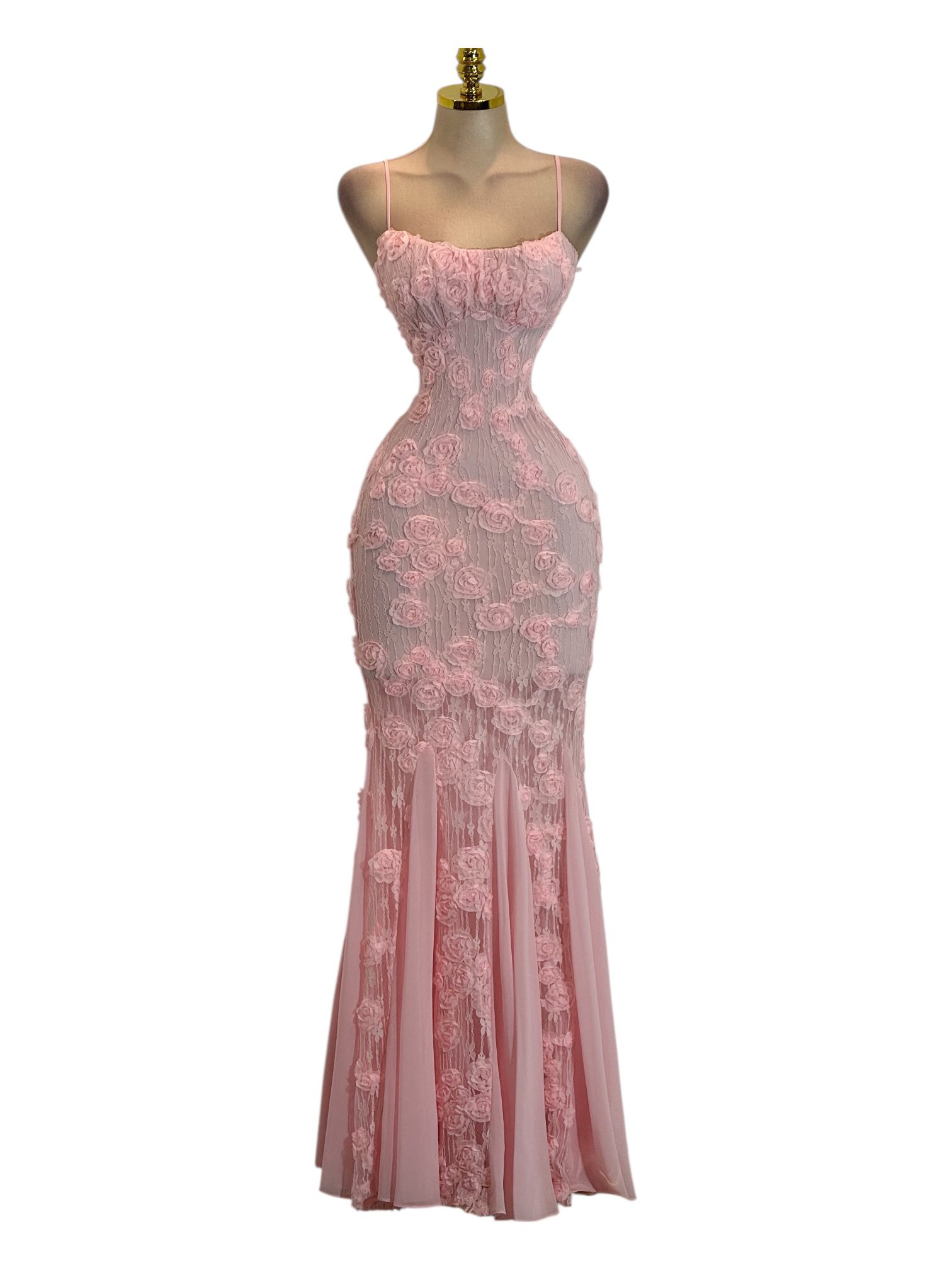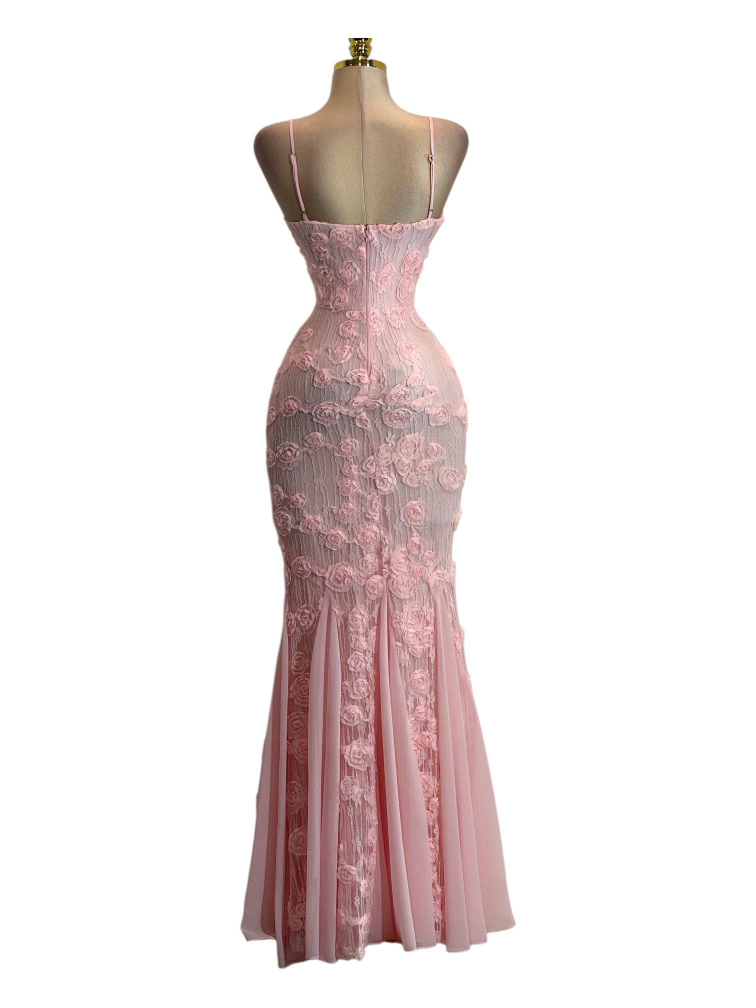 Vestido Rosa De Encaje Floral Con Tirantes Delgados Y Corte Sirena